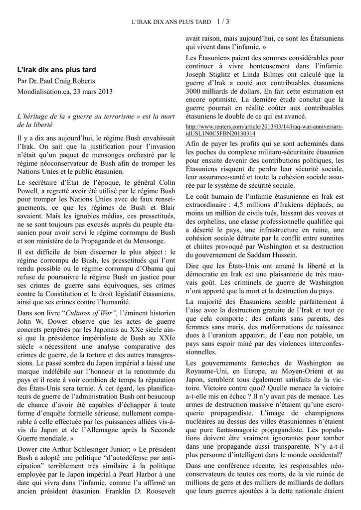 L’IRAK DIX ANS PLUS TARD 1/3 avait raison, mais aujourd’hui, ce sont les Étatsuniens qui vivent dans l’infamie. » L’Irak dix ans plus tard Par Dr. Paul Craig Roberts Mondialisation.ca, 23 mars 2013 L’héritage de la « guerre au terrorisme » est la mort de la liberté Il y a dix ans aujourd’hui, le régime Bush envahissait l’Irak. On sait que la justification pour l’invasion n’était qu’un paquet de mensonges orchestré par le régime néoconservateur de Bush afin de tromper les Nations Unies et le public étasunien. Le secrétaire d’État de l’époque, le général Colin Powell, a regretté avoir été utilisé par le régime Bush pour tromper les Nations Unies avec de faux renseignements, ce que les régimes de Bush et Blair savaient. Mais les ignobles médias, ces pressetitués, ne se sont toujours pas excusés auprès du peuple étasunien pour avoir servi le régime corrompu de Bush et son ministère de la Propagande et du Mensonge. Il est difficile de bien discerner le plus abject : le régime corrompu de Bush, les pressetitués qui l’ont rendu possible ou le régime corrompu d’Obama qui refuse de poursuivre le régime Bush en justice pour ses crimes de guerre sans équivoques, ses crimes contre la Constitution et le droit législatif étasuniens, ainsi que ses crimes contre l’humanité. Dans son livre “Cultures of War”, l’éminent historien John W. Dower observe que les actes de guerre concrets perpétrés par les Japonais au XXe siècle ainsi que la présidence impérialiste de Bush au XXIe siècle « nécessitent une analyse comparative des crimes de guerre, de la torture et des autres transgressions. Le passé sombre du Japon impérial a laissé une marque indélébile sur l’honneur et la renommée du pays et il reste à voir combien de temps la réputation des États-Unis sera ternie. À cet égard, les planificateurs de guerre de l’administration Bush ont beaucoup de chance d’avoir été capables d’échapper à toute forme d’enquête formelle sérieuse, nullement comparable à celle effectuée par les puissances alliées vis-àvis du Japon et de l’Allemagne après la Seconde Guerre mondiale. » Dower cite Arthur Schlesinger Junior; « Le président Bush a adopté une politique “d’autodéfense par anticipation” terriblement très similaire à la politique employée par le Japon impérial à Pearl Harbor à une date qui vivra dans l’infamie, comme l’a affirmé un ancien président étasunien. Franklin D. Roosevelt Les Étasuniens paient des sommes considérables pour continuer à vivre honteusement dans l’infamie. Joseph Stiglitz et Linda Bilmes ont calculé que la guerre d’Irak a couté aux contribuables étasuniens 3000 milliards de dollars. En fait cette estimation est encore optimiste. La dernière étude conclut que la guerre pourrait en réalité coûter aux contribuables étasuniens le double de ce qui est avancé. http://www.reuters.com/article/2013/03/14/iraq-war-anniversaryidUSL1N0C5FBN20130314 Afin de payer les profits qui se sont acheminés dans les poches du complexe militaro-sécuritaire étasunien pour ensuite devenir des contributions politiques, les Étasuniens risquent de perdre leur sécurité sociale, leur assurance-santé et toute la cohésion sociale assurée par le système de sécurité sociale. Le coût humain de l’infamie étasunienne en Irak est extraordinaire : 4,5 millions d’Irakiens déplacés, au moins un million de civils tués, laissant des veuves et des orphelins, une classe professionnelle qualifiée qui a déserté le pays, une infrastructure en ruine, une cohésion sociale détruite par le conflit entre sunnites et chiites provoqué par Washington et sa destruction du gouvernement de Saddam Hussein. Dire que les États-Unis ont amené la liberté et la démocratie en Irak est une plaisanterie de très mauvais goût. Les criminels de guerre de Washington n’ont apporté que la mort et la destruction du pays. La majorité des Étasuniens semble parfaitement à l’aise avec la destruction gratuite de l’Irak et tout ce que cela comporte : des enfants sans parents, des femmes sans maris, des malformations de naissance dues à l’uranium appauvri, de l’eau non potable, un pays sans espoir miné par des violences interconfessionnelles. Les gouvernements fantoches de Washington au Royaume-Uni, en Europe, au Moyen-Orient et au Japon, semblent tous également satisfaits de la victoire. Victoire contre quoi? Quelle menace la victoire a-t-elle mis en échec ? Il n’y avait pas de menace. Les armes de destruction massive n’étaient qu’une escroquerie propagandiste. L’image de champignons nucléaires au dessus des villes étasuniennes n’étaient que pure fantasmagorie propagandiste. Les populations doivent être vraiment ignorantes pour tomber dans une propagande aussi transparente. N’y a-t-il plus personne d’intelligent dans le monde occidental? Dans une conférence récente, les responsables néoconservateurs de toutes ces morts, de la vie ruinée de millions de gens et des milliers de milliards de dollars que leurs guerres ajoutées à la dette nationale étaient L’IRAK DIX ANS PLUS TARD sans remords et plein de justifications. Alors que Washington regarde à l’étranger pour tuer le mal, le mal se concentre à Washington même. http://nationalinterest.org/blog/paul-pillar/still-peddling-iraqwar-myths-ten-years-later-8227 Les criminels de guerre étasuniens demeurent intouchés. On les paie d’énormes sommes d’argent pour faire des discours sur la façon dont les Étasuniens apportent la liberté et la démocratie au monde entier en envahissant, bombardant et en assassinant les gens. Le tribunal des crimes de guerre n’a pas émis de mandats d’arrêt. Le département d’État étasunien, qui continue à chasser les criminels de guerre nazis, n’a pas fait enlever les criminels de guerre étasuniens pour les conduire devant le Tribunal de la Haye. Parmi 