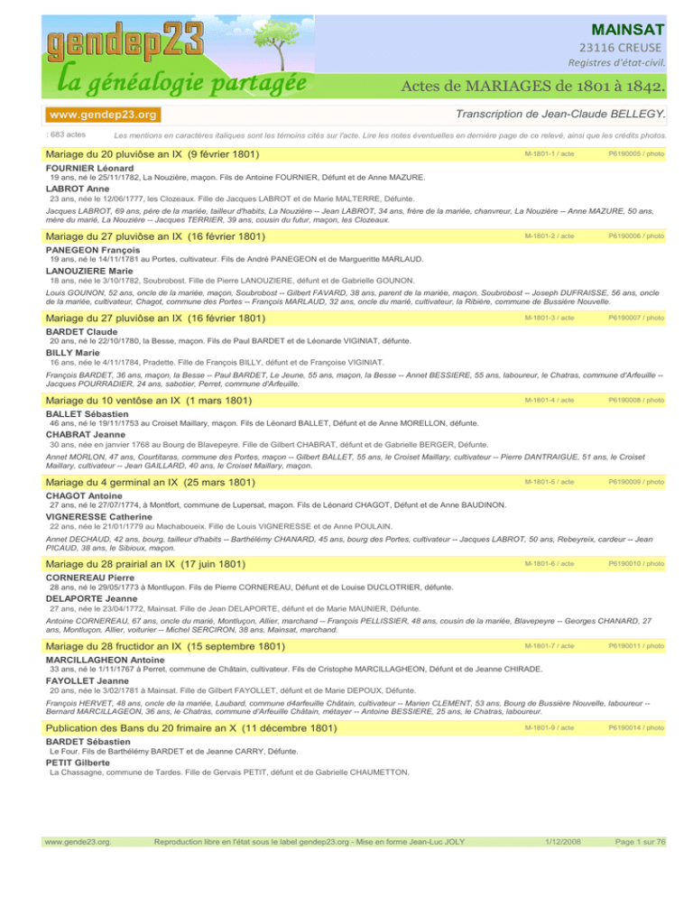 MAINSAT 23116 CREUSE Registres d'état-civil. Actes de MARIAGES de 1801 à 1842. www.gendep23.org : 683 actes Transcription de Jean-Claude BELLEGY. Les mentions en caractères italiques sont les témoins cités sur l'acte. Lire les notes éventuelles en dernière page de ce relevé, ainsi que les crédits photos. Mariage du 20 pluviôse an IX (9 février 1801) M-1801-1 / acte P6190005 / photo FOURNIER Léonard 19 ans, né le 25/11/1782, La Nouzière, maçon. Fils de Antoine FOURNIER, Défunt et de Anne MAZURE. LABROT Anne 23 ans, née le 12/06/1777, les Clozeaux. Fille de Jacques LABROT et de Marie MALTERRE, Défunte. Jacques LABROT, 69 ans, père de la mariée, tailleur d'habits, La Nouzière -- Jean LABROT, 34 ans, frère de la mariée, chanvreur, La Nouzière -- Anne MAZURE, 50 ans, mère du marié, La Nouzière -- Jacques TERRIER, 39 ans, cousin du futur, maçon, les Clozeaux. Mariage du 27 pluviôse an IX (16 février 1801) M-1801-2 / acte P6190006 / photo PANEGEON François 19 ans, né le 14/11/1781 au Portes, cultivateur. Fils de André PANEGEON et de Margueritte MARLAUD. LANOUZIERE Marie 18 ans, née le 3/10/1782, Soubrobost. Fille de Pierre LANOUZIERE, défunt et de Gabrielle GOUNON. Louis GOUNON, 52 ans, oncle de la mariée, maçon, Soubrobost -- Gilbert FAVARD, 38 ans, parent de la mariée, maçon, Soubrobost -- Joseph DUFRAISSE, 56 ans, oncle de la mariée, cultivateur, Chagot, commune des Portes -- François MARLAUD, 32 ans, oncle du marié, cultivateur, la Ribière, commune de Bussière Nouvelle. Mariage du 27 pluviôse an IX (16 février 1801) M-1801-3 / acte P6190007 / photo BARDET Claude 20 ans, né le 22/10/1780, la Besse, maçon. Fils de Paul BARDET et de Léonarde VIGINIAT, défunte. BILLY Marie 16 ans, née le 4/11/1784, Pradette. Fille de François BILLY, défunt et de Françoise VIGINIAT. François BARDET, 36 ans, maçon, la Besse -- Paul BARDET, Le Jeune, 55 ans, maçon, la Besse -- Annet BESSIERE, 55 ans, laboureur, le Chatras, commune d'Arfeuille -Jacques POURRADIER, 24 ans, sabotier, Perret, commune d'Arfeuille. Mariage du 10 ventôse an IX (1 mars 1801) M-1801-4 / acte P6190008 / photo BALLET Sébastien 46 ans, né le 19/11/1753 au Croiset Maillary, maçon. Fils de Léonard BALLET, Défunt et de Anne MORELLON, défunte. CHABRAT Jeanne 30 ans, née en janvier 1768 au Bourg de Blavepeyre. Fille de Gilbert CHABRAT, défunt et de Gabrielle BERGER, Défunte. Annet MORLON, 47 ans, Courtitaras, commune des Portes, maçon -- Gilbert BALLET, 55 ans, le Croiset Maillary, cultivateur -- Pierre DANTRAIGUE, 51 ans, le Croiset Maillary, cultivateur -- Jean GAILLARD, 40 ans, le Croiset Maillary, maçon. Mariage du 4 germinal an IX (25 mars 1801) M-1801-5 / acte P6190009 / photo CHAGOT Antoine 27 ans, né le 27/07/1774, à Montfort, commune de Lupersat, maçon. Fils de Léonard CHAGOT, Défunt et de Anne BAUDINON. VIGNERESSE Catherine 22 ans, née le 21/01/1779 au Machaboueix. Fille de Louis VIGNERESSE et de Anne POULAIN. Annet DECHAUD, 42 ans, bourg, tailleur d'habits -- Barthélémy CHANARD, 45 ans, bourg des Portes, cultivateur -- Jacques LABROT, 50 ans, Rebeyreix, cardeur -- Jean PICAUD, 38 ans, le Sibioux, maçon. Mariage du 28 prairial an IX (17 juin 1801) M-1801-6 / acte P6190010 / photo CORNEREAU Pierre 28 ans, né le 29/05/1773 à Montluçon. Fils de Pierre CORNEREAU, Défunt et de Louise DUCLOTRIER, défunte. DELAPORTE Jeanne 27 ans, née le 23/04/1772, Mainsat. Fille de Jean DELAPORTE, défunt et de Marie MAUNIER, Défunte. Antoine CORNEREAU, 67 ans, oncle du marié, Montluçon, Allier, marchand -- François PELLISSIER, 48 ans, cousin de la mariée, Blavepeyre -- Georges CHANARD, 27 ans, Montluçon, Allier, voiturier -- Michel SERCIRON, 38 ans, Mainsat, marchand. Mariage du 28 fructidor an IX (15 septembre 1801) M-1801-7 / acte P6190011 / photo MARCILLAGHEON Antoine 33 ans, né le 1/11/1767 à Perret, commune de Châtain, cultivateur. Fils de Cristophe MARCILLAGHEON, Défunt et de Jeanne CHIRADE. FAYOLLET Jeanne 20 ans, née le 3/02/1781 à Mainsat. Fille de Gilbert FAYOLLET, défunt et de Marie DEPOUX, Défunte. François HERVET, 48 ans, oncle de la mariée, Laubard, commune d4arfeuille Châtain, cultivateur -- Marien CLEMENT, 53 ans, Bourg de Bussière Nouvelle, laboureur -Bernard MARCILLAGEON, 36 ans, le Chatras, commune d'Arfeuille Châtain, métayer -- Antoine BESSIERE, 25 ans, le Chatras, laboureur. Publication des Bans du 20 frimaire an X (11 décembre 1801) M-1801-9 / acte P6190014 / photo BARDET Sébastien Le Four. Fils de Barthélémy BARDET et de Jeanne CARRY, Défunte. PETIT Gilberte La Chassagne, commune de Tardes. Fille de Gervais PETIT, défunt et de Gabrielle CHAUMETTON. www.gende23.org. Reproduction libre en l'état sous le label gendep23.org - Mise en forme Jean-Luc JOLY 1/12/2008 Page 1 sur76 76 Page 1 sur MAINSAT - 23116 -- Actes de MARIAGES de 1801 à 1842. Les mentions en caractères italiques sont les témoins cités sur l'acte. Lire les notes éventuelles en dernière page de ce relevé. Publication des Bans du 20 frimaire an X (11 décembre 1801) M-1801-8 / acte P6190014 / photo BARDET Barthélémy Maçon, le Four. Veuf de Jeanne CARRY. CHAUMETTON Gabrielle La Chassagne, commune de Tardes. Veuve de Gervais PETIT. Mariage du 16 nivôse an X (6 janvier 1802) P6190024 / photo BARDET Barthélémy Maçon, le Four, né au Fraisse, commune de Sannat. Fils de Thomas BARDET, Défunt, maçon, le Fraisse et de Anne COULAUD, Défunte. Veuf de Jeanne CARRY. CHAUMETTON Gabrielle La Chassagne, commune de Tardes, née à Rougnat. Fille de Antoine CHAUMETTON, Défunt, Beauregard, commune du Tromps et de Jeanne BARDET, Défunte. Veuve de Gervais PETIT. Jean CHAUMETTON, Frère de la mariée, meunier, moulin de Beauregard, commune du tromps, 53 ans -- Louis PARRY, Cousin du marié, Soubrobost, maçon, 45 ans -Léonard BERGER, Voisin du marié, Labrot, cultivateur, 36 ans -- Henry François ROUDAIRE, Bourg, propriétaire, 30 ans. Mariage du 16 nivôse an X (6 j