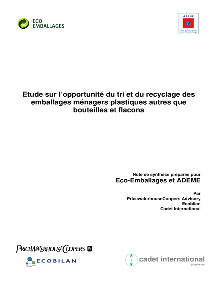 Etude sur l’opportunité du tri et du recyclage des emballages ménagers plastiques autres que bouteilles et flacons Note de synthèse préparée pour Eco-Emballages et ADEME Par PricewaterhouseCoopers Advisory Ecobilan Cadet International cadet international groupe setec Etude sur l’opportunité du tri et du recyclage des emballages ménagers plastiques autres que bouteilles et flacons SOMMAIRE SOMMAIRE .........................................................................................................................................2 SECTION I - INTRODUCTION GENERALE ...................................................................................................3 1 2 3 4 Contexte de l’étude ....................................................................................................................................3 Objectifs de l’étude ....................................................................................................................................3 Comité de pilotage de l’étude ...................................................................................................................4 Périmètre de l’étude et principaux postulats ..........................................................................................4 SECTION II – VALORISATION DES DECHETS D’EMBALLAGES PLASTIQUES MENAGERS ................................7 5 Présentation du gisement de déchets d’emballages plastiques ménagers ........................................7 6 Une partie des emballages plastiques autres que bouteilles et flacons déjà collectée sélectivement .....................................................................................................................................................8 7 Les modes de valorisations envisageables ............................................................................................9 SECTION III – FAISABILITE DE L’EXTENSION TOTALE DES CONSIGNES DE TRI DES EMBALLAGES PLASTIQUES ..........................................................................................................................................................10 8 Elaboration du scénario de référence....................................................................................................10 8.1 Le choix des emballages régénérés .................................................................................................10 8.2 La détermination des principaux paramètres de modélisation .........................................................10 9 Présentation des résultats et enseignements de l’étude.....................................................................12 9.1 Scénario étudié .................................................................................................................................12 9.2 Sur le plan technique ........................................................................................................................13 9.3 Sur le plan économique ....................................................................................................................14 9.4 Sur le plan social ...............................................................................................................................16 9.5 Sur le plan environnemental .............................................................................................................16 SECTION IV – FACTEURS DE RISQUES ...................................................................................................20 10 Taux de diversion .................................................................................................................................20 11 A l’étape de tri.......................................................................................................................................22 11.1 Automatisation du parc de centres de tri actuel................................................................................22 11.2 Ouverture partielle des consignes de tri n’incluant pas les emballages plastiques souples ............23 11.3 Contrainte organisationnelle .............................................................................................................24 12 A l’étape de valorisation ......................................................................................................................24 12.1 Absence de régénération du PS .......................................................................................................24 12.2 Incertitudes liées à l’existence de débouchés et au prix de vente des MPS ....................................24 12.3 Mise en place d’une filière de valorisation énergétique de type CSR ..............................................25 SECTION V - CONCLUSIONS .................................................................................................................28 I. ANNEXE I– TYPOLOGIE CENTRES DE TRI UTILISEE DANS LE CADRE DE CETTE ETUDE ........................30 PwC Ecobilan - Cadet International 8 décembre 2009 2/30 Etude sur l’opportunité du tri et du recyclage des emballages ménagers plastiques autres que bouteilles et flacons Section I : Introduction générale SECTION I - INTRODUCTION GENERALE 1 Contexte de l’étude Le choix de restreindre la collecte sélective des emballages plastiques ménagers aux seules bouteilles et flacons a été fait par Eco-Emballages à l’origine du système en 1993. Depuis 15 ans, très régulièrement et en particulier à l’occasion des ré-agréments, les différentes parties prenantes s’interrogent sur le bien fondé de faire évoluer cette consigne de tri. 1 En 2001, Eco-Emballages a publié une étude environnementale et économique complète qui montrait que l’éco-efficacité du recyclage diminuait significativement en cas d’élargissement des consignes de tri. Une 2 étude réalis