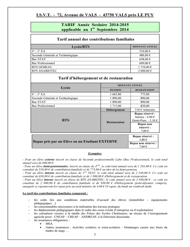 I.S.V.T. - 72, Avenue de VALS - 43750 VALS près LE PUY TARIF Année Scolaire 2014-2015 applicable au 1er Septembre 2014 Tarif annuel des contributions familiales Lycée/BTS MONTANT ANNUEL 4° - 3° EA Seconde Générale et Technologique Bac STAV Bac Professionnel BTS GEMEAU BTS ANABIOTEC 510,00 € 480,00 € 658,00 € 690,00 € 1 734,00 € 2 000,00 € Tarif d'hébergement et de restauration MONTANT ANNUEL Lycée 4° - 3° EA Seconde Générale et Technologique Bac STAV Bac Professionnel BTS PENSION DEMI-PENSION 1 665,00 1 890,00 1 890,00 1 715,00 Hébergement 775,00 890,00 890,00 820,00 310 € /trimestre Repas réservé : Interne : 4,90 € Demi-Pens. : 5,10 € Repas non réservé : 7,60 € Restauration Repas pris par un Elève ou un Etudiant EXTERNE Repas réservé : 5,80 € Repas non réservé : 7,60 € Exemples: - Pour un élève externe inscrit en classe de Seconde professionnelle Labo (Bac Professionnel), le coût total annuel sera de 690,00 €. - Pour un élève demi-pensionnaire, inscrit en classe de 4ème, le coût total annuel sera de 1 285,00 €. Ce coût est constitué de 510,00 € de contribution familiale et de 775,00 € au titre de la demi-pension. - Pour un élève interne inscrit en classe de 1ère STAV, le coût total annuel sera de 2 548,00 €. Ce coût est constitué de 658,00 € de contribution familiale et de 1 890,00 € d'hébergement et de restauration. - Pour un élève interne inscrit en classe de BTS ANABIOTEC, le coût annuel sera de 2 930,00 € ; ce coût est constitué de 2 000,00 € de contribution familiale et de 930,00 € d'hébergement (petit-déjeuner compris), auxquels se rajouteront les repas pris au tarif unitaire de 4,90 € (9 repas, du lundi au vendredi midi). Le tarif des contributions familiales comprend : - les coûts liés aux conditions matérielles d’accueil des élèves (immobilier – équipements pédagogiques…) les consommables nécessaires à la réalisation des travaux pratiques les déplacements pédagogiques dans le cadre des cours (visite d’entreprise ou d’exploitation) les cotisations versées à la tutelle des Frères des Ecoles Chrétiennes, au réseau de l’enseignement agricole privé : CNEAP – CREAP – ANDREAP, à la Direction diocésaine les assurances obligatoires : • MSA • Autres assurances : Activités scolaires et extra-scolaires - Dommages causés aux biens du maître de stage … 1 Ce tarif ne comprend pas : - - Les voyages scolaires qui font l’objet d’un budget spécifique Les déplacements pour les examens (transport + repas), proposés et organisés par l’I.S.V.T. L’hébergement et les repas pris pendant les périodes de stage Les photocopies qui peuvent être faites par les élèves ou étudiants, après attribution d’un code personnel. Elles seront facturées au tarif de 0,05 € la photocopie en Noir et Blanc, et de 0,55 € la photocopie en couleur Le renouvellement de la carte de SELF en cas de perte Les réalisations individuelles dans le cadre des ateliers bois et fer que les élèves souhaitent conserver Les dégâts occasionnés par les élèves Les coûts d’hébergement et de restauration sont calculés sur la durée d’un cycle. La facturation tient compte des absences de l’établissement pour motif de stage en entreprise ou exploitation. Paiement des factures : La contribution familiale, la pension ou demi-pension, font l’objet de trois factures d’un même montant, qui vous seront adressées aux échéances suivantes: - échéance du 1er trimestre : facturation vers le 20 octobre, - échéance du 2ème trimestre : facturation vers le 31 janvier, - échéance du 3ème trimestre : facturation vers le 15 mai. Pour les BTS, les repas seront facturés à la fin des mois de décembre, mars et vers le 20 juillet. Les frais de scolarité sont payables au comptant, à réception de facture. Cependant, vous pouvez opter pour le prélèvement automatique ; dans ce cas, le Document « Mandat de Prélèvement SEPA » devra être complété, signé et nous être renvoyé accompagné d’un RIB. Les prélèvements s'effectueront le 10 de chaque mois, à partir du mois de novembre jusqu’au mois de juillet. Le décompte des échéances mensuelles vous sera adressé avec la 1ère facture. Si votre enfant est boursier, les échéances seront minorées du montant de la bourse obtenue au titre de l’année scolaire en cours. Défaut de règlement : En cas de non paiement des sommes dues à l’I.S.V.T. et après deux relances infructueuses : - si l’élève est encore scolarisé à l’ISVT : il pourra suivre ses cours et bénéficier du service d’enseignement. Il ne sera plus autorisé à prendre ses repas et à être hébergé sur l’établissement. Une procédure contentieuse pourra être déclenchée pour le recouvrement des sommes dues ; - si l’élève a quitté l’établissement : une procédure contentieuse sera mise en œuvre. AUTRES ELEMENTS Réduction: Une remise de 5% sur les contributions familiales et la pension ou demi-pension est accordée pour chaque enfant à partir du 2ème enfant. Changement de régime – Départ en cours d’année ou non rentrée de l’élève : Les arrhes versées à l’établissement lors de l’inscription lui sont acquises en cas de non rentrée en septembre ; seul l’échec à l’examen préalable à l’entrée en BTS impliquera le remboursement. En cas de changement de régime, ou de départ en cours d’année scolaire, une réduction de la facturation sera opérée au prorata du nombre de semaines d’absence, avec un délai de carence de deux semaines. Pour une arrivée en cours de trimestre, la facturation sera réalisée au prorata du temps de présence. Modification du régime de l’élève : Une demande écrite devra être adressée à la Direction. Absences prolongées – Réduction de pension : La facturation peut être adaptée dans les conditions suivantes : - la réduction de pension devra être sol