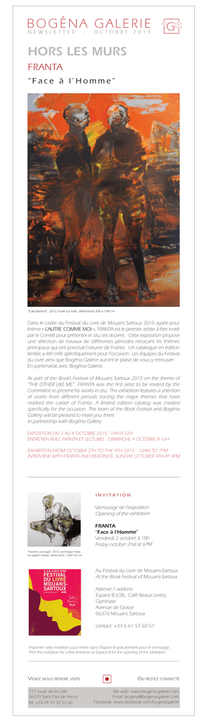 BOGÉNA GALERIE FRANTA “Face à l’Homme” "Fukushima II”, 2012, huile sur toile, dimensions 206 x 148 cm Dans le cadre du Festival du Livre de Mouans Sartoux 2015 ayant pour thème « L’AUTRE COMME MOI », FRANTA est le premier artiste à être invité par le Comité pour présenter in situ ses œuvres. Cette exposition propose une sélection de travaux de différentes périodes retraçant les thèmes principaux qui ont ponctué l’oeuvre de Franta. Un catalogue en édition limitée a été créé spécifiquement pour l’occasion. Les équipes du Festival du Livre ainsi que Bogéna Galerie auront le plaisir de vous y retrouver. En partenariat avec Bogéna Galerie. As part of the Book’s Festival of Mouans Sartoux 2015 on the theme of “THE OTHER LIKE ME”, FRANTA was the first artist to be invited by the Committee to present his works in situ. This exhibition features a selection of works from different periods tracing the major themes that have marked the career of Franta. A limited edition catalog was created specifically for the occasion. The team of the Book Festival and Bogéna Gallery will be pleased to meet you there. In partnership with Bogéna Gallery. EXPOSITION DU 2 AU 4 OCTOBRE 2015 - 10H À 22H ENTRETIEN AVEC FRANTA ET LECTURES : DIMANCHE 4 OCTOBRE À 16H EXHIBITION FROM OCTOBER 2TH TO THE 4TH 2015 - 10AM TO 7PM INTERVIEW WITH FRANTA AND READINGS: SUNDAY OCTOBER 4TH AT 4PM INVITATION Vernissage de l’exposition Opening of the exhibition FRANTA “Face à l’Homme” Vendredi 2 octobre à 18h Friday october 2nd at 6PM “Homme accroupi”, 2015, technique mixte sur papier entoilé, dimensions :120x120 cm Au Festival du Livre de Mouans-Sartoux At the Book Festival of Mouans-Sartoux Adresse / address: Espace B (CBL: Café Beaux Livres) Gymnase Avenue de Grasse 06370 Mouans Sartoux contact: +33 6 61 57 60 57 Imprimer cette invitation pour entrer dans l’Espace B gratuitement pour le vernissage. Print this invitation for a free entrance at Espace B for the opening of the exhibition. VENEZ NOUS RENDRE VISITE 777 route de la Colle 06570 Saint Paul de Vence tel: +33 04 93 32 53 60 OU RESTEZ CONNECTÉ Site web: www.bogena-galerie.com Email: [email protected] Facebook: www.facebook.com/bogenagalerie