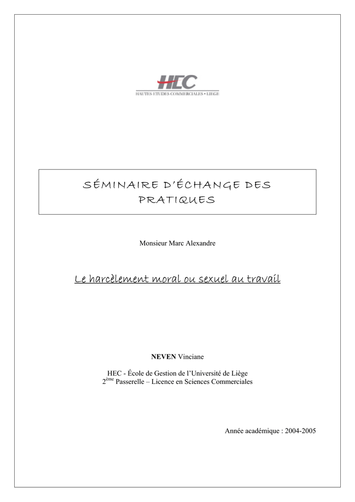 SÉMINAIRE D’ÉCHANGE DES PRATIQUES Monsieur Marc Alexandre Le harcèlement moral ou sexuel au travail NEVEN Vinciane HEC - École de Gestion de l’Université de Liège 2 Passerelle – Licence en Sciences Commerciales ème Année académique : 2004-2005 SEMINAIRE D’ECHANGE DES PRATIQUES Professeur : M. Alexandre Tables des matières Introduction ........................................................................................................................................ 3 1. Définition du harcèlement moral ou sexuel au travail ............................................................. 1.1. Le harcèlement moral au travail .............................................................................................. 1.2. Le harcèlement sexuel au travail ............................................................................................. 1.3. Comportement non visé par la définition ................................................................................. 3 3 4 5 2. Identification du harceleur et de ses actes ............................................................................... 2.1. Les actes du harceleur ............................................................................................................ 2.2. Les différentes personnalités du harceleur .............................................................................. 2.3. Identification de la victime ........................................................................................................ 5 5 5 6 3. Théories explicatives du harcèlement moral ........................................................................... 3.1. Les variables cognitives relatives à la dynamique de groupe ................................................. 3.2. Les variables individuelles ....................................................................................................... 3.3. Les variables contextuelles et organisationnelles ................................................................... 3.4. La culture ................................................................................................................................. 3.5. La structure .............................................................................................................................. 3.6. La stratégie .............................................................................................................................. 3.7. Les variables en interaction ..................................................................................................... 6 6 6 7 7 7 7 7 4. Théories explicatives du harcèlement sexuel .......................................................................... 4.1. Le modèle biologique naturel .................................................................................................. 4.2 La théorie du débordement du rôle sexuel .............................................................................. 4.3. La théorie de la perception erronée ......................................................................................... 4.4. La théorie du pouvoir et de la dominance ............................................................................... 4.5. La théorie de l’excitation sexuelle ............................................................................................ 7 7 8 8 8 8 5. Les conséquences du harcèlement moral ou sexuel au travail ............................................. 5.1. Conséquences du harcèlement moral ou sexuel au travail ..................................................... 5.2. Conséquences du harcèlement sexuel sur la victime ............................................................. 5.3. Point de vue professionnel ...................................................................................................... 5.4. Point de vue organisationnel ................................................................................................... 5.5. Contexte global ........................................................................................................................ 8 8 8 9 9 9 6. Prévention et protection ............................................................................................................. 6.1. Les objectifs de la loi ............................................................................................................... 6.2. Les mesures de prévention prévues par la loi ......................................................................... 6.3. Les mesures de protection prévues par la loi .......................................................................... 6.4. Les mesures de protection de l’employeur .............................................................................. 9 9 9 10 10 7. Concrètement, que faire ? .......................................................................................................... 7.1. La procédure interne ................................................................................................................ 7.2. Plainte au Contrôle du bien-être au travail .............................................................................. 7.3. Plainte au tribunal .................................................................................................................... 10 10 10 11 8. Les différents acteurs du processus de prévention et de protection .................................... 8.1. La personne de confiance ....................................................................................................... 8.2. Le conseiller en prévention médecin du travail ....................................................................... 8.3. Le médecin du travail ............................................................................................................... 8.4. Le Contrôle du bien-être au travail ........