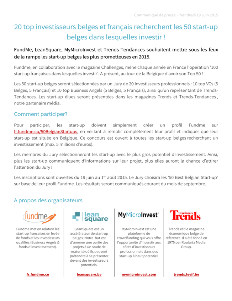 Communiqué de presse - Vendredi 19 juin 2015 20 top investisseurs belges et français recherchent les 50 start-up belges dans lesquelles investir ! FundMe, LeanSquare, MyMicroInvest et Trends-Tendances souhaitent mettre sous les feux de la rampe les start-up belges les plus prometteuses en 2015. Fundme, en collaboration avec le magazine Challenges, mène chaque année en France l’opération ‘100 start-up françaises dans lesquelles investir’. A présent, au tour de la Belgique d’avoir son Top 50 ! Les 50 start-up belges seront sélectionnées par un Jury de 20 investisseurs professionnels : 10 top VCs (5 Belges, 5 Français) et 10 top Business Angels (5 Belges, 5 Français), ainsi qu’un représentant de TrendsTendances. Les start-up élues seront présentées dans les magazines Trends et Trends-Tendances , notre partenaire média. Comment participer? Pour participer, les start-up doivent simplement créer un profil Fundme sur fr.fundme.co/50BelgianStartups, en veillant à remplir complètement leur profil et indiquer que leur start-up est située en Belgique. Ce concours est ouvert à toutes les start-up belges recherchant un investissement (max. 5 millions d’euros). Les membres du Jury sélectionneront les start-up avec le plus gros potentiel d’investissement. Ainsi, plus les start-up communiquent d’informations sur leur projet, plus elles auront la chance d’attirer l’attention du Jury ! Les inscriptions sont ouvertes du 19 juin au 1er août 2015. Le Jury choisira les ‘50 Best Belgian Start-up’ sur base de leur profil Fundme. Les résultats seront communiqués courant du mois de septembre. A propos des organisateurs Fundme met en relation les start-up françaises en levée de fonds et les investisseurs qualifiés (Business Angels & fonds d’investissement). LeanSquare est un accélérateur de start-up belges. Notre but est d’amener une partie des projets à un stade de maturité où ils peuvent prétendre à se présenter devant des investisseurs potentiels. MyMicroInvest est une plateforme de crowdfunding qui vous offre l’opportunité d’inverstir aux côtés d’investisseurs professionnels dans des start-up à haut potentiel. Trends est le magazine économique belge de référénce. Il a été fondé en 1975 par Roularta Media Group. fr.fundme.co leansquare.be mymicroinvest.com trends.levif.be Communiqué de presse - Vendredi 19 juin 2015 Meet the Jury* : 20 Top Investors *Présentation complète du Jury sur fr.fundme.co/50BelgianStartups PLUS D’INFORMATIONS : § LeanSquare I Gérôme Vanherf I [email protected] I +32 498 02 62 66 § FundMe I Thibault Coulon I [email protected]