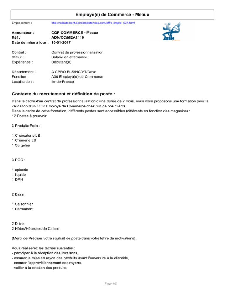Employé(e) de Commerce - Meaux Emplacement : http://recrutement.adncompetences.com/offre-emploi-537.html Annonceur : CQP COMMERCE - Meaux Réf : ADN/CC/MEA1116 Date de mise à jour : 10-01-2017 Contrat : Statut : Expérience : Contrat de professionnalisation Salarié en alternance Débutant(e) Département : Fonction : Localisation : A CPRO ELS/HC/VT/Drive A00 Employé(e) de Commerce Ile-de-France Contexte du recrutement et définition de poste : Dans le cadre d'un contrat de professionnalisation d'une durée de 7 mois, nous vous proposons une formation pour la validation d'un CQP Employé de Commerce chez l'un de nos clients. Dans le cadre de cette formation, différents postes sont accessibles (différents en fonction des magasins) : 12 Postes à pourvoir 3 Produits Frais : 1 Charcuterie LS 1 Crémerie LS 1 Surgelés 3 PGC : 1 épicerie 1 liquide 1 DPH 2 Bazar 1 Saisonnier 1 Permanent 2 Drive 2 Hôtes/Hôtesses de Caisse (Merci de Préciser votre souhait de poste dans votre lettre de motivations). Vous réaliserez les tâches suivantes : - participer à la réception des livraisons, - assurer la mise en rayon des produits avant l'ouverture à la clientèle, - assurer l'approvisionnement des rayons, - veiller à la rotation des produits, Page 1/2 Employé(e) de Commerce - Meaux Emplacement : http://recrutement.adncompetences.com/offre-emploi-537.html - participer aux inventaires. Cette formation, essentiellement pratique, est validée par l'obtention d'un CQP Employé(e) de commerce reconnu par le secteur de la grande distribution au niveau national. Profil recherché : Il n'y a pas de formations requises pour intégrer ce cursus. Votre motivation et votre souhait d'apprendre un nouveau métier, sur un secteur proposant de réelles opportunités professionnelles, seront les clés de votre sélection. Mobilité : Un moyen de locomotion est exigé. Le degré d'exigence de votre moyen de locomotion dépendra de la distance qui vous sépare du magasin. Les horaires décalés ne permettant pas de dépendre des transports en commun. Profil : Ponctuel, dynamique, rigoureux, personne s'intéressant à la grande distribution Salaire : % du smic selon âge et qualification (entre 55 et 100% du SMIC) Page 2/2