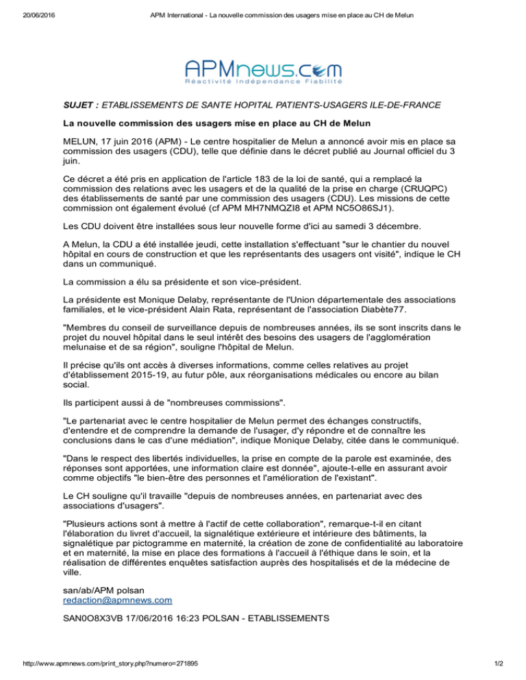 20/06/2016 APM International La nouvelle commission des usagers mise en place au CH de Melun SUJET : ETABLISSEMENTS DE SANTE HOPITAL PATIENTSUSAGERS ILEDEFRANCE La nouvelle commission des usagers mise en place au CH de Melun MELUN, 17 juin 2016 (APM) Le centre hospitalier de Melun a annoncé avoir mis en place sa commission des usagers (CDU), telle que définie dans le décret publié au Journal officiel du 3 juin. Ce décret a été pris en application de l'article 183 de la loi de santé, qui a remplacé la commission des relations avec les usagers et de la qualité de la prise en charge (CRUQPC) des établissements de santé par une commission des usagers (CDU). Les missions de cette commission ont également évolué (cf APM MH7NMQZI8 et APM NC5O86SJ1). Les CDU doivent être installées sous leur nouvelle forme d'ici au samedi 3 décembre. A Melun, la CDU a été installée jeudi, cette installation s'effectuant "sur le chantier du nouvel hôpital en cours de construction et que les représentants des usagers ont visité", indique le CH dans un communiqué. La commission a élu sa présidente et son viceprésident. La présidente est Monique Delaby, représentante de l'Union départementale des associations familiales, et le viceprésident Alain Rata, représentant de l'association Diabète77. "Membres du conseil de surveillance depuis de nombreuses années, ils se sont inscrits dans le projet du nouvel hôpital dans le seul intérêt des besoins des usagers de l'agglomération melunaise et de sa région", souligne l'hôpital de Melun. Il précise qu'ils ont accès à diverses informations, comme celles relatives au projet d'établissement 201519, au futur pôle, aux réorganisations médicales ou encore au bilan social. Ils participent aussi à de "nombreuses commissions". "Le partenariat avec le centre hospitalier de Melun permet des échanges constructifs, d'entendre et de comprendre la demande de l'usager, d'y répondre et de connaître les conclusions dans le cas d'une médiation", indique Monique Delaby, citée dans le communiqué. "Dans le respect des libertés individuelles, la prise en compte de la parole est examinée, des réponses sont apportées, une information claire est donnée", ajoutetelle en assurant avoir comme objectifs "le bienêtre des personnes et l'amélioration de l'existant". Le CH souligne qu'il travaille "depuis de nombreuses années, en partenariat avec des associations d'usagers". "Plusieurs actions sont à mettre à l'actif de cette collaboration", remarquetil en citant l'élaboration du livret d'accueil, la signalétique extérieure et intérieure des bâtiments, la signalétique par pictogramme en maternité, la création de zone de confidentialité au laboratoire et en maternité, la mise en place des formations à l'accueil à l'éthique dans le soin, et la réalisation de différentes enquêtes satisfaction auprès des hospitalisés et de la médecine de ville. san/ab/APM polsan [email protected] SAN0O8X3VB 17/06/2016 16:23 POLSAN ETABLISSEMENTS http://www.apmnews.com/print_story.php?numero=271895 1/2 20/06/2016 APM International La nouvelle commission des usagers mise en place au CH de Melun ©19892016 APM International. http://www.apmnews.com/print_story.php?numero=271895 2/2