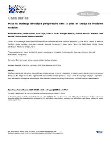 Open Access Case series Place du repérage isotopique peropératoire dans la prise en charge de l’ostéome ostéoïde Monsef Boufettal1,&, Amina Haddam2, Issam Lalya3, Rachid El Zanati1, Mustapha Mahfoud1, Ahmed El Bardouni1, Mohamed Saleh Berrada1, Nouzha Benraïs2, Moradh El Yaacoubi1 1 Service de Traumatologie et Orthopédie, Centre Hospitalier Universitaire Avicenne, Université Mohammed V, Rabat, Maroc, 2Service de Médecine Nucléaire, Centre Hospitalier Universitaire Avicenne, Université Mohammed V, Rabat, Maroc, 3 Service de Radiothérapie, Hôpital Militaire d’Instruction Mohammed V, Rabat, Maroc & Corresponding author: Monsef Boufettal, Service de Traumatologie et Orthopédie, Centre Hospitalier Universitaire Avicenne, Université Mohammed V, Rabat, Maroc Key words: Chirurgie, marges saines, ostéome ostéoïde, repérage isotopique Received: Received: 28/06/2014 - Accepted: 13/08/2014 - Published: 16/10/2014 Abstract L'ostéome ostéoïde est une tumeur osseuse bénigne. Le diagnostic est clinique et radiologique, et le traitement consiste en l'exérèse chirurgicale totale avec des marges saines. Nous rapportons 05 cas d'ostéome ostéoïde opérés avec succès à l’aide d'un repérage isotopique peropératoire. Nous précisons les avantages de cette technique dans l'orientation de l'exérèse chirurgicale ainsi que la confirmation de son caractère radical. Pan African Medical Journal. 2014; 19:158 doi:10.11604/pamj.2014.19.158.4919 This article is available online at: http://www.panafrican-med-journal.com/content/article/19/158/full/ © Monsef Boufettal et al. The Pan African Medical Journal - ISSN 1937-8688. This is an Open Access article distributed under the terms of the Creative Commons Attribution License (http://creativecommons.org/licenses/by/2.0), which permits unrestricted use, distribution, and reproduction in any medium, provided the original work is properly cited. Pan African Medical Journal – ISSN: 1937- 8688 (www.panafrican-med-journal.com) Published in partnership with the African Field Epidemiology Network (AFENET). (www.afenet.net) Page number not for citation purposes 1 Introduction L´ostéome ostéoïde est une tumeur bénigne ostéoblastique relativement rare, constituée d´une petite lésion de tissu charnu et vascularisé, appelé nidus, cernée d´une ostéocondensation réactionnelle. La tumeur est petite, à potentiel évolutif limité mais à douleur disproportionnelle [1]. Le traitement est exclusivement chirurgical, et la résection complète de la tumeur est le seul garant de l´absence de récidive [2]. La difficulté du geste opératoire émane de la localisation de la tumeur, de ses rapports anatomiques mais surtout desa petite taille; ce qui justifie l´intérêt de la technique du repérage isotopique peropératoire. Cette étude vient en continuité desdeux cas précédemment publiés par notre équipe [3,4], et se propose de rapporter notre expérience, tout en décrivant la technique de repérage isotopique peropératoire de l´ostéome ostéoïde à propos de cinq cas, ses avantages, les perspectives d´avenir ainsi que sa place parmi les autres moyens de repérage peropératoire. Méthodes Eligibilité Après l´approbation du comité d´éthique de la faculté de médecine et de pharmacie, les dossiers des patients ayant bénéficié d’un traitement chirurgical d’O.O avec repérage isotopique peropératoire, au service de chirurgie orthopédique, ont été revus rétrospectivement. Les patients ayant un recul inférieur à 12 mois, ont été exclus de l’étude. Ainsi notre étude s’est étalée de 2008 à 2010. bruit de fond, l’activité de l’os sain loin du point (ou des points) hyperfixant(s). Description de la technique La technique consistait à administrer pour chacun de nos patients trois, ou quatre et jusqu´à sept heures avant l´intervention 8 MBq/Kg d´HMDP-99mTc par voie intraveineuse. Pour s´assurer de la fixation du traceur sur la lésion à traiter, un premier repérage scintigraphique est réalisé avec enregistrement corps entier par la gamma caméra. Au bloc opératoire, la radiodétection s´effectue en étroite collaboration entre chirurgien et médecin nucléaire avec un aide qui note les comptages sur le boîtier électronique (Figure 1). Un repérage percutané pour le centrage de la voie d´abord sur la lésion (Figure 2) est suivi, après incision et abord de l´os, d´un repérage du point de fixation le plus important et des enregistrements sont alors effectués de centimètre en centimètre dans les quatre points cardinaux (Figure 3). Ceci permet d´établir une cartographie du radio-marquage autour du point de fixation maximal, avant et après résection de la lésion. Le comptage du nombre de coups par seconde enregistré sur le fragment osseux enlevé sera également effectué (Figure 4). En somme, la sonde de repérage isotopique est employée dans les différents temps de l´intervention chirurgicale. Elle permet d´abord de localiser l´ostéome ostéoïde, puis de guider l´étendue de la résection chirurgicale et surtout elle vérifie la qualité de celle-ci par la disparition totale en fin d´intervention de tout foyer anormal d´hyperfixation. La marche a été autorisée sans appui pour une durée de 30 à 45 jours. Résultats Caractéristiques des patients La technique de repérage isotopique peropératoire de l´ostéome ostéoïde a été programmée pour 5 patients colligés au service de chirurgie orthopédique, ils étaient tous de sexe masculin, avec un âge moyen de 19,6 ans, sans antécédents pathologiques particuliers, le délai moyen de consultation était de 16,5 mois, et la symptomatologie clinique était dominée par des douleurs type inflammatoire d´apparition nocturne. La localisation de cette lésion était préférentielle au niveau des membres inférieurs (Tableau 1).Tous nos patients ont bénéficié d´examens complémentaires notamment des radiog