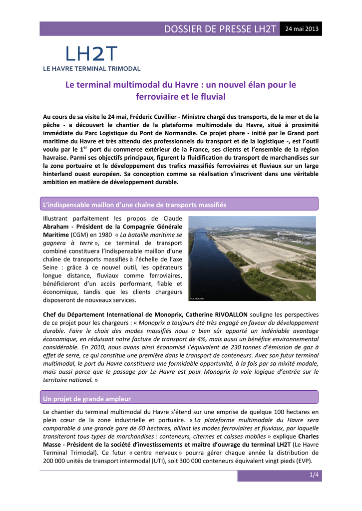 DOSSIER DE PRESSE LH2T 24 mai 2013 LH2T LE HAVRE TERMINAL TRIMODAL Le terminal multimodal du Havre : un nouvel élan pour le ferroviaire et le fluvial Au cours de sa visite le 24 mai, Fréderic Cuvillier - Ministre chargé des transports, de la mer et de la pêche - a découvert le chantier de la plateforme multimodale du Havre, situé à proximité immédiate du Parc Logistique du Pont de Normandie. Ce projet phare - initié par le Grand port maritime du Havre et très attendu des professionnels du transport et de la logistique -, est l’outil voulu par le 1er port du commerce extérieur de la France, ses clients et l’ensemble de la région havraise. Parmi ses objectifs principaux, figurent la fluidification du transport de marchandises sur la zone portuaire et le développement des trafics massifiés ferroviaires et fluviaux sur un large hinterland ouest européen. Sa conception comme sa réalisation s’inscrivent dans une véritable ambition en matière de développement durable. L’indispensable maillon d’une chaîne de transports massifiés Illustrant parfaitement les propos de Claude Abraham - Président de la Compagnie Générale Maritime (CGM) en 1980 « La bataille maritime se gagnera à terre », ce terminal de transport combiné constituera l’indispensable maillon d’une chaîne de transports massifiés à l’échelle de l’axe Seine : grâce à ce nouvel outil, les opérateurs longue distance, fluviaux comme ferroviaires, bénéficieront d’un accès performant, fiable et économique, tandis que les clients chargeurs disposeront de nouveaux services. Chef du Département International de Monoprix, Catherine RIVOALLON souligne les perspectives de ce projet pour les chargeurs : « Monoprix a toujours été très engagé en faveur du développement durable. Faire le choix des modes massifiés nous a bien sûr apporté un indéniable avantage économique, en réduisant notre facture de transport de 4%, mais aussi un bénéfice environnemental considérable. En 2010, nous avons ainsi économisé l’équivalent de 230 tonnes d’émission de gaz à effet de serre, ce qui constitue une première dans le transport de conteneurs. Avec son futur terminal multimodal, le port du Havre constituera une formidable opportunité, à la fois par sa mixité modale, mais aussi parce que le passage par Le Havre est pour Monoprix la voie logique d’entrée sur le territoire national. » Un projet de grande ampleur Le chantier du terminal multimodal du Havre s'étend sur une emprise de quelque 100 hectares en plein cœur de la zone industrielle et portuaire. « La plateforme multimodale du Havre sera comparable à une grande gare de 60 hectares, alliant les modes ferroviaires et fluviaux, par laquelle transiteront tous types de marchandises : conteneurs, citernes et caisses mobiles » explique Charles Masse - Président de la société d’investissements et maître d’ouvrage du terminal LH2T (Le Havre Terminal Trimodal). Ce futur « centre nerveux » pourra gérer chaque année la distribution de 200 000 unités de transport intermodal (UTI), soit 300 000 conteneurs équivalent vingt pieds (EVP). 1/4 DOSSIER DE PRESSE LH2T Le projet est réalisé sous la double maîtrise d’ouvrage du Grand Port Maritime du Havre (GPMH) et de la société d’investissements Le Havre terminal Trimodal (LH2T), qui en a confié le pilotage à Projénor. Engagés début 2012, les travaux devraient s’achever à la fin de l’été 2014 pour une mise en service au second semestre 2014. 24 mai 2013 Le projet en quelques dates : ères 1 réflexions sur le projet dès 2008 Décision du Conseil de Surveillance GPMH : juin 2010 Enquête publique : du 6 sept. au 8 oct. 2011 Lancement des travaux : début 2012 Fin des travaux prévue mi-2014 Mise en service prévue au 2ème semestre 2014 Les travaux sous maîtrise d’ouvrage GPMH portent en particulier sur : - la réalisation des terrassements : près de 570 000 Calendrier prévisionnel de réalisation : m3 de matériaux sablo-graveleux ont été déplacés Achèvement de la cour ferroviaire : pour stabiliser le terrain. Au plus fort de l’activité décembre 2013 du chantier (printemps 2012), jusqu’à 110 Achèvement du quai fluvial et dragage : personnes étaient présentes sur le site pour ces novembre 2013 opérations de terrassement et un ballet de 70 Achèvement de la cour fluviale : avril 2014 Arrivée du premier portique : février 2014 camions assurait le transport des matériaux, - la réalisation de l’accès routier et de l’installation terminale embranchée (ITE) : celle-ci raccorde le terminal multimodal au Réseau Ferré Portuaire (RFP). Sa réalisation est programmée à l’été 2013, - la réalisation des mesures environnementales (détaillées page suivante). Les travaux sous maîtrise d’ouvrage LH2T, sous pilotage Projénor, portent en particulier sur : - la mise en place des chaussées lourdes et voies de circulation routière et la réalisation des assainissements spécifiques, - la mise en place des voies ferrées et caténaires : démarrée fin 2012, la pose de voies ferrées porte sur plus de 22 km de voies, - la mise en place d’un système de signalisation ferroviaire pour la gestion de la circulation des trains ainsi que des équipements de sécurisation du site, - la réalisation du quai fluvial d’une longueur de 400 mètres : démarrée à l’été 2012, cette étape devrait se poursuivre dans les prochaines semaines par la réalisation du mur de couronnement qui accueillera les portiques fluviaux ainsi que par les dragages devant le quai. Ces travaux devraient s’achever en fin d’année, - la construction des bâtiments d’exploitation et hangar d’entretien. La livraison des équipements de manutention (4 portiques) est prévue début 2014. 2/4 DOSSIER DE PRESSE LH2T 24 mai 2013 Les entreprises maîtres d’œuvre du chantier (la plupart sont implantées localement) : Maîtrise d’oeuvre : Arcadis Contrô