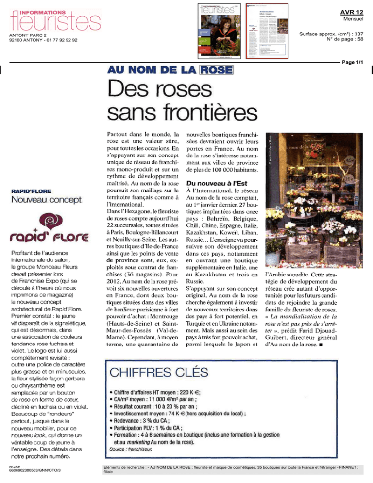 AVR 12 Mensuel Surface approx. (cm²) : 337 N° de page : 58 ANTONY PARC 2 92160 ANTONY - 01 77 92 92 92 Page 1/1 AU NOM DE LA ROSE Des roses sans frontières RAPID'FLORE Nouveau concept rapd' P Profitant de l'audience internationale du salon, le groupe Monceau Fleurs devait présenter lors de Franchise Expo (qui se déroule a l'heure où nous imprimons ce magazine) le nouveau concept architectural de Rapid 'Flore Premier constat le jaune vif disparaît de la signaletique, qui est désormais, dans une association de couleurs tendance rose fuchsia et violet. Le logo est lui aussi complètement revisite . outre une police de caractère plus grasse et en minuscules, la fleur stylisée façon gerbera ou chrysanthème est remplacée par un bouton de rose en forme de cœur, décliné en fuchsia ou en violet. Beaucoup de "rondeurs" partout, jusque dans le nouveau mobilier, pour ce nouveau look, qui donne un véritable coup de jeune a l'enseigne Des détails dans notre prochain numéro. ROSE 6606902300503/GNN/OTO/3 Partout dans le monde, la rose est une valeur sûre, pour toutes les occasions En s'appuyant sur son concept unique de réseau de franchises mono-produit et sur un rythme de développement maîtrise, Au nom de la rose poursuit son maillage sur le territoire français comme à l'international. Dans l'Hexagone, le fleuriste de rosés compte aujourd'hui 22 succursales, toutes situées à Paris, Boulogne-Billancourt et Neuilly-sur-Seine Les autres boutiques d'Ile-de-France ainsi que les points de vente de province sont, eux, exploités sous contrat de franchises (36 magasins). Pour 2012, Au nom de la rose prévoit six nouvelles ouvertures en France, dont deux boutiques situées dans des villes de banlieue parisienne à fort pouvoir d'achat : Montrouge (Hauts-de-Seine) et SaintMaur-des-Fossés (Val-deMarne) Cependant, à moyen terme, une quarantaine de nouvelles boutiques franchisées devraient ouvrir leurs portes en France. Au nom de la rose s'intéresse notamment aux villes dc province de plus de 100 000 habitants Du nouveau à l'Est À l'International, le réseau Au nom de la rose comptait, au I t r janvier dernier. 27 boutiques implantées dans onze pays : Bahrein, Belgique, Chili, Chine, Espagne, Italie, Kazakhstan, Koweit, Liban, Russie... L'enseigne va poursuivre son développement dans ces pays, notamment en ouvrant une boutique supplementaire en Italie, une au Kazakhstan et trois en Russie. S'appuyant sur son concept original, Au nom de la rose cherche également à investir de nouveaux territoires dans des pays à fort potentiel, en Turquie et en Ukraine notamment. Mais aussi au sem des pays à tres fort pouvoir achat, parmi lesquels le Japon et l'Arabie saoudite. Cette stratégie de développement du réseau crée autant d'opportunités pour les futurs candidats de rejoindre la grande famille du fleuriste de roses. « La mondialisation de la rose n 'est pas près de s'arrêter », prédit Farid DjouadGuibert, directeur general d'Au nom de la rose. • CHIFFRES CLÉS • Chiffre d'affaires HT moyen : 220 K €; • CA/m2 moyen : 11 DOO €Jm2 par an ; • Resultat courant. 10 à 20 % par an ; • Investissement moyen : 74 K €(hors acquisition du local) ; • Redevance : 3 % du CA ; • Participation PLV : 1 % du CA ; • Formation : 4 à 6 semaines en boutique (inclus une formation à la gestion et au marketing M nom de la rose). Source franchiseur Eléments de recherche : - AU NOM DE LA ROSE : fleuriste et marque de cosmétiques, 35 boutiques sur toute la France et l'étranger - FINANET : filiale