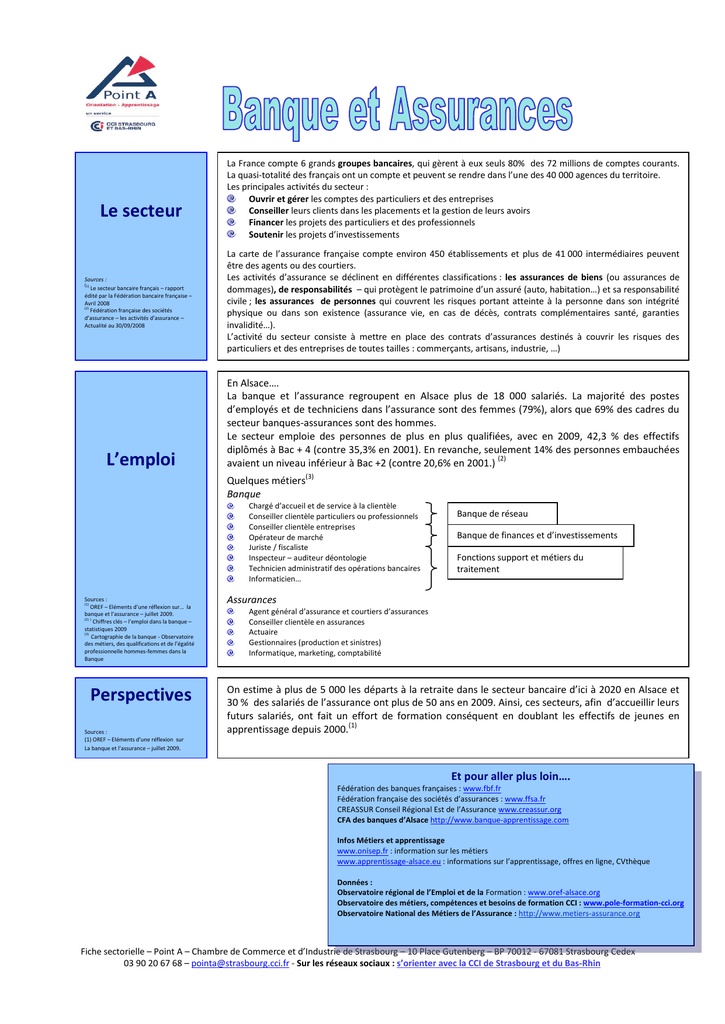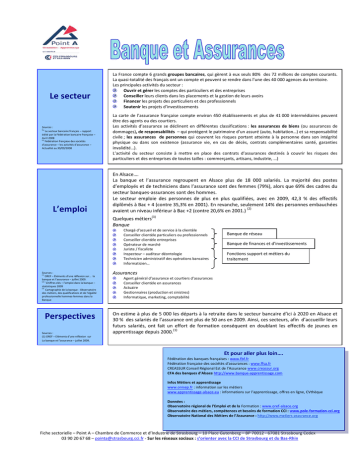 Le secteur Sources : (1) Le secteur bancaire français – rapport édité par la Fédération bancaire française – Avril 2008 (2) Fédération française des sociétés d’assurance – les activités d’assurance – Actualité au 30/09/2008 L’emploi La France compte 6 grands groupes bancaires, qui gèrent à eux seuls 80% des 72 millions de comptes courants. La quasi-totalité des français ont un compte et peuvent se rendre dans l’une des 40 000 agences du territoire. Les principales activités du secteur : Ouvrir et gérer les comptes des particuliers et des entreprises Conseiller leurs clients dans les placements et la gestion de leurs avoirs Financer les projets des particuliers et des professionnels Soutenir les projets d’investissements La carte de l’assurance française compte environ 450 établissements et plus de 41 000 intermédiaires peuvent être des agents ou des courtiers. Les activités d’assurance se déclinent en différentes classifications : les assurances de biens (ou assurances de dommages), de responsabilités – qui protègent le patrimoine d’un assuré (auto, habitation…) et sa responsabilité civile ; les assurances de personnes qui couvrent les risques portant atteinte à la personne dans son intégrité physique ou dans son existence (assurance vie, en cas de décès, contrats complémentaires santé, garanties invalidité…). L’activité du secteur consiste à mettre en place des contrats d’assurances destinés à couvrir les risques des particuliers et des entreprises de toutes tailles : commerçants, artisans, industrie, …) En Alsace…. La banque et l’assurance regroupent en Alsace plus de 18 000 salariés. La majorité des postes d’employés et de techniciens dans l’assurance sont des femmes (79%), alors que 69% des cadres du secteur banques-assurances sont des hommes. Le secteur emploie des personnes de plus en plus qualifiées, avec en 2009, 42,3 % des effectifs diplômés à Bac + 4 (contre 35,3% en 2001). En revanche, seulement 14% des personnes embauchées (2) avaient un niveau inférieur à Bac +2 (contre 20,6% en 2001.) Quelques métiers Banque (3) Chargé d’accueil et de service à la clientèle Conseiller clientèle particuliers ou professionnels Conseiller clientèle entreprises Opérateur de marché Juriste / fiscaliste Inspecteur – auditeur déontologie Technicien administratif des opérations bancaires Informaticien… Sources : (1) OREF – Eléments d’une réflexion sur… la banque et l’assurance – juillet 2009. (2) ) Chiffres clés – l’emploi dans la banque – statistiques 2009 (3) Cartographie de la banque - Observatoire des métiers, des qualifications et de l’égalité professionnelle hommes-femmes dans la Banque Perspectives Sources : (1) OREF – Eléments d’une réflexion sur La banque et l’assurance – juillet 2009. Banque de réseau Banque de finances et d’investissements Fonctions support et métiers du traitement Assurances Agent général d’assurance et courtiers d’assurances Conseiller clientèle en assurances Actuaire Gestionnaires (production et sinistres) Informatique, marketing, comptabilité On estime à plus de 5 000 les départs à la retraite dans le secteur bancaire d’ici à 2020 en Alsace et 30 % des salariés de l’assurance ont plus de 50 ans en 2009. Ainsi, ces secteurs, afin d’accueillir leurs futurs salariés, ont fait un effort de formation conséquent en doublant les effectifs de jeunes en (1) apprentissage depuis 2000. Et pour aller plus loin…. Fédération des banques françaises : www.fbf.fr Fédération française des sociétés d’assurances : www.ffsa.fr CREASSUR Conseil Régional Est de l’Assurance www.creassur.org CFA des banques d’Alsace http://www.banque-apprentissage.com Infos Métiers et apprentissage www.onisep.fr : information sur les métiers www.apprentissage-alsace.eu : informations sur l’apprentissage, offres en ligne, CVthèque Données : Observatoire régional de l’Emploi et de la Formation : www.oref-alsace.org Observatoire des métiers, compétences et besoins de formation CCI : www.pole-formation-cci.org Observatoire National des Métiers de l’Assurance : http://www.metiers-assurance.org Fiche sectorielle – Point A – Chambre de Commerce et d’Industrie de Strasbourg – 10 Place Gutenberg – BP 70012 - 67081 Strasbourg Cedex 03 90 20 67 68 – [email protected] - Sur les réseaux sociaux : s’orienter avec la CCI de Strasbourg et du Bas-Rhin