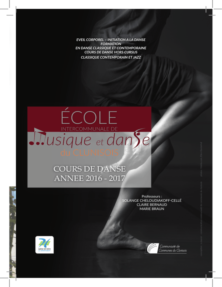 Professeurs : SOLANGE CHELOUDIAKOFF-CELLÉ CLAIRE BERNAUD MARIE BRAUN conception : a.mazuir - communication communauté de communes du clunisois COURS DE DANSE ANNEE 2016 - 2017 photos : fotolia.com, Ellen Oosterhof EVEIL CORPOREL – INITIATION A LA DANSE FORMATION EN DANSE CLASSIQUE ET CONTEMPORAINE COURS DE DANSE HORS CURSUS CLASSIQUE CONTEMPORAIN ET JAZZ EVEIL CORPOREL – INITIATION A LA DANSE Dès 4 ans : éveil à la danse – 6/7 ans : initiation Basé sur un travail du corps, de relation à l’espace, de musicalité et d’écoute, ces ateliers sont des moments ludiques qui visent à développer le plaisir du mouvement chez les enfants, tout en leur permettant de prendre conscience de leur corps et de développer leur imaginaire par le biais de jeux dansés. Instaurant ainsi un véritable accompagnement pédagogique créatif dans l’écoute de l’autre et de ses possibilités, les cours d’éveil et d’initiation sont des moments d’échange et de plaisir autant que d’apprentissage. FORMATION EN DANSE CLASSIQUE ET CONTEMPORAINE Dès 8/9 ans – 1er cycle d’études – Après le 1er cycle d’études Axé autour du travail de la colonne vertébrale, les cours structurent le corps dans sa globalité : Travail de pieds et de jambes, de bras et de mains, enroulé-déroulé et torsion du dos, transfert de poids, rythme, accent, pulsation, tempo avec contraste de vitesse et de dynamique, rebond et suspension, travail de déplacements dans l’espace et au sol, … Les cours et ateliers visent à développer la technique et les fondamentaux de la danse classique et contemporaine. Le travail sur les différentes qualités de mouvement sera proposé, pour une mise en état de danse. Des variations classiques ou contemporaines rythmeront les cours afin que chacun devienne danseur à son tour. L’activité comprend également des apports musicaux indispensables à la formation du danseur. Les élèves ayant obtenu leur certificat de fin de premier cycle peuvent participer au choix à tous les cours proposés dans l’école. COURS DE DANSE HORS CURSUS : CLASSIQUE, CONTEMPORAIN ET JAZZ Activités loisirs pour les jeunes dès 12 ans et les adultes. Les cours de danse permettent aux participants d’entrer dans une démarche de connaissance de leur corps en utilisant les fondamentaux de la danse. La technique et les ateliers sont des matériaux de base pour entrer dans la danse, instaurant ainsi un véritable accompagnement pédagogique créatif dans l’écoute de soi, de l’autre et de ses possibilités. Développer sa propre gestuelle, sa façon de bouger et d’évoluer dans l’espace, travailler sur les notions de temps, de poids, de rythme, en solo, duo ou trio par le biais de jeux individuels et collectifs, autant de découvertes pour entrer dans une danse vivante, claire et humaine. Le travail se répartit entre un temps d’échauffement : étirements, apprentissage technique, variation chorégraphique, et un temps d’atelier avec des restitutions pour le plaisir. HORAIRES Ces activités sont ouvertes à toutes et à tous et de tout niveau. Emploi du temps prévisionnel 2016-2017, sous réserve du nombre d’inscrits. Éveil corporel dès 4 ans, initiation à 6 et 7 ans, Formation en danse classique et contemporaine à partir de 8 ans Cours de danse contemporaine et jazz hors cursus à partir de 12 ans et adultes Relation entre musique et danse (Âges donnés à titre indicatif) LUNDI 17h15-18h15 Initiation 2 7/8 ans 18h15-19h15 Cycle 1 1ère année 8/9 ans contemporain 19h15 - 20h45 17 ans et adultes contemporain niveau 2 MARDI 17h15-18h15 Initiation 1 6/7ans 18h15-19h30 Cycle 1 2ème année 9/10 ans contemporain 19h30 - 21h00 17 ans et adultes contemporain niveau 1 MERCREDI 13h00-15h00 Cycle 2 contemporain 15h00-16h45 Cycle 1 3ème et 4ème année 10/12 ans contemporain 16h45-17h30 Eveil 1 4/5 ans 18h15-19h30 Cycle 1 2ème année 9/10 ans classique 19h30-20h30 17 ans et plus Jazz JEUDI VENDREDI SAMEDI 17h15-18h15 Cycle 1 1ère année 8/9 ans classique 18h-19h30 Relation musique/danse 1 fois/mois 9h30-10h45 Cycle 2 classique Cycle 1 1ère 2ème année 10h45-12h15 Cycle 1 3ème et 4ème année 10/12 ans classique ou 17h30-18h15 Eveil 2 5/6 ans Cycle 1 3ème 4ème année ouvert aux adultes 12h15-13h15 12/16 ans contemporain et jazz INSCRIPTIONS 2016 Réinscriptions du 13 au 17 juin : Permanence le 15 juin de 9h à 12h et de 14h à 17h Permanence le 16 juin de 16h à 18h30 Nouvelles inscriptions, dans la limite des places disponibles, du 20 juin au 1er juillet : lundi, mardi et jeudi de 16h à 18h30 mercredi de 9h à 12h et de 14h à 17h L’inscription des enfants et des adolescents de la Communauté de Communes du Clunisois est prioritaire. L’engagement pour tout élève est pris pour une année scolaire. A l’inscription, vous choisissez votre mode de paiement : en 1 ou 3 fois (par prélèvement uniquement). Munissez-vous d’un carnet de chèques et d’un RIB. Clôture des inscriptions au 1er juillet. (inscription possible en cours d’année, sous réserve de places disponibles.) CERTIFICAT MEDICAL – ATTESTATION D’ASSURANCE Pièces à fournir à la rentrée 2016 : - un certificat médical (obligatoire pour tout élève), impérativement avant les vacances de la Toussaint, - une attestation individuelle d’assurance. Reprise des cours le lundi 12 septembre 2016 à l’Espace Danse, rue des tanneries à Cluny Plus d’informations : sur www.enclunisois.com rubrique Loisir/Culture/ Tourisme (activités, jours et horaires, tarifs, …) ou auprès de l’Ecole Intercommunale de Musique et de Danse du Clunisois 25, rue de la République 71250 Cluny 09 66 82 25 48 ecole-de-musique-et-danse @enclunisois.com