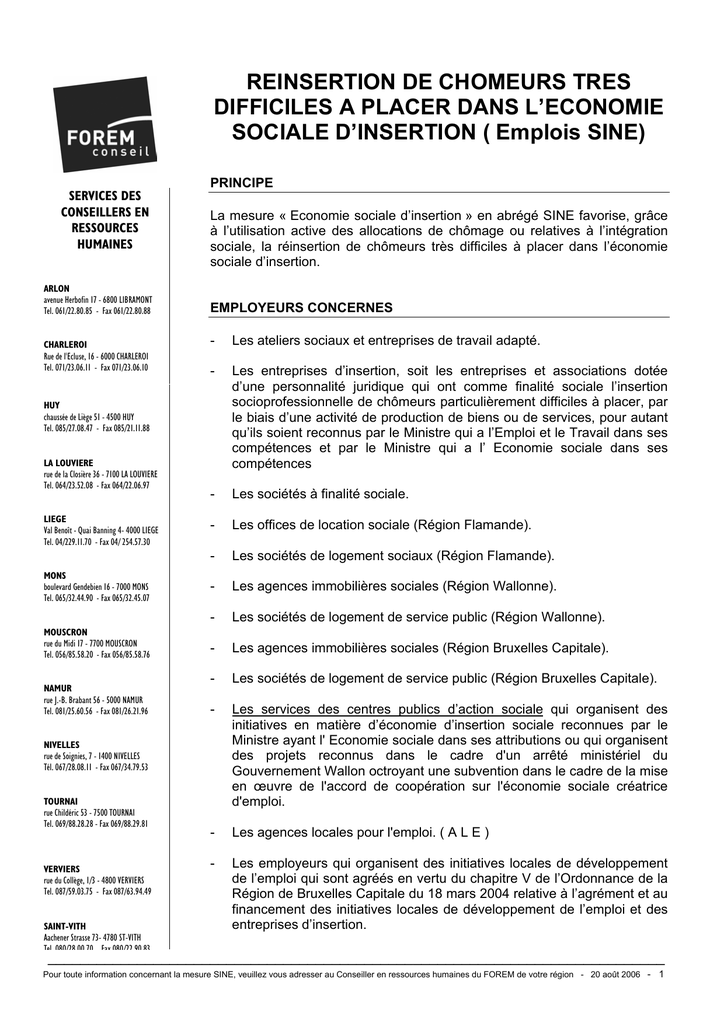 REINSERTION DE CHOMEURS TRES DIFFICILES A PLACER DANS L’ECONOMIE SOCIALE D’INSERTION ( Emplois SINE) SERVICES DES CONSEILLERS EN RESSOURCES HUMAINES ARLON avenue Herbofin 17 - 6800 LIBRAMONT Tel. 061/22.80.85 - Fax 061/22.80.88 CHARLEROI Rue de l'Ecluse, 16 - 6000 CHARLEROI Tel. 071/23.06.11 - Fax 071/23.06.10 PRINCIPE La mesure « Economie sociale d’insertion » en abrégé SINE favorise, grâce à l’utilisation active des allocations de chômage ou relatives à l’intégration sociale, la réinsertion de chômeurs très difficiles à placer dans l’économie sociale d’insertion. EMPLOYEURS CONCERNES - Les ateliers sociaux et entreprises de travail adapté. - Les entreprises d’insertion, soit les entreprises et associations dotée d’une personnalité juridique qui ont comme finalité sociale l’insertion socioprofessionnelle de chômeurs particulièrement difficiles à placer, par le biais d’une activité de production de biens ou de services, pour autant qu’ils soient reconnus par le Ministre qui a l’Emploi et le Travail dans ses compétences et par le Ministre qui a l’ Economie sociale dans ses compétences - Les sociétés à finalité sociale. - Les offices de location sociale (Région Flamande). - Les sociétés de logement sociaux (Région Flamande). - Les agences immobilières sociales (Région Wallonne). - Les sociétés de logement de service public (Région Wallonne). - Les agences immobilières sociales (Région Bruxelles Capitale). - Les sociétés de logement de service public (Région Bruxelles Capitale). - Les services des centres publics d’action sociale qui organisent des initiatives en matière d’économie d’insertion sociale reconnues par le Ministre ayant l' Economie sociale dans ses attributions ou qui organisent des projets reconnus dans le cadre d'un arrêté ministériel du Gouvernement Wallon octroyant une subvention dans le cadre de la mise en œuvre de l'accord de coopération sur l'économie sociale créatrice d'emploi. - Les agences locales pour l'emploi. ( A L E ) - Les employeurs qui organisent des initiatives locales de développement de l’emploi qui sont agréés en vertu du chapitre V de l’Ordonnance de la Région de Bruxelles Capitale du 18 mars 2004 relative à l’agrément et au financement des initiatives locales de développement de l’emploi et des entreprises d’insertion. HUY chaussée de Liège 51 - 4500 HUY Tel. 085/27.08.47 - Fax 085/21.11.88 LA LOUVIERE rue de la Closière 36 - 7100 LA LOUVIERE Tel. 064/23.52.08 - Fax 064/22.06.97 LIEGE Val Benoît - Quai Banning 4- 4000 LIEGE Tel. 04/229.11.70 - Fax 04/ 254.57.30 MONS boulevard Gendebien 16 - 7000 MONS Tel. 065/32.44.90 - Fax 065/32.45.07 MOUSCRON rue du Midi 17 - 7700 MOUSCRON Tel. 056/85.58.20 - Fax 056/85.58.76 NAMUR rue J.-B. Brabant 56 - 5000 NAMUR Tel. 081/25.60.56 - Fax 081/26.21.96 NIVELLES rue de Soignies, 7 - 1400 NIVELLES Tél. 067/28.08.11 - Fax 067/34.79.53 TOURNAI rue Childéric 53 - 7500 TOURNAI Tel. 069/88.28.28 - Fax 069/88.29.81 VERVIERS rue du Collège, 1/3 - 4800 VERVIERS Tel. 087/59.03.75 - Fax 087/63.94.49 SAINT-VITH Aachener Strasse 73- 4780 ST-VITH Tel 080/28 00 70 Fax 080/22 90 83 ____________________________________________________________________________ Pour toute information concernant la mesure SINE, veuillez vous adresser au Conseiller en ressources humaines du FOREM de votre région - 20 août 2006 - 1 - Les employeurs qui organisent les services de proximité en vertu du titre VI bis de l’arrêté du 08/09/2000 du Gouvernement flamand portant un programme d’impulsion et de soutien de l’économie plurielle qui sont reconnus comme tel en vertu des dispositions de l’arrêté précité du 08/09/2000. (reconnus par la Région flamande). Pour pouvoir entrer en considération, les employeurs doivent détenir une attestation préalable certifiant qu’ils relèvent effectivement du champ d’application SINE délivrée par le Service Public Fédéral de l’Emploi, du Travail et de la Concertation Sociale de Bruxelles. (Voir paragraphe « Formalités » ci-après). Cette attestation n’est pas à confondre avec la reconnaissance en tant qu’entreprise d’insertion fédérale ou régionale qui doit être obtenue préalablement. LA RECONNAISSANCE La reconnaissance comme entreprise d’insertion fédérale est quant à elle plus lourde. Il s’agit de démontrer que l’on répond à diverses conditions. La reconnaissance est octroyée conjointement par les Ministres fédéraux compétents pour le Budget et celui de l’Emploi, ainsi que par le Secrétaire d’Etat fédéral de .l’Economie sociale. Cette reconnaissance formelle est délivrée pour une durée de quatre ans renouvelable. Par ailleurs, cette reconnaissance est soumise au respect de certaines normes d’engagement de travailleurs tant du groupe cible que du personnel d’encadrement, à savoir : • pendant la première année suivant la date de reconnaissance, au moins 30 % des travailleurs occupés dans le cadre du projet sont des travailleurs appartenant au groupe-cible et, à partir de la quatrième année suivant la date de la reconnaissance, au moins 50 %. Pour le calcul des 30 % et 50 %, sont considérés comme appartenant au groupe-cible non seulement les travailleurs visés par la mesure SINE proprement dite (art. 14 de l’ A.R. du 16/05/2003 ) mais aussi : ¾ les travailleurs qui, à la date d’engagement, sont chômeurs complets indemnisés pendant au moins 1.560 jours calculés dans le régime de six jours / semaine au cours de la période des 72 mois calendrier qui précèdent. ¾ Les travailleurs qui, à la date de leur engagement bénéficient du droit à l’intégration sociale ou à l’aide sociale financière. • Les employeurs doivent également prévoir que le personnel d’encadrement, étant du personnel apte à conduire et à développer des programmes d’accompagnement et de formation sociale, atteigne au moins 10 % du personn