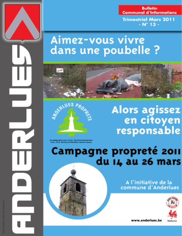 Bulletin Communal d’Informations editeur responsable, Philippe tison, Bourgmestre. Trimestriel Mars 2011 - N° 13 - MAISON DE REPOS ET DE SOINS Le ★ ★ ★ du 3è âge Résidence Le Royal Le Royal en extension en 2011 Chambres particulières et à 2 lits Renseignements 0475/767 204 UN NOUVEAU REGARD SUR LE 7 PLACES DÉCOUVREZ LA FAMILIALE DE VOS RÊVES PENDANT LES JOURNÉES PORTES OUVERTES DU ... AU ... LE NOUVEAU CHEVROLET ORLANDO 7 PLACES € 16.449 * IlIl combine combine un un caractère caractère audacieux audacieux avec avec une une polyvalence polyvalence intelintelligente :: le le rêve rêve pour pour ceux ceux qui qui ne ne veulent veulent pas pas choisir. choisir. Profitez Profitez ligente de 856 856 ll de de volume volume de de chargement chargement et et d’une d’une liberté liberté infinie. infinie. de LE LE NOUVEL NOUVEL ORLANDO, ORLANDO, LA LA GRANDE GRANDE CLASSE. CLASSE. Bouillard SA DEALER DEALER DEALER DEALER NAAM NAAM DEALER NAAM NAAM DEALER NAAM NAAM Adres Adres Adres Adres Adres Charleroi,Adres Chaussée de 154Stadl 6150 Anderlues XXXX Stad Stad XXXX Stad XXXX Stad Stad XXXX XXXX XXXX 0XX/XX.XX.XX 0XX/XX.XX.XX 0XX/XX.XX.XX 0XX/XX.XX.XX 0XX/XX.XX.XX 0XX/XX.XX.XX Tél. : 071 52 44 70 l www.bouillard.be www.chevrolet.be Cons. : 6,0 - 7,3 l/100 km • Emissions CO2 : 159 - 186 g/km DEALER DEALER NAAM NAAM Adres Adres XXXX Stad Stad XXXX 0XX/XX.XX.XX 0XX/XX.XX.XX 2 DEALER DEALER NAAM NAAM Adres Adres XXXX Stad Stad XXXX 0XX/XX.XX.XX 0XX/XX.XX.XX DEALER DEALER NAAM NAAM Adres Adres XXXX Stad Stad XXXX 0XX/XX.XX.XX 0XX/XX.XX.XX Prix de de vente vente TVAC TVAC (Orlando (Orlando 1.8 1.8 LS LS 77 places), places), hors hors options options et et accessoires. accessoires. Offre Offre valable valable uniquement uniquement pour pour les les particuliers particuliers du du XX/XX/2011 XX/XX/2011 au au XX/XX/2011 XX/XX/2011 et et ** Prix non cumulable cumulable avec avec d’autres d’autres promotions. promotions. •• Prix Prix du du modèle modèle illustré illustré (1.8 (1.8 LT LT 77 places) places) :: € € 18.199 18.199 •• Information Information environnementale environnementale AR AR 19.3.2004: 19.3.2004: www.chevrolet.be www.chevrolet.be non MONUMENTS FUNERAIRES • INCINÉRATION • ORGANISATION COMPLÈTE DE FUNÉRAILLES PARTOUT POUR TOUS • EMBAUMEUR DIPLOMÉ BIE edito Madame, Monsieur, Chers Citoyens, Dans quelques jours, notre commune vivra au rythme de l’une des plus belles festivités de l’année avec le Carnaval. Pour cette nouvelle édition, de nombreux acteurs et volontaires se sont investis pour perpétuer nos traditions folkloriques et vous proposer un programme de qualité (Voir rubrique « Folklore »). N’hésitez pas à nous rejoindre nombreux lors des différents événements qui marquent le Feureu. Cette période festive à l’approche du printemps constitue également le point de départ de nombreuses initiatives menées par votre commune. Parmi celles-ci, notre Campagne Propreté 2011 qui sera organisée à nouveau du 14 au 26 mars. Au programme cette année : animations ICDI dans les écoles, nettoyage de la commune par le service « Environnement », journée de clôture le 26 mars animée par le Conseil Communal des Enfants. Nous insisterons également sur le message de notre campagne « Aimez-vous Vivre dans une Poubelle ? Alors Agissez en Citoyen Responsable ». Nous comptons sur vous pour garder votre commune propre ! La quinzaine de la propreté sera également l’occasion de relancer l’opération « CONSOMMER LOCAL, C’EST AGIR GLOBAL » avec nos commerçants anderlusiens que vous reconnaîtrez au logo apposé sur les vitrines. Une fois de plus ils s’engageront concrètement dans des mesures visant à réduire les déchets. Encouragez leur démarche en soutenant le commerce local ! Dansquelquesmois,leComitédesJeunesd’Anderluesfinaliseraunprojetétudiédelonguedateparun voyage socioculturel au Québec. L’objectif est d’échanger les bonnes pratiques avec des québécois du même âge habitués à s’investir de façon plus active dans la vie de leur communauté locale notamment grâce à l’usage des nouvelles technologies. Dans la perspective de ce départ, le Comité organisera plusieursmanifestationsafinderécolterlesfondsnécessaires(StandquébécoislorsdesConcertsduMonde et du Marché du Monde, Souper Spaghetti, Blind test, Fief en Fête). Je vous invite vivement à soutenir ces jeunes anderlusiens dans la préparation de ce projet d’envergure ! Avec le Collège, je vous souhaite un Excellent Carnaval 2011 ! Votre Bourgmestre, Philippe Tison 3 NouvelleS Lors de la dernière offensive hivernale, la Commune d’Anderlues avait déployé les grands moyens, notamment en appelant la Protection Civile en renfort pour faire face aux conditions météorologiques exceptionnelles et dégager nos voiries. Merci à toute l’équipe du Service Travaux pour les missions effectuées à l’occasion de cet hiver rigoureux : salage et dégagement des routes, sécurisation des abords des écoles, interventions de secours médical, services à la population, … Propreté – Collecte des déchets Attention, nous vous rappelons que désormais la collecte des déchets ménagers a lieu le vendredi dans toute l’entité. Vous devez donc sortir vos sacs le jeudi soir ou le vendredi matin avant 6h00. Avis à la population Le Conseil communal a décidé de désaffecter une série de véhicules et de les proposer à la vente. Il s’agit : d’une camionnette Ford plateau (1993), d’une camionnette Fiat plateau (1998), de 2 camionnettes Citroën C15, d’un camion Man (1995), d’un tracteur Mercedes, d’une finisseuse à tarmac, d’une Renault R4, d’une camionnette VW. Les véhicules se trouvent au Service travaux rue des Ecoles 51 à 6150 Anderlues (Ouvert du lundi au vendredi de 8h à 12h et de 13h à 15h). Les offres sont à faire parvenir sous pli fermé pour le 14 avril 2011 à : Administration communale d’