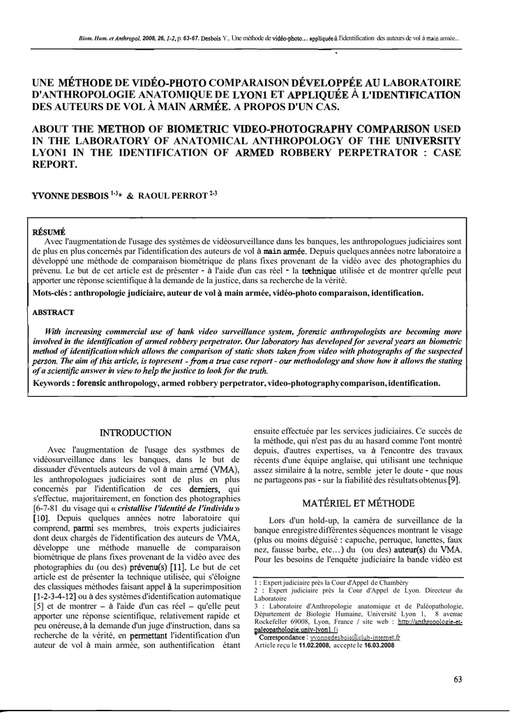 Biom. Hum. et Anthropol. 2008, 26, 1-2, p. 63-67. Desbois Y., Une méthode de vidb-photo. .. appliquee B l'identification des auteurs de vol à main armée... UNE MÉTHODE DE VIDÉO-PHOTO COMPARAISON DÉVELOPPÉE AL.LABORATOIRE D'ANTHROPOLOGIE ANATOMIQUE DE LYONI ET APPLIQUÉE À L~IDENTIFICATION DES AUTEURS DE VOL À MAIN ARMÉE. A PROPOS D'UN CAS. ABOUT THE METHOD OF BIOMETRIC VIDEO-PHOTOGRAPHY COMPARISON USED IN THE LABORATORY OF ANATOMICAL ANTHROPOLOGY OF THE UNIVERSITY LYON1 IN THE IDENTIFICATION OF ARMED ROBBERY PERPETRATOR : CASE REPORT. WONNE DESBOIS '"* & RAOUL PERROT *" RÉsUMÉ Avec l'augmentation de l'usage des systèmes de vidéosurveillance dans les banques, les anthropologues judiciaires sont de plus en plus concernés par l'identification des auteurs de vol à main armée. Depuis quelques années notre laboratoire a développé une méthode de comparaison biométrique de plans fixes provenant de la vidéo avec des photographies du prévenu. Le but de cet article est de présenter - à l'aide d'un cas réel - la technique utilisée et de montrer qu'elle peut apporter une réponse scientifique à la demande de la justice, dans sa recherche de la vérité. Mots-clés: anthropologie judiciaire, auteur de vol B main armée, vidéo-photo comparaison, identification. With increasing commercial use of bank video surveillance system, forensic anthropologists are becoming more involved in the identification of armed robbery perpetrator. Our laborato?y has developed for several years an biometric method of identification which allows the comparison of static shots taken from video with photographs of the suspected person. The aim of thk article, is topresent -from a irue case report - our methodology and show how it allows the stating of a scientzjk answer in view to help the justice to look for the tnith. Keywords : forensic anthropology, armed robbery perpetrator, video-photography comparison, identification. Avec l'augmentation de l'usage des systbmes de vidéosurveillance dans les banques, dans le but de dissuader d'éventuels auteurs de vol à main armé (VMA), les anthropologues judiciaires sont de plus en plus concernés par l'identification de ces deniiers, qui s'effectue, majoritairement, en fonction des photographies [6-7-81 du visage qui « cristallise l'identité de l'individu )) [IO]. Depuis quelques années notre laboratoire qui comprend, parmi ses membres, trois experts judiciaires dont deux chargés de l'identification des auteurs de VMA, développe une méthode manuelle de comparaison biométrique de plans fixes provenant de la vidéo avec des photographies du (ou des) prévenu(s) [Il]. Le but de cet article est de présenter la technique utilisée, qui s'éloigne des classiques méthodes faisant appel A la superimposition [l-2-3-4-121 ou à des systèmes d'identification automatique [5] et de montrer - à l'aide d'un cas réel - qu'elle peut apporter une réponse scientifique, relativement rapide et peu onéreuse, à la demande d'un juge d'instruction, dans sa recherche de la vérité, en permettant l'identification d'un auteur de vol à main armée, son authentification étant ensuite effectuée par les services judiciaires. Ce succès de la méthode, qui n'est pas du au hasard comme l'ont montré depuis, d'autres expertises, va à l'encontre des travaux récents d'une équipe anglaise, qui utilisant une technique assez similaire à la notre, semble jeter le doute - que nous ne partageons pas - sur la fiabilité des résultats obtenus [9]. Lors d'un hold-up, la caméra de surveillance de la banque enregistre différentes séquences montrant le visage (plus ou moins déguisé : capuche, perruque, lunettes, faux nez, fausse barbe, etc.. .) du (ou des) auteur(s) du VMA. Pour les besoins de l'enquête judiciaire la bande vidéo est 1 : Expert judiciaire près la Cour d'Appel de Chambéry 2 : Expert judiciaire près la Cour d'Appel de Lyon. Directeur du Laboratoire 3 : Laboratoire d'Anthropologie anatomique et de Paléopathologie, Département de Biologie Humaine, Université Lyon 1, 8 avenue Rockefeller 69008, Lyon, France / site web : httu://anthropoloeie-etpaleopatholoaie.univ-lvonl. f i * Correspondance : yvonnedesbois@,club-internet.fr Article reçu le 11.02.2008, accepte le 16.03.2008 Biom. Hum. ef Anfhrapol.2008, 26, 1-2. p. 63-67. Dcsbois Y., Une méthode de vidéo-photo... appliquée h l'identification des auteurs de vol h main armée... saisie et visionnée, ce qui entraîne -généralement l'arrestation d'un ( ou de plusieurs) prévenu(s). Un dossier d'expertise est créé, comprenant la vidéo, un texte relatant les conditions du VMA. Il est illustré par les photographies des meilleurs plans fvtes de la vidéo ainsi que par les photographies des prévenus. Le Juge d'instruction chargé de l'affaire va alors désigner un (ou deux) expert(s) judiciaire(s) reconnu(s) pour sa(1eur) compétence dans le domaine de l'anthropologie d' identification. Dans le cas du Laboratoire d'Anthropologie de Lyon, l'expertise est depuis quelques années - effectuée à deux : chacun travaillant en indépendance totale l'un par rapport à l'autre. C'est à la fin seulement que sont confrontés les résultats. Le rapport d'expertise transmis à la justice, comporte l'analyse détaillée ainsi que la conclusion de chacun des deux experts, puis une synthèse de ces résultats permettant au Juge d'instruction de prendre une décision concernant le (ou les) prévenu(s). Il est bon de noter que l'équipe scientifique n'a aucune connaissance de l'enquête judiciaire qui continue parallèlement. La méthode utilisée consiste, après avoir visionné la vidéo, à comparer les plans fixes extraits des vidéosurveillances et des photos de prévenus. Elle se déroule en trois étapes : examen morphologique, examen métrique et étude comparative. la valeur sera négative (-) si la valeur indiciaire (ou angulaire) du prévenu est inférieure à celie de l'auteur du VMA Ensuite la somme alg