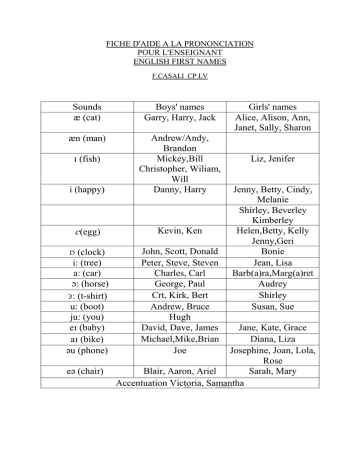 FICHE D'AIDE A LA PRONONCIATION POUR L'ENSEIGNANT ENGLISH FIRST NAMES F.CASALI CP LV Sounds z (cat) Boys' names Garry, Harry, Jack zn (man) i (happy) Andrew/Andy, Brandon Mickey,Bill Christopher, Wiliam, Will Danny, Harry e(egg) Kevin, Ken o (clock) i: (tree) a: (car) N: (horse) E: (t-shirt) u: (boot) ju: (you) eH (baby) aH (bike) əu (phone) John, Scott, Donald Peter, Steve, Steven Charles, Carl George, Paul Crt, Kirk, Bert Andrew, Bruce Hugh David, Dave, James Michael,Mike,Brian Joe H (fish) eə (chair) Girls' names Alice, Alison, Ann, Janet, Sally, Sharon Liz, Jenifer Jenny, Betty, Cindy, Melanie Shirley, Beverley Kimberley Helen,Betty, Kelly Jenny,Geri Bonie Jean, Lisa Barb(a)ra,Marg(a)ret Audrey Shirley Susan, Sue Jane, Kate, Grace Diana, Liza Josephine, Joan, Lola, Rose Blair, Aaron, Ariel Sarah, Mary Accentuation Victoria, Samantha