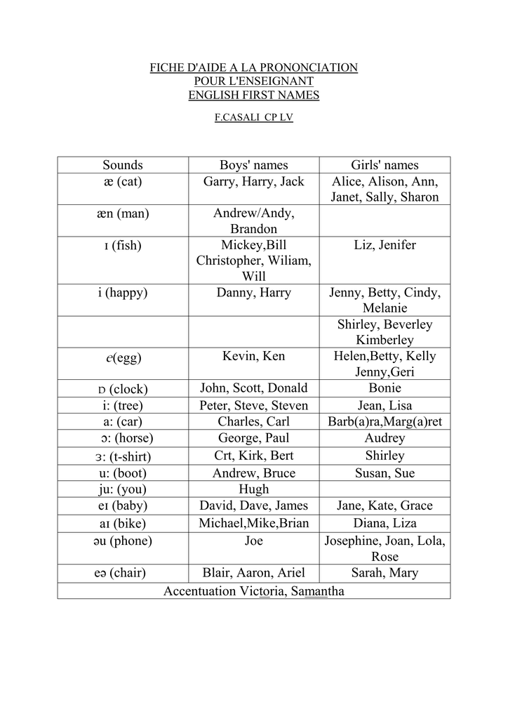 Sounds Boys` names Girls` names z (cat) Garry, Harry, Jack Alice