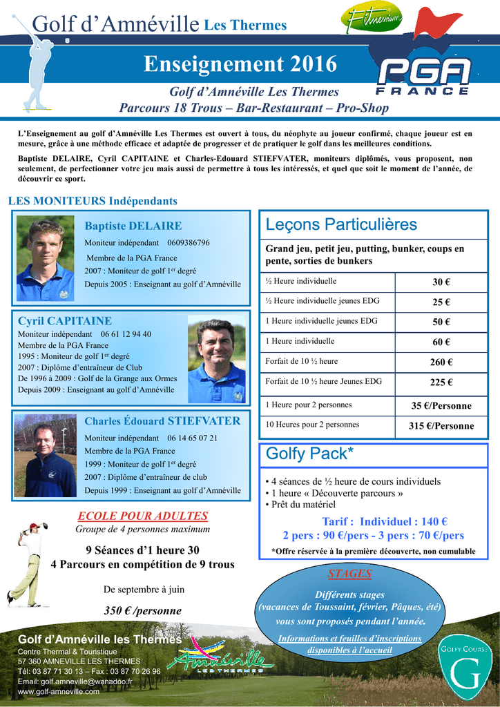 Golf d’Amnéville Les Thermes Enseignement 2016 Golf d’Amnéville Les Thermes Parcours 18 Trous – Bar-Restaurant – Pro-Shop L’Enseignement au golf d’Amnéville Les Thermes est ouvert à tous, du néophyte au joueur confirmé, chaque joueur est en mesure, grâce à une méthode efficace et adaptée de progresser et de pratiquer le golf dans les meilleures conditions. Baptiste DELAIRE, Cyril CAPITAINE et Charles-Edouard STIEFVATER, moniteurs diplômés, vous proposent, non seulement, de perfectionner votre jeu mais aussi de permettre à tous les intéressés, et quel que soit le moment de l’année, de découvrir ce sport. LES MONITEURS Indépendants Baptiste DELAIRE Moniteur indépendant 0609386796 Membre de la PGA France Leçons Particulières Grand jeu, petit jeu, putting, bunker, coups en pente, sorties de bunkers 2007 : Moniteur de golf 1er degré Depuis 2005 : Enseignant au golf d’Amnéville Cyril CAPITAINE Moniteur indépendant 06 61 12 94 40 Membre de la PGA France 1995 : Moniteur de golf 1er degré 2007 : Diplôme d’entraîneur de Club De 1996 à 2009 : Golf de la Grange aux Ormes Depuis 2009 : Enseignant au golf d’Amnéville ½ Heure individuelle 30 € ½ Heure individuelle jeunes EDG 25 € 1 Heure individuelle jeunes EDG 50 € 1 Heure individuelle 60 € Forfait de 10 ½ heure 260 € Forfait de 10 ½ heure Jeunes EDG 225 € 1 Heure pour 2 personnes Charles Édouard STIEFVATER Moniteur indépendant 06 14 65 07 21 Membre de la PGA France 1999 : Moniteur de golf 1er degré 2007 : Diplôme d’entraîneur de club Depuis 1999 : Enseignant au golf d’Amnéville ECOLE POUR ADULTES Groupe de 4 personnes maximum 9 Séances d’1 heure 30 4 Parcours en compétition de 9 trous De septembre à juin 350 € /personne Golf d’Amnéville les Thermes Centre Thermal & Touristique 57 360 AMNEVILLE LES THERMES Tél: 03 87 71 30 13 – Fax : 03 87 70 26 96 Email: [email protected] www.golf-amneville.com 10 Heures pour 2 personnes 35 €/Personne 315 €/Personne Golfy Pack* • 4 séances de ½ heure de cours individuels • 1 heure « Découverte parcours » • Prêt du matériel Tarif : Individuel : 140 € 2 pers : 90 €/pers - 3 pers : 70 €/pers *Offre réservée à la première découverte, non cumulable STAGES Différents stages (vacances de Toussaint, février, Pâques, été) vous sont proposés pendant l’année. Informations et feuilles d’inscriptions disponibles à l’accueil Golf d’Amnéville Les Thermes Enseignement 2016 Vous désirez suivre une initiation au golf? Obtenir votre carte verte, votre premier classement, jouer au golf avec régularité ou, tout simplement, prendre plus de plaisir à jouer ? Nous vous proposons une découverte de l'activité au travers de nos deux formules: en individuel, à 2, par petits groupes de 3, ou en collectif de 5 à 8 personnes. Golfeurs Non golfeurs Découverte Initiation Perfectionnement Jeu INITIATION GRATUITE Pass GO for GOLF Sur 1 mois GOLFY LIBERTE OU DECOUVERTE Stage 5 mois CARTE VERTE Accès Parcours tous les 15 jours pendant 1h30 Prêt du matériel Balles fournies Validation d’un premier niveau de jeu Apprentissage des fondamentaux Autonomie sur un parcours 18 trous 59€/pers Validité 1 mois • • • • 4 heures de cours collectifs 4 seaux de balles Prêt du matériel sur demande Remise d’une attestation de participation GOLFY LIBERTE GOLFY DECOUVERTE En individuel, à 2 ou à 3 En collectif et à volonté, de 5 à 8 personnes Vous désirez obtenir votre carte verte à votre rythme en organisant vos cours selon votre planning ? A volonté, en cours collectifs pendant 3 mois, vous découvrirez les différents compartiments du jeu : putting, chipping, grands coups et stratégie de jeu Vous choisissez vous-même les heures de vos séances et de vos parcours accompagnés en fonction des disponibilités de votre professeur. Vous participez aux cours de règles organisés le dernier vendredi de chaque mois (18h00-19h00) PROGRAMME 1er mois Individuel 2 personnes 3 personnes 9 Heures de cours 13 heures de cours 16 heures de cours Cours individuels et cours de règles le dernier vendredi de chaque mois (18h00 – 19h00) 2ème & 3ème mois Cours individuels (suite) + Cours de Règles 3 Parcours accompagnés d’1h30 2 Parcours 9 trous en autonomie 4ème & 5ème mois Cours de règles 2 Parcours accompagnés d’1h30 3 Parcours 9 trous en autonomie Abonnement de 2 mois au parcours 18 trous en accès illimité. Passage de la carte verte 625€ 595€ 550€ Par pers Par pers PROGRAMME 1er mois : Cours collectifs 2ème mois : Cours collectifs + parcours accompagnés (4 pers max) 3ème mois : Cours collectifs + parcours accompagnés + 5 Parcours 9 Trous 4ème et 5ème mois : Abonnement de 2 mois au golf 18 trous - Accès illimité au parcours, passage de la carte verte HORAIRES COURS COLLECTIFS* : Mercredi : 18h00 - 19h00 Vendredi : 18h00 - 19h00 Samedi : 9h00 – 10h00 Dimanche : 10h00 - 11h00 *Cours de règle le dernier vendredi de chaque mois HORAIRES PARCOURS ACCOMPAGNES* : Vendredi : 16h30 - 18h00 Dimanche : 08h30 - 10h00 *1 Pro pendant 1h30 en groupe de 4 personnes 490€/pers Vos avantages GOLFY LIBERTE – GOLFY DECOUVERTE Carte de practice avec 10 unités & accès aux zones d’entraînement Location d’une ½ série pour les 5 mois: 50 € (Caution 110 €) 10 % de réduction sur l’achat de votre première série de club au pro-shop du golf Abonnement de deux mois sur le parcours 18 trous Bénéficiez de 15% de réduction sur votre première cotisation annuelle Pour compléter votre formation, nous vous offrons la possibilité de prendre, en plus de l’une ou de l’autre de nos formules, 6 x 1/2heure de cours avec le pro de votre choix au tarif préférentiel de 150€ au lieu de 180€.