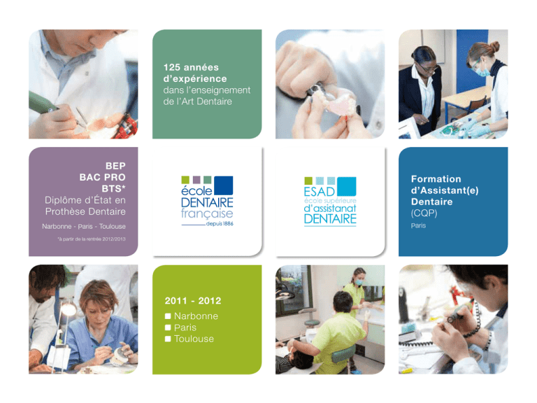125 années d’expérience dans l’enseignement de l’Art Dentaire BEP BAC PRO BTS* Diplôme d’État en Prothèse Dentaire Formation d’Assistant(e) Dentaire (CQP) Paris Narbonne - Paris - Toulouse *à partir de la rentrée 2012/2013 2011 - 2012 Narbonne P aris Toulouse Vous cherchez un métier dans le secteur de la Santé, qui offre de réelles opportunités d’emploi ? L’École Dentaire Française, reputée depuis 125 ans dans le domaine des métiers de la Santé, vous permet d’accéder aux métiers de la prothèse dentaire et de l’assistanat dentaire. Elle propose plusieurs formules pédagogiques adaptées à tous les niveaux de formation et à tous les âges, permettant ainsi d’atteindre le plus haut niveau de diplôme délivré par l’État ou la branche professionnelle. L’École Dentaire Française reste fidèle à ses valeurs d’éthique et d’humanisme. Vous trouverez dans notre établissement une équipe à votre écoute et profondément engagée dans les objectifs de votre réussite scolaire et professionnelle. sommaire 2 Prothèse dentaire : le métier 03 Prothèse dentaire : l’organisation des études 04 Étudier la prothèse dentaire à l’École Dentaire Française 06 Assistanat dentaire : le métier 08 Assistanat dentaire : le programme pédagogique 10 S’inscrire à la formation de l’École Supérieure d’Assistanat Dentaire 11 témoignage Prothèse Dentaire : le métier Corenti n GRA ND ET Elève en Prothèse Dentaire «Le monde du travail n’est plus un secret pour moi» Le métier de prothésiste dentaire consiste à créer ou réparer des appareils de prothèse dentaire ou des dispositifs de restauration buccale, d’après les instructions et les empreintes des praticiens : chirurgiensdentistes, orthodontistes ou stomatologues. L’objet de la Prothèse Dentaire est la réhabilitation du système manducateur par sculpture, modelage, moulage ou contremoulage. Cette profession demande de la minutie, de l’habileté et un sens esthétique développé. Mais aussi un esprit ouvert aux nouvelles technologies, en raison de l’évolution permanente des techniques et des matériaux, et de l’apparition de nouveaux équipements de fabrication. La profession de Prothésiste Dentaire se pratique dans un laboratoire attaché à un cabinet dentaire, à une clinique dentaire, à un service hospitalier, ou dans un laboratoire indépendant, de structure artisanale ou industrielle. Le Prothésiste Dentaire diplômé a la possibilité de créer son propre laboratoire, et de devenir ainsi Chef d’entreprise. La profession est caractérisée par un taux important de professionnels indépendants : environ 16.000 personnes en France travaillent dans un peu plus de 4.000 laboratoires (soit un «patron prothésiste» pour trois salariés). J’ai choisi l’École Dentaire Française en premier lieu pour sa renommée. J’étais convaincu de mon choix d’orientation en prothèse dentaire, mais les témoignages d’anciens élèves m’ont aussi persuadé de m’inscrire ! Notre formation est ciblée et il faut faire preuve d’une grande détermination pendant les études… La charge de travail est relativement importante et une grande partie se concentre au laboratoire, mais une bonne organisation et de l’assiduité permettent de réussir. Les enseignants nous soutiennent en répondant à toutes nos interrogations et le travail en laboratoire donne lieu à beaucoup d’échanges. La connaissance du métier de nos professeurs principaux est un avantage pour un élève de cette école. En plus les stages en entreprise sont nombreux. Ils viennent compléter la formation et permettent de comprendre plus facilement les cours. L’École Dentaire Française accompagne les élèves pour trouver un stage, mais j’ai réussi à en trouver par moimême - c’est le début de mon intégration dans le monde du travail ! 3 Prothèse Dentaire : l’organisation des études Les études conduisant au métier de Prothésiste Dentaire sont organisées en deux cycles et trois diplômes : Le premier cycle est constitué par le Baccalauréat Professionnel de Prothèse Dentaire, qui se déroule en trois années. Après la première année d’études, l’élève de Baccalauréat Professionnel pourra obtenir un Brevet d’Études Professionnelles d’Auxiliaire en Prothèse Dentaire, et entrer directement dans la vie active. Au terme des trois années de ce premier cycle, le diplôme obtenu sera un Baccalauréat Professionnel de Technicien en Prothèse Dentaire, permettant d’occuper un emploi qualifié dans un laboratoire de prothèse dentaire, un cabinet dentaire ou un établissement de soins. Des passerelles sont possibles pour des élèves déjà diplômés d’un Baccalauréat. L’obtention du BTS de Prothésiste Dentaire sera très probablement indispensable pour ouvrir ou reprendre un laboratoire de prothèse dentaire. Les étudiants bacheliers non-titulaires du Baccalauréat Professionnel de Prothèse Dentaire devront suivre une année de mise à niveau pour pouvoir intégrer le BTS. BTS Technicien Supérieur Prothésiste Dentaire BAC PRO Technicien en Prothèse Dentaire Le second cycle, de deux années, sera constitué par un Brevet de Technicien Supérieur (BTS). Ce niveau d’études sera introduit dans les écoles de Prothèse Dentaire par le Ministère de l’Éducation à partir de la rentrée 2012/2013. BEP Auxiliaire en Prothèse Dentaire 0 4 Classe préparatoire au BTS BAC pro BEP 1 2 BAC+2 3 4 5 Les enseignements professionnels du programme pédagogique : Le référentiel du BAC Pro de Prothèse Dentaire ENSEIGNEMENTS PROFESSIONNELS : S1 Anatomie & physiologie S2 Morphologie et Dessin morphologique S3/S4/S6 S5 Prothèse adjointe partielle en résine Châssis métalliques + conception et fabrication assistées par ordinateur Prothèse adjointe maxillo-mandibulaire Prothèse fixe + conception et fabrication assistées par ordinateur Orthodontie Préparation 