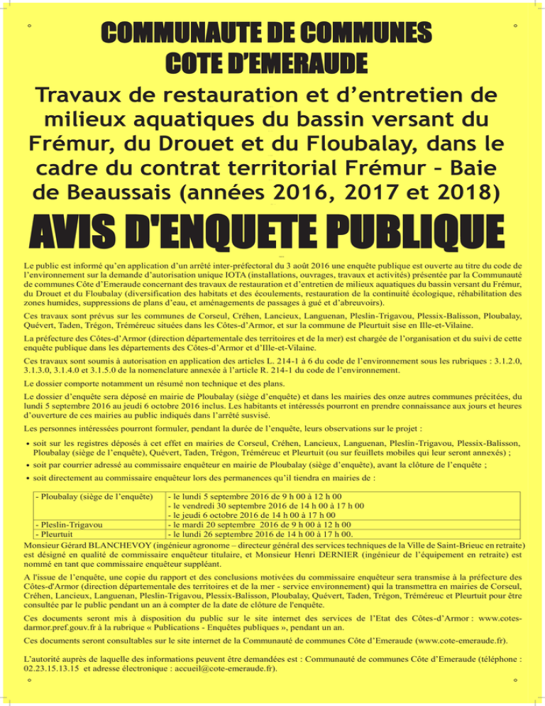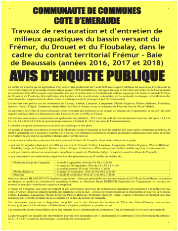 COMMUNAUTE DE COMMUNES COMMUNAUTE DE COMMUNES COTE D’EMERAUDE COTE D’EMERAUDE Travaux de restauration et d’entretien de Travaux restauration et d’entretien de milieux de aquatiques du bassin versant du milieuxdu aquatiques versant dule Frémur, Drouet etdu dubassin Floubalay, dans Frémur, Drouetterritorial et du Floubalay, le cadre duducontrat Frémurdans – Baie cadre du contrat territorial Frémur Baie de Beaussais (années 2016, 2017 et –2018) de Beaussais (années 2016, 2017 et 2018) AVIS D'ENQUETE PUBLIQUE AVIS D'ENQUETE PUBLIQUE Le public est informé qu’en application d’un arrêté inter-préfectoral du 3 août 2016 une enquête publique est ouverte au titre du code de l’environnement sur la demande d’autorisation unique IOTA (installations, ouvrages, travaux et activités) présentée par la Communauté de communes Côte d’Emeraude concernant travaux de restauration d’entretien de milieux duouverte bassin versant Le public est informé qu’en application d’undes arrêté inter-préfectoral du et 3 août 2016 une enquêteaquatiques publique est au titre du du Frémur, code de du Drouet et du Floubalay (diversification des unique habitatsIOTA et des(installations, écoulements,ouvrages, restauration de laetcontinuité des l’environnement sur la demande d’autorisation travaux activités) écologique, présentée parréhabilitation la Communauté zones humides,Côte suppressions de concernant plans d’eau,des et travaux aménagements de passages à gué et d’abreuvoirs). de communes d’Emeraude de restauration et d’entretien de milieux aquatiques du bassin versant du Frémur, du Drouet du Floubalay habitats etCréhen, des écoulements, restauration Pleslin-Trigavou, de la continuité écologique, réhabilitation des Ces travauxet sont prévus sur(diversification les communesdes de Corseul, Lancieux, Languenan, Plessix-Balisson, Ploubalay, zones humides, de plans d’eau,dans et aménagements de passages et d’abreuvoirs). Quévert, Taden, suppressions Trégon, Tréméreuc situées les Côtes-d’Armor, et sur laà gué commune de Pleurtuit sise en Ille-et-Vilaine. Ces travaux sont sur les communes de Corseul, Créhen, Lancieux,etLanguenan, Pleslin-Trigavou, Plessix-Balisson, Ploubalay, La préfecture des prévus Côtes-d’Armor (direction départementale des territoires de la mer) est chargée de l’organisation et du suivi de cette Quévert, Taden, Trégon, situées les Côtes-d’Armor, et sur la commune de Pleurtuit sise en Ille-et-Vilaine. enquête publique dans lesTréméreuc départements desdans Côtes-d’Armor et d’Ille-et-Vilaine. La dessoumis Côtes-d’Armor (direction départementale des territoires la mer) chargée de l’organisation et du suivi: de cette Cespréfecture travaux sont à autorisation en application des articles L. 214-1età de 6 du code est de l’environnement sous les rubriques 3.1.2.0, enquête publique lesde départements des Côtes-d’Armor et d’Ille-et-Vilaine. 3.1.3.0, 3.1.4.0 et dans 3.1.5.0 la nomenclature annexée à l’article R. 214-1 du code de l’environnement. Ces travauxcomporte sont soumis à autorisation en application des articles L. 214-1 à 6 du code de l’environnement sous les rubriques : 3.1.2.0, Le dossier notamment un résumé non technique et des plans. 3.1.3.0, 3.1.4.0 et 3.1.5.0 de la nomenclature annexée à l’article R. 214-1 du code de l’environnement. Le dossier d’enquête sera déposé en mairie de Ploubalay (siège d’enquête) et dans les mairies des onze autres communes précitées, du Le dossier comporte notamment résumé2016 non inclus. technique des plans. lundi 5 septembre 2016 au jeudi 6unoctobre Lesethabitants et intéressés pourront en prendre connaissance aux jours et heures d’ouverture de ces mairies au public l’arrêté(siège susvisé. Le dossier d’enquête sera déposé en indiqués mairie dedans Ploubalay d’enquête) et dans les mairies des onze autres communes précitées, du lundi 5 septembre 2016 aupourront jeudi 6 octobre 2016 inclus.laLes habitants et intéressés pourront en prendre connaissance aux jours et heures Les personnes intéressées formuler, pendant durée de l’enquête, leurs observations sur le projet : d’ouverture de ces mairies au public indiqués dans l’arrêté susvisé. soit sur les registres déposés à cet effet en mairies de Corseul, Créhen, Lancieux, Languenan, Pleslin-Trigavou, Plessix-Balisson, LesPloubalay personnes(siège intéressées pourrontQuévert, formuler, pendant la durée de l’enquête, leurs observations sur mobiles le projetqui : leur seront annexés) ; de l’enquête), Taden, Trégon, Tréméreuc et Pleurtuit (ou sur feuillets soit par sur courrier les registres déposés à cet effet enquêteur en mairiesen demairie Corseul, Créhen, Lancieux, Languenan, Pleslin-Trigavou, Plessix-Balisson, adressé au commissaire de Ploubalay (siège d’enquête), avant la clôture de l’enquête ; Ploubalay (siège de l’enquête), Quévert, Taden, Trégon, Tréméreuc et Pleurtuit (ou sur feuillets mobiles qui leur seront annexés) ; soit directement au commissaire enquêteur lors des permanences qu’il tiendra en mairies de : soit par courrier adressé au commissaire enquêteur en mairie de Ploubalay (siège d’enquête), avant la clôture de l’enquête ; - Ploubalay (siège l’enquête) enquêteur - le lundi septembre 2016 de 9 htiendra 00 à 12en h 00 soit directement au de commissaire lors5 des permanences qu’il mairies de : - le vendredi 30 septembre 2016 de 14 h 00 à 17 h 00 -- le 2016 de de 14 9h h0000à à1712h h0000 - Ploubalay (siège de l’enquête) le jeudi lundi 65 octobre septembre 2016 - Pleslin-Trigavou -- le le vendredi mardi 20 30 septembre 2016 dede 9 h1400h à0012à h1700h 00 septembre 2016 - Pleurtuit - le lundi septembre deh14 jeudi 626octobre 20162016 de 14 00hà00 17àh17 00h 00. - Pleslin-Trigavou - le mardi 20 septembre 2016 de 9 hdes 00 services à 12 h 00techniq