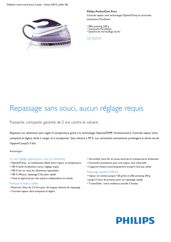 Dépliant avant-vente pour le pays : Suisse (2013, juillet 26) Philips PerfectCare Pure Centrale vapeur avec technologie OptimalTemp et cartouche anticalcaire PureSteam • Effet pressing 240 g • Cartouche PureSteam • Système de verrouillage du fer GC7635/31 Repassage sans souci, aucun réglage requis Puissante, compacte, garantie de 5 ans contre le calcaire Repassez vos vêtements sans régler la température grâce à la technologie OptimalTEMP révolutionnaire. Centrale vapeur ultracompacte et légère, facile à ranger et à transporter. Sans calcaire à 99 %. Les cartouches anticalcaires prolongent la durée vie de l'appareil jusqu'à 5 fois. Avantages Un seul réglage optimal pour tous vos vêtements • OptimalTemp : la combinaison idéale entre vapeur et température • 100 % facile d'utilisation, aucun réglage requis • 100 % sûr sur tous les vêtements repassables • 100 % efficace, repassage 2 fois plus rapide • Testé et approuvé par des experts indépendants en textile Pratique et facile à utiliser • Réservoir d'eau de 1,5 litre pour de longues séances de repassage • Centrale vapeur ultra-compacte et légère • Verrouillez votre fer en toute sécurité et transportez-le facilement • Cartouche anticalcaire pour une vapeur sans impuretés • L'appareil s'éteint automatiquement lorsqu'il n'est pas utilisé Repassage rapide et efficace • Vapeur en continu jusqu'à 120 g/min et effet pressing 240 g • Jusqu'à 5 bars de pression pour un repassage rapide • T-ionicGlide : notre meilleure semelle 5 étoiles PerfectCare Pure Fonctions Technologie OptimalTemp Compacte et légère La technologie OptimalTemp de la centrale vapeur PerfectCare offre toujours un seul réglage parfait grâce aux éléments suivants : - processeur de contrôle intelligent - chambre de vaporisation centrifuge Grâce à son design ultra-compact, cet appareil est facile à ranger. Vous n'aurez plus jamais de problème de place ! Très léger, l'appareil est facile à transporter. Son fer léger vous permet de repasser confortablement. 100 % facile d'utilisation Verrouillez votre fer en toute sécurité 100 % facile d'utilisation, aucun réglage requis. Vous pouvez désormais repasser tous vos vêtements en une seule fois, sans avoir à attendre ou régler la température. Verrouillez votre fer vapeur Philips en toute sécurité et transportez facilement votre centrale vapeur. 100 % sûr Cartouche anticalcaire PureSteam 100 % efficace sur les tissus les plus difficiles : repassage 2 fois plus rapide. La supériorité des cartouches anticalcaires PureSteam remplaçables est prouvée ; elles filtrent de jusqu'à 99 % du calcaire des centrales vapeur, même lorsque l'eau est dure. L'appareil est garanti 5 ans contre les problèmes dus au calcaire. La vapeur est propre et la durée de vie du produit est multipliée par 5. Intelligent, le système vous avertit lorsque la cartouche doit être remplacée. Une cartouche dure en moyenne 3 mois. Pour continuer à utiliser votre appareil, vous pouvez soit utiliser de l'eau déminéralisée en gardant l'ancienne cartouche, soit remplacer la cartouche. 2 cartouches sont incluses Testé et approuvé par des experts : Arrêt automatique 100 % sûr sur les tissus les plus délicats tels que la soie, le cachemire, la laine, le polyester. Des instituts de test indépendants ont utilisé PerfectCare sur les vêtements les plus délicats et confirmé l'excellence de ses performances. 100 % efficace Testé et approuvé par des instituts indépendants experts en textile Réservoir d'eau de 1,5 litre La fonction Arrêt automatique du fer Philips éteint automatiquement l'appareil s'il n'a pas été utilisé depuis 10 minutes, afin d'économiser de l'énergie. Débit vapeur 120 g/min et effet pressing 240 g Cette centrale vapeur ultra-compacte est équipée d'un réservoir d'eau de 1,5 l vous permettant de repasser jusqu'à 2 h 30 avant de le remplir à nouveau. PerfectCare Pure génère un puissant débit vapeur continu jusqu'à 120 g/min et un effet pressing jusqu'à 240 g. Idéal pour une élimination rapide et efficace des faux plis, ainsi que pour un défroissage vertical. Les données sont sujettes à changement 2013, juillet 26 PerfectCare Pure Jusqu'à 5 bars Semelle T-ionicGlide Repassez deux fois plus vite grâce à la vapeur de votre fer Philips. Elle pénètre au cœur du tissu, pour un repassage rapide et aisé, même sur des tissus difficiles. La semelle T-ionicGlide est la semelle haut de gamme Philips, conférant aux appareils PerfectCare de Philips une glisse et une résistance aux rayures exceptionnelle. Le nouveau revêtement breveté offre d'excellents résultats. Sa forme et ses orifices soigneusement conçus permettent une répartition uniforme de la vapeur, pour une élimination facile des faux plis. Descriptions Notez que ceci est un dépliant avant-vente. Le contenu de ce dépliant reflète nos connaissances à la date et pour le pays mentionnés ci-dessus. Le contenu de ce dépliant est susceptible d'être modifié sans avis préalable. Philips décline toute responsabilité quant au contenu de ce dépliant. Élimination des faux plis facilitée Semelle Technologie OptimalTemp Débit vapeur Défroissage vertical Pression vapeur Pointe à vapeur additionnelle Alimentation Effet pressing Débit vapeur continu Système anticalcaire T-ionicGlide Oui Eau du robinet utilisable Solution anticalcaire Rappel de détartrage Oui Oui Jusqu'à 5 bar(s) Oui Range-cordon Longueur du câble Sûr pour tous les textiles Longueur du cordon d'alimentation Poids du fer Poids du fer + base Dimensions du produit Dimensions de l'emballage 2 400 W 240 g 120 g/min 1 500 ml Orifice de remplissage extra-large 40 x 23 x 28 cm Réglage ECO Consommation d'énergie réduite de 30 % Dimensions de l'emballage 2 min Oui Système de verrouillage Compartiment de rangement du cordon Cordon à clip 1,6 m Même délicats comme la soie 1,8 m Version: 6.0.1 EAN: 08710103