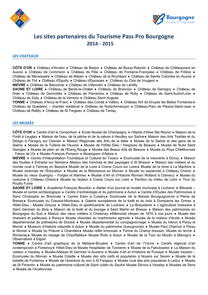 Les sites partenaires du Tourisme Pass Pro Bourgogne 2014 - 2015 LES CHATEAUX CÔTE D'OR Château d'Arcelot Château de Barjon Château de Bussy-Rabutin Château de Châteauneuf en Auxois Château de Commarin Château de Flée Château de Fontaine-Française Château de Frôlois Château de Menessaire Château de Malain Château de la Rochepot Château de Sainte Colombe en Auxois Château de Thil Château d'Eguilly Château d'Epoisses Château du Clos de Vougeot NIEVRE Château de Bazoches Château de Villemolin Château de Lantilly SAONE ET LOIRE Château de Berzé-le-Châtel Château de Brancion Château de Demigny Château de Drée Château de Germolles Château de Pierreclos Château de Rully Château de Saint-Aubin/Loire Château de Sully Château de la Verrerie Château Saint Hugues YONNE Château d’Ancy-le-Franc Château des Condé à Vallery Château fort de Druyes les Belles Fontaines Château de Guédelon – chantier médiéval Château de Nuits/Armançon Château-Parc de Plessis-Saint-Jean Château de Ratilly Château de St Fargeau Château de Tanlay LES MUSEES CÔTE D'OR Centre d'art le Consortium Ecole Musée de Champagny Hôpital d'Alise Ste Reyne Maison de la Forêt à Leuglay Maison de l'eau, de la pêche et de la nature à Heuilley sur Saône Maison des Arts Textiles et du Design à Flavigny sur Ozerain Maison Régionale des Arts de la table Musée de la Saône et des gens de la Saône Musée de la Tuilerie de l'Auxois Musée de l'Hôtel Dieu / Hospices de Beaune Musée de Nuits Saint Georges Musée de plein air de l'Etang Rouge Musée des Beaux Arts de Beaune Musée du Pays Châtillonnais - Trésor de Vix Musée François Pompon Muséoparc d'Alésia NIEVRE Centre d’Interprétation Touristique et Culturel du Toueur Ecomusée de la meunerie à Donzy Maison des fouilles à Entrains sur Nohain Maison des hommes et des paysages à St Brisson Maison des métiers et du monde rural à Tamnay en Bazois Musée de la Loire à Cosne Cours sur Loire Musée de la mine à La Machine Musée nivernais de l’Education Musée de la Résistance en Morvan Musée du septennat à Château Chinon Musée du vieux Guérigny – Forges et Marines Musée d’Art et d’Histoire Romain Rolland à Clamecy Musée du costume à Château Chinon Musée du facteur à Cosne Cours sur Loire Pavillon du milieu de Loire Tour du Pouilly Fumé SAONE ET LOIRE Académie François Bourdon Atelier d’un journal et musée municipal à Louhans Bibracte – Musée et centre archéologique Centre d’archéologie et du patrimoine à Autun Centre d’Etudes des Patrimoines à Saint Christophe en Brionnais Centre Eden à Cuisery Ecomusée de la Bresse Bourguignonne à Pierre de Bresse Ecomusée du Creusot-Montceau Galerie européenne de la forêt et du bois à Dompierre les Ormes Hôtel-Dieu - Musée Greuze Hôtel-Dieu et apothicairerie de Louhans La Briqueterie L’agriculture bressane à Saint Germain du Bois Maison de la forêt et du bocage à Saint Martin en Bresse Maison des patrimoines en Bourgogne du Sud Maison des vieux métiers à Chatenay Mémorial citoyen de 1870 à nos jours Musée des chaisiers et pailleuses à Rancy Musée charolais du machinisme agricole Musée de la maison d’école Musée départemental de préhistoire de Solutré Musée départemental du compagnonnage Musée du hiéron à Paray le Monial Museum d’histoire naturelle à Autun Musée du patrimoine Gueugnonais Musée Paul Charnoz à Paray le Monial Musée du Prieuré à Charolles Musée reflet brionnais Ferme du Champ bressan, Musée du terroir à Romenay Musée du tissage de Chauffailles Musée Rolin à Autun Musée de la Tour du Moulin à Marcigny Observaloire à Digoin YONNE Centre d’art graphique de la Métairie-Bruyère Centre d’art de l’Yonne Centre régional d’art contemporain à Fontenoy Hôtel-Dieu et Musée Hospitalier de Tonnerre Musée de la Fabuloserie La Maison du visiteur à Vezelay Musée-Abbaye St Germain à Auxerre Musée d’art et d’histoire de Puisaye Musée Vauban – Ecomusée du Morvan Musée Colette Musée des arts naïfs et populaires à Noyers sur Serein Musée de la bataille de Fontenoy Musée de l’aventure du son à St Fargeau Musée rural des arts populaires à Laduz Musée de St Florentin Musée du patrimoine culturel de Saint Julien du Sault Musée Zervos à Vezelay Musées de Sens Musée de l’Avallonnais LES SITES, JARDINS ET MONUMENTS CÔTE D'OR Abbaye de Cîteaux Abbaye de Fontenay Abbaye ND de Oigny sur Seine Apothicairerie de Moutiers St Jean Chapelle, Jardin et parc du Château de Montigny-sur-Aube Collégiale Notre Dame à Beaune (Tapisserie de la Vie de la Vierge) Grande Forge de Buffon Grottes de Bèze Jardin de plantes textiles à Flavigny sur Ozerain Jardin et Parc de Barbirey Moulin Sorine Muséoparc d’Alésia Site Gallo Romain de l'Ecartelot Tour de l'Orle d'Or à Semur en Auxois Tour Philippe le Bon à Dijon Visites audio-guidées de Beaune Visites de la cité médiévale de Semur-en-Auxois Visites de Dijon : "Dijon Découverte" Visites de Dijon : "Au fil du temps" Visites Puits de Moise Dijon (sans guide) Visites de Gevrey-Chambertin Visites de Nuits St Georges Visites guidées de la ville de Châtillon sur Seine NIEVRE Visite audio-vidéo guidée de l’Abbaye de Corbigny avec tablette tactile Visites guidées de la Charité/Loire Visites guidées de Decize Visites guidées de Pougues les Eaux Visites audio-guidées de Nevers SAONE ET LOIRE Abbaye de Cluny Les Carrières de la Lie à la Roche Vineuse Chapelle des moines de Berzé la Ville Découverte interactive de la Cité médiévale de Cluny avec tablette tactile Grottes d’Azé Grottes de Blanot Haras national de Cluny Jardin au Pays des Fées à Ameugny Les Fours à chaux à Vendenesse lès Charolles Monastère orthodoxe d’Uchon Moulin de Montjay, maison de l’eau à Ménetreuil Temple des 1000 Boudhas Visite guidée de Bourbon-Lancy Visites guidées de Montceau-les-Mines, Le Creusot et Montcenis Visites gui