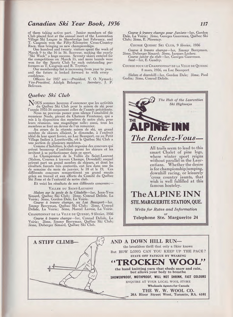 Canadian Ski Year Book, 1936 of them taking active part. Junior members of the Club placed first at the annual meet of the Laurentian Village Ski League in Shawbridge last February, and T. Casgrain won the Fifty-Kilometre Cross-Country Race, thus bringing us new championships. One hundred and twenty visitors spent the week of March 9 to the 16 in St. Sauveur, making the yearly "Ski Week" a huge success. Seventy skiers entered for the competitions on March 15, and more laurels were won for the Sports Club by such outstanding performers as T. Casgrain and R. Trottier. Our membership list is increasing from year to year, and the future is looked forward to with every confidence. Officers for 1937 are:-Presidenl, V. O. Nymark; Vice-President, Adolph Belanger; Secretary, J. P. Beliveau. 117 Course a travers champs pour Juniors-ler, Gordon Dale, La Voirie; 2eme, Georges Gauvreau, Quebec Ski Club; 3eme, E. Morency. COURSE QUEBEC SKI CLUB, 9 fevrier, 1936 travers champs-ler, Jimmy Berryman, 2eme, Duberger Simard; 3eme, Jacques Leclerc. COllrse Junior du club-ler, Georges Gauvreau. Saul - ler, E. Gaudry. Course a COURSE POUR LE CHAMPIONNAT DE LA VILLE DE QUEBEC 8 mars, 1936, au Lac Beauport Slalom el downhill-Ier, Gordon Dale; 2eme, Paul Godin; 3eme, Conrad Delisle. Quebec Ski Club N OUS sommes heureux d'annoncer que les activites du Quebec Ski Club pour la saison de ski pour l'annee 1935-36 surpassent celles de l'annee precedente. Nous ne pouvons passer sous silence l'amabilite de monsieur Neale, gerant du Chateau Frontenac, qui a mis a la disposition des membres de notre club, pour leurs reunions, une magnifique salle; aussi, tous les membres se font un devoir de l'en remercier. Au cours de la recente saison de ski, un grand nombre de skieurs allaient, Ie dimanche, l'endroit ideal de leur sport favori, .au Lac Beauport, ou au Petit Village Indien a .Loretteville, oll Ie Quebec Ski Club a une section de plusieurs membres. Comme d'habitUre, Ie club organisa des COncours qui creent beaucoup d'ambition parmi les skieurs et les invitent a se perfectionner dans ce sport. Le Championnat de la Vallee du Saint-Laurent (Slalom, Courses a travers Champs, Downhill) auquel prirent part un grand nombre de skieurs, et dont les resultats furents tres contestes, eut lieu dans une fin de semaine du mois de janvier, Ie 18 et Ie 19, Ces differents concours remporterent un grand succes grace au travail et aux efforts du ComiteS du Quebec Ski Zone et de l'executif de notre club. Et voici les resultats de nos differents concours;VALLEE DU SAINT-LAURENT Slalom .mr la pente de la Citadelle-ler, Tean-Yves Simard, Quebec Ski Club; 2eme, Conrad Delisle, La Voirie; 3hne, Gordon Dale, La Voirie. The Hub of the Lqurentian Ski Highways INN a Course a travers champs, au Lac Beauport-ler, Jimmy Berryman, Quebec Ski Club; 2eme, Conrad Delisle, La Voirie; 3eme, Marcel Lavoie, La Voirie. CHAMPIONNAT DE LA VILLE DE QUEBEC, 9 fevrier, 1936 Course travers champs-ler, Conrad Delisle, La Voirie; 2eme, Jimmy Berryman, Quebec Ski Club; 3eme, Duberger Simard, Quebec Ski Club. a The Rendez-VousAll trails seem to lead to this smart Chalet of pine logs, where w'inter sport reigns without parallel in the Laurentians. Whether the desire is for championship jumping, downhill racing, or leisurely 'cross coun try j a un ts, that wish is well ful£lled a t this famous hostelry. The ALPINE INN STE.MARGUERITE STATION,QUE. Write for R.ates and Information or Telephone Ste. Marguerite 24 AND A DOWN HILL RUNthe breathless thrill that only a Skier knows But HOW LONG CAN YOU KEEP UP THE PACE? STAVE OFF FATIGUE BY WEARING "TROCKEN \vOOL" the hand knitting yarn that sheds snow and rain, but allows your body to breathe SHOWERPROOF, MOTHPROOF, WILL NOT SHRINK, FAST COLOURS ENQUIRE AT YOUR LOCAL WOOL STORE Wholesale Agents for Canada THE W. W. WOOL CO. 20A Bloor Street West, Toronto, RA. 6101 Canadian Ski Year Book, 1936 118 Combine Slalom el downhill-ler Jean-Yves Simard · 2eme, Georges G a u v r e a u . ' , Course Slalom du Quebec Ski Club- Ier Jean-Yves Simard; 2eme, Georges Gauvreau. ' Course downhill-Ier, J ean- Yves Simard· Roger Simmons. ' 2eme, COURSE DU QUEBEC SKI CLUB 8 milles, a Loretteville, 5 janvier, 1936 ler, Duberger Simard; 2eme, Georges Gauvreau; 3eme, Jacques Leclerc. Malgre les temps durs que nous traversons, Ie club. la 'Section de Loretteville comprise, a pu recruter 197 membres. Tous ont semble etre tres satisfaits des activites de la saison d'hiver; lorsque la temperature n' etait pas favorable ponr Ie ski, Ie "Ping Pon"" a ete ?ien populaire, sans ouhlier un peu de danse d~ temps a autre. . U~ bon ,diner, quelques discours, ainsi que la distnbutton d un grand nombre de coupes et de prix marquerent la fermeture de la saison. Nous sommes des plus satisfaits des conditions financieres de notre club,-notre rapport annuel montre une substantielle balance en banque de $178.00 et aueun cO,mp~e a payer. C;eci es~ une bon~e note pour notre execubf et la ~rochame salson devralt remporter encore plus de succes avec la perspective de la constr';lction d'un tremplin, ainsi que la trentieme anniversUIre du Quebec Ski Club, Ie plus vieux club de ski du Canada. Les officers pour la nouvelle saison sont:-President, Colon.el Ernest Bondeau; Vice-Presidents, Godfrey SchreIber et Jean-Yves Simard; Secretaire-Tresorier, Marcel Manseau; Secreta ire-A rch iviste, Jeannette V ~zina; Secretaire-Correspondanle, Louise Paradi~; Dlrecteurs, MM. J. M. Gillepsie. Albert Laliberte, Charles Talbot et Gustave Gignac; . Direcleur Ii Vie Docteur G. G. Gale; Capitaine, Val Rousseau. CHALET COCHAND Ste. Marguerite Station l Que. The best cross-cou ntry Ski- ing in th e Lau renti ans Skating, Sleighing, Tobogganing Exceptionally good Cuisine Hot and Cold Water in all the rooms Steam Heated throughout 15 Rooms with private bath . HEADQUARTERS FOR LAURENTIAN CROSS-COUNTRY SKI CLUB Write for Booklet EMILE COCHAND, Proprietor Telephone 25 Grand'Mere Ski Club THE SKI SEASON 