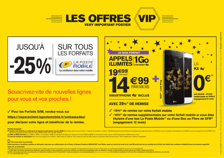 LES OFFRES VIP -25% (6) SUR TOUS LES FORFAITS Souscrivez-vite de nouvelles lignes pour vous et vos proches ! ✓ Pour les Forfaits SIM, rendez-vous sur https://espaceclient.lapostemobile.fr/ambassadeur pour déclarer votre ligne et bénéficier de la remise. LE GIGA FORFAIT APPELS 1Go ILLIMITÉS €99 19 14 PAR MOIS D’INTERNET * €99 + SMARTPHONE PAR MOIS * INCLUS DAS** : 0,523 W/kg JUSQU’À LG K8 * 0 € (12) soit s oit 29,90€ - 29,90€ remboursés en différé engagement 24 mois AVEC 25%(6) DE REMISE ✓ -15% de remise sur votre forfait mobile ✓ -10% de remise supplémentaire sur votre forfait mobile si vous êtes (6) (6) titulaire d’une box La Poste Mobile(7) ou d’une Box ou Fibre de SFR(8) (engagement 12 mois) Forfait incluant : ✓ Appels voix illimités en métropole et depuis la métropole vers les DOM (hors Visio, prix du service des nos majorés et surtaxes) : limités à 129 destinataires/mois et 3 heures max/appel (au-delà facturation à 0,37€/min pour les appels métropolitains et 0,50€/min pour les appels vers les DOM). Pour les communications émises depuis la Zone DOM/COM, voir le Guide Tarifaire. ✓ SMS et MMS illimités (hors SMS+, MMS+ et surtaxes) : SMS en métropole et depuis la métropole vers les DOM et MMS en métropole limités chacun à 250 destinataires différents par mois. ✓ Internet mobile en métropole (hors services payants et surtaxes) : débit réduit au-delà de 1Go et dans la limite de 3Go jusqu’à la prochaine date de facturation. Offre valable avec mobiles compatibles. Kit mains-libres recommandé. Offres soumises à conditions, valables en métropole, réservées aux collaborateurs de La Poste, La Banque Postale et MEDIAPOST, hors filiales, ayant un contrat de travail et un code RH actifs ainsi qu’aux retraités de La Poste (voir détails des conditions d’éligibilité dans les intranets respectifs). Tarifs TTC au 03/05/2016 * 4G : Débit maximum théorique de connexion en réception jusqu’à 115 Mbits/s sous réserve d’un équipement et d’une offre compatibles et uniquement dans les zones de couverture. Réseau 4G en cours de déploiement. Détails de couverture sur www.lapostemobile.fr. ** Le DAS (débit d’absorption spécifique) des téléphones mobiles quantifie le niveau d’exposition maximal de l’utilisateur aux ondes électromagnétiques, pour une utilisation à l’oreille. La réglementation française impose que le DAS ne dépasse pas 2 W/kg. Données constructeurs et visuels non contractuels. Voir détails des conditions et tarifs “Grand Public” en bureau de poste ou sur www.lapostemobile.fr (coût d’une connexion Internet). Voir détails des conditions et tarifs des offres collaborateurs et retraités de La Poste sur votre intranet. Voir renvois (6), (7), (8) et (12) en page 3. - 855 av. Roger Salengro – 92370 Chaville - SAS au capital de 35 000 000 € - RCS Nanterre n° 525 254 736 - TVA intracommunautaire FR 935 252 547 36 - Réalisation : idéographic Paris (16801) Document à usage interne. VERY IMPORTANT POSTIER VERY IMPORTANT POSTIER Tarifs TTC au 03/05/2016 DÉCOUVREZ LES OFFRES “SPÉCIAL COLLABORATEURS ET RETRAITÉS DE LA POSTE”. VIP ✓ -15%(6) de remise sur votre forfait mobile ✓ -10%(6) de remise supplémentaire si vous êtes FORFAITS SIM À chacun son forfait, sans engagement 2H (1) * inclus puis rechargeable 200 Mo * INTERNET inclus puis rechargeable SMS / MMS ILLIMITÉS facturé 0,05€/Mo** en hors forfait SMS / MMS ILLIMITÉS AVEC + PRIX GRAND PUBLIC -15 % (6) * inclus puis rechargeable SMS (FRANCE ET DOM) / MMS ILLIMITÉS + INTERNATIONAL AVEC + Nos meilleurs tarifs vers 120 destinations (4) Musique illimitée(3) 5 Go O U VE AU 2 Go * inclus puis rechargeable FRANCE ET DOM N 200 Mo O U VE AU INTERNET facturé 0,05€/Mo** en hors forfait N BLOQUÉ APPELS ILLIMITÉS APPELS ILLIMITÉS EXISTE EN BLOQUÉ(2) +3€/MOIS (2) Musique illimitée(3) PRIX GRAND PUBLIC 3€99/mois 6€99/mois 3 €94 /mois 12 €99/mois BLOQUÉ 6€99/mois (5) 9€99/mois pendant 6 mois puis 9,99€/mois PRIX « SPÉCIAL COLLABORATEURS ET RETRAITÉS DE LA POSTE » - 15%(6) 5 €39 9€99/mois /mois 8 €49 11€04 /mois /mois BLOQUÉ 5 €49 /mois(5) pendant 6 mois puis 8,49€/mois 9€99/mois (5) 7 pendant 6 mois puis 18,99€/mois €14 8 €49 PAR MOIS (5) /mois pendant 6 mois puis 16,14€/mois PRIX « SPÉCIAL COLLABORATEURS ET RETRAITÉS DE LA POSTE » - 25% EN SOUSCRIVANT UNE BOX LA POSTE MOBILE OU UNE BOX OU FIBRE DE SFR (ENGAGEMENT 12 MOIS) (6) -25 %(6) 2€99 /mois 5€24 /mois 7€49 9€74 /mois /mois B LOQU É (7) 4€49 /mois(5) pendant 6 mois puis 7,49€/mois (8) 7€49 /mois 5€24 /mois(5) pendant 6 mois puis 14,24€/mois Les Forfaits SIM sont soumis à l’achat préalable d’une carte SIM Forfaits à 14,90€ TTC en bureau de poste ou à 9,90€ TTC sur www.lapostemobile.fr (RIB indispensable). Pour les Forfaits SIM + Music, l’écoute et le chargement temporaire de musique depuis un Smartphone ou une tablette sont décomptés de l’Internet mobile inclus dans le forfait. ** Usage Internet mobile en métropole non compris dans le forfait et facturé 0,05€/Mo par palier de 10Ko (hors services payants et surtaxes). Valable avec mobiles compatibles. ✓ Appels voix illimités en métropole et depuis la métropole vers les DOM pour le Forfait SIM 5Go (hors Visio, prix du services des nos majorés et surtaxes) : limités à 129 destinataires/mois et 3 heures maximum par appel (au-delà facturation à 0,37€/min pour les appels métropolitains et 0,50€/min pour les appels vers les DOM). Pour les communications émises depuis la zone DOM/COM voir le Guide Tarifaire. ✓ SMS et MMS illimités (hors SMS+, MMS+ et surtaxes) : SMS en métropole et depuis la métropole vers les DOM pour le Forfait SIM 5Go et MMS en métropole limités chacun à 250 destinataires différents par mois, et sous réserve d’un crédit supérieur à 0,01€ pour les forfaits bloqués. ✓ Internet mob