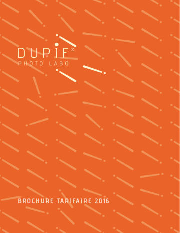 DUPIF ® PHOTO LABO B ROC H U R E TA R I FAIRE 20 16 2 Tarif 2016. Prix en euros TTC 1 rue Littré, 75006 Paris Tél. : 01 42 84 80 60 www.dupifphoto.fr [email protected] Horaires d’ouverture du lundi au vendredi de 9h à 13h et de 14h à 19h, le samedi de 10h à 13h et de 14h à 18h > Sommaire Sommaire Traitement films noir & blanc...................................................................................................4 Tirages noir & blanc..............................................................................................................................5 Traitements films couleur...............................................................................................................6 Tirages couleur.................................................................................................................................7 & 8 Traitements numériques.................................................................................................. 9 & 10 Reproductions, tirages, tableaux et objets.............................................................. 11 Portraits.................................................................................................................................................................12 Cartes/Books.................................................................................................................................................13 Encadrements............................................................................................................................... 14 & 15 Films..........................................................................................................................................................................16 Numérisation vidéo............................................................................................................................ 17 Tarif 2014. Prix en euros TTC 1 rue Littré / 75006 Paris / 01 42 84 80 60 / www.dupifphoto.fr / [email protected] Horaires d’ouverture du lundi au vendredi de 9h à 13h et de 14h à 19h, le samedi de 10h à 13h et de 14h à 18h 3 Traitement films noir & blanc Développement film Développement seul développement + planche contact contact suivant contact seul 135 10,00 15,80 9,60 9,60 120 10,00 15,80 9,60 9,60 Tarif dégressif par quantités groupées sur les développements + planche contact : x 10 = 1 développement + Planche contact gratuite. Film poussé + 20% par diaph. Film vierge : tarif développement seul. Forfaits : Développement + pc + tirages de lecture Papier RC brillant ou perlé 7x10 135 + liseré noir 4 10x10 / 10x15 13x13 / 13x18 45,10 54,50 49,40 59,80 29,10 36,60 30,40 43,90 36,50 120 + liseré noir 10x15 duo : tarif 13x18. Développement + pc + numérisation pro (film entier) 135 120 1 Mo 33,50 30,40 10 Mo 36,50 38,50 18 Mo 49,00 44,00 Développement + pc + tirages de lecture + numérisation pro (film entier) 135 > 120 7x10 10x15 13x18 10x10 13x13 1 Mo 54,80 61,10 71,60 42,10 50,60 10 Mo 61,10 68,50 79,00 45,30 52,70 18 Mo 66,40 74,80 84,30 50,60 57,90 Sommaire Tarif 2016. Prix en euros TTC 1 rue Littré / 75006 Paris / 01 42 84 80 60 / www.dupifphoto.fr / [email protected] Horaires d’ouverture du lundi au vendredi de 9h à 13h et de 14h à 19h, le samedi de 10h à 13h et de 14h à 18h Tirages noir & blanc Reportage Papier rc, brillant ou satiné 10x15 13x18 18x24 24x30 135 2,90 4,20 6,40 9,40 120 3,10 5,10 7,60 11,60 13x18 18x24 24x30 30x40 135 10,90 14,75 22,55 28,80 120 12,45 18,80 24,60 34,50 Négatif isolé, recadrage, liseré noir : + 25%. Semi-professionnel Papier baryté - Brillant ton neutre Négatif isolé, recadrage, liseré noir : + 25%. Professionnel Papier baryté - 5 réf / cf stock, pour exposition, binôme photographe / tireur 135 120 5 13x18 18x24 24x30 30x40 40x50 50x60 25,10 34,10 45,60 59,50 81,90 114,00 Toutes options comprises - virages et traitements alternatifs sur devis. Plaques de verre Contact sur papier RC Tarif semi-professionnel Tirages d’après plaque jusqu’au 4x5” Tarif professionnel Tirages d’après plaque au-delà de 4x5” Scan HD (Cf tarif numérisation) puis tirage au tarif professionnel Tarif 2016. Prix en euros TTC 1 rue Littré / 75006 Paris / 01 42 84 80 60 / www.dupifphoto.fr / [email protected] Horaires d’ouverture du lundi au vendredi de 9h à 13h et de 14h à 19h, le samedi de 10h à 13h et de 14h à 18h Sommaire < Traitements films couleur Développement film négatif Développement seul développement + planche contact Développement + numérisation Développement + bande de lecture 135 8,15 17,45 16,95 19,95 120 9,95 19,45 20,10 2e ex : 11,75 Numérisation directe supplémentaire 6.10 Planche contact supplémentaire 8.10 Traitement croisé + 4,30 Développement + tirages de lecture (brillant ou satiné) Développement 1er ex 10x15 2e ex 10x15 1er ex 13x19 2e ex 13x19 5,85 0,65 0,35 0,95 0,65 Développement 1er ex 10x10 2e ex 10x10 1er ex 13x13 2e ex 13x13 5,85 1,45 1,10 2,15 1,55 135 6 120 Tirage direct panoramique 10x25 (satiné uniquement) 1,65 Professionnel Développement film positif Développement seul Développement + montage sous caches 135 12,10 16,55 120 10,10 4x5” 7,30 Développement + numérisation Pro (film entier) Négatif couleur > Positif couleur 1 Mo 10 Mo 18 Mo 1 Mo 10 Mo 18 Mo 135 32,15 39,40 45,75 37,75 47,30 54,35 120 36,10 43,15 49,75 37,20 46,70 53,50 4x5” 14,90 17,95 20,50 15,65 19,65 22,35 Sommaire Tarif 2016. Prix en euros TTC 1 rue Littré / 75006 Paris / 01 42 84 80 60 / www.dupifphoto.fr / [email protected] Horaires d’ouverture du lundi au vendredi de 9h à 13h et de 14h à 19h, le samedi de 10h à 13h et de 14h à 18h Tirages couleur Semi-pro Semi-pro plus Fuji-couleur brillant ou satiné Frontier Ilford brillant ou satiné 135 120 Fichier numérique Négatif couleur Inversible couleur Formats spéciaux Numérique (110, 126, 4x5»…) Couleur / N&B 10x15 1,65 1,95 2,15 4,65 2,15 13x19 3,15 