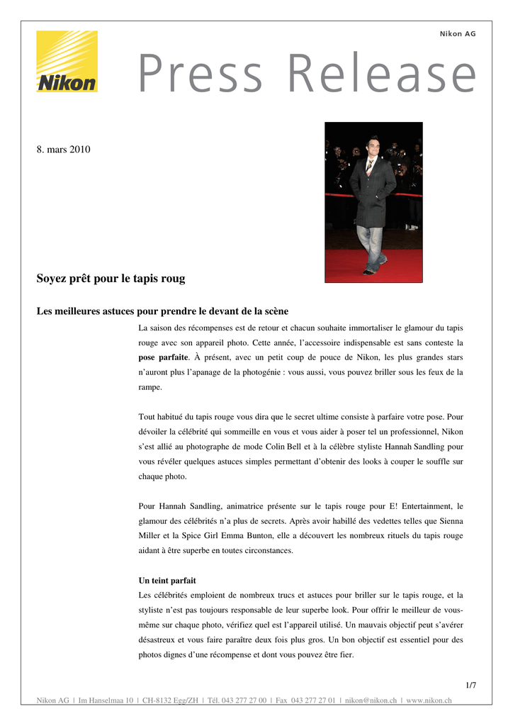 8. mars 2010 Soyez prêt pour le tapis roug Les meilleures astuces pour prendre le devant de la scène La saison des récompenses est de retour et chacun souhaite immortaliser le glamour du tapis rouge avec son appareil photo. Cette année, l’accessoire indispensable est sans conteste la pose parfaite. À présent, avec un petit coup de pouce de Nikon, les plus grandes stars n’auront plus l’apanage de la photogénie : vous aussi, vous pouvez briller sous les feux de la rampe. Tout habitué du tapis rouge vous dira que le secret ultime consiste à parfaire votre pose. Pour dévoiler la célébrité qui sommeille en vous et vous aider à poser tel un professionnel, Nikon s’est allié au photographe de mode Colin Bell et à la célèbre styliste Hannah Sandling pour vous révéler quelques astuces simples permettant d’obtenir des looks à couper le souffle sur chaque photo. Pour Hannah Sandling, animatrice présente sur le tapis rouge pour E! Entertainment, le glamour des célébrités n’a plus de secrets. Après avoir habillé des vedettes telles que Sienna Miller et la Spice Girl Emma Bunton, elle a découvert les nombreux rituels du tapis rouge aidant à être superbe en toutes circonstances. Un teint parfait Les célébrités emploient de nombreux trucs et astuces pour briller sur le tapis rouge, et la styliste n’est pas toujours responsable de leur superbe look. Pour offrir le meilleur de vousmême sur chaque photo, vérifiez quel est l’appareil utilisé. Un mauvais objectif peut s’avérer désastreux et vous faire paraître deux fois plus gros. Un bon objectif est essentiel pour des photos dignes d’une récompense et dont vous pouvez être fier. 1/7 Nikon AG | Im Hanselmaa 10 | CH-8132 Egg/ZH | Tél. 043 277 27 00 | Fax 043 277 27 01 | [email protected] | www.nikon.ch De nombreux appareils photo de la gamme Nikon COOLPIX offrent à présent une technologie de maquillage automatique qui lisse et tinte la peau jusqu’au niveau exigé par les magazines en évitant les gros plans peu flatteurs. Une perte de poids instantanée Qu’on nous prenne en photo sur le tapis rouge des Oscars ou sur une plage, nous pouvons tous parfois nous sentir intimidés. Quoi qu’il en soit, certaines astuces simples vous permettent de paraître grand et mince sans devoir aller faire du sport. Le secret d’Hannah pour donner une impression de perte de poids instantanée est de présenter son profil à l’appareil, un pied devant l’autre. Si vous pointez alors un orteil vers l’appareil photo et basculez le poids de votre corps sur votre pied arrière, vous paraîtrez plus élancé sur vos photos. « Pour éviter que l’appareil photo ne vous ajoute dix kilos, ne laissez jamais le photographe prendre une photo de vous par en dessous, car l’éclairage tend alors à être peu flatteur et à vous ajouter un double menton ou des cernes. De même, une mauvaise mise au point peut vous faire paraître plus gros qu’en réalité. Cependant, les appareils photo tels que le COOLPIX L110 de Nikon intègrent des fonctions antifloues, garantissant une prise de vue parfaite sur chaque cliché et la fin de vos inquiétudes. » Une autre astuce formidable qui plaira aux célébrités telles que Robbie Williams consiste à ne porter qu’une seule couleur. Le noir n’est pas la seule couleur à vous faire paraître plus mince, toute tenue unicolore donnera le même effet. Toutefois, à moins que vous ne soyez hyper mince, comme Angelina Jolie ou Jude Law, vous devez probablement éviter de porter du blanc, qui reflète la lumière en rehaussant toutes les imperfections. » La diversité est le piment de la vie Une fois que vous avez trouvé la pose parfaite, il est tentant de la prendre pour chaque photo, mais le secret pour rester superbe est d’opérer systématiquement des changements mineurs. Hannah déclare : « Les célébrités très connues, telles que Beyonce, Orlando Bloom et Gisèle Bundchen, maîtrisent l’indispensable pose parfaite sur les photos et leur look est toujours impeccable. Elles ont compris que pour une pose originale et sympa, rien de mieux que d'adopter la technique du caméléon. » 2/7 Nikon AG | Im Hanselmaa 10 | CH-8132 Egg/ZH | Tél. 043 277 27 00 | Fax 043 277 27 01 | [email protected] | www.nikon.ch Tenez-vous droit La plupart des gens, dont certaines des plus grandes stars, n’ont pas une très bonne posture. Sauf si vous souhaitez avoir l’air vraiment décontracté, rappelez-vous de garder le dos droit, la poitrine en avant (comme un paon), le menton relevé, les fesses rentrées, les épaules basses : votre look en sera immédiatement amélioré Imaginez que quelqu’un vous tire par une ficelle attachée en haut de votre tête. Hannah poursuit : « Rentrer le ventre donnera une apparence plus tonique à votre abdomen, même si vous avez la ligne, mais pensez à ne pas retenir votre respiration, car la concentration a tendance à se voir sur la photo et vous semblerez plus coincé que superbe. » Les chaussures à talons hauts sont une arme secrète pour paraître au mieux sur les photos. De nos jours, les femmes ne sont plus les seules à pouvoir en bénéficier, car certaines gammes de chaussures stylées pour hommes comprennent un petit talon qui augmente un peu la taille. Non seulement elles allongent et élancent votre corps, mais elles vous donnent également confiance en vous. Il est toujours plus flatteur d’être pris en photo debout qu’assis puisque cela allonge votre corps au lieu de le rapetisser », explique Hannah. « Lorsqu’ils prennent la pose, les professionnels ont rarement les bras tendus. Ouvrez n’importe quel magazine de mode pour le constater. Un bras serré contre votre cage thoracique peut vous faire paraître plus large et plus flasque. Par conséquent, lorsqu’on vous prend en photo, essayez de plier un bras ou les deux, même un petit peu, pour que la pose semble moins artificielle, comme celle de mannequins. De même, 