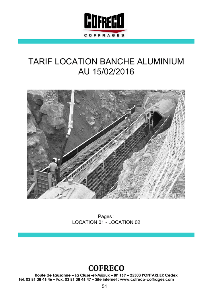 TARIF LOCATION BANCHE ALUMINIUM AU 15/02/2016 Pages : LOCATION 01 - LOCATION 02 COFRECO Route de Lausanne – La Cluse-et-Mijoux – BP 169 – 25303 PONTARLIER Cedex Tél. 03 81 38 46 46 – Fax. 03 81 38 46 47 – Site internet : www.cofreco-coffrages.com 51 T A R I F VENTE HT Route de Lausanne La Cluse et Mijoux - BP 169 25303 PONTARLIER Cedex Tél : 03.81.38.46.46 Fax : 03.81.38.46.47 DEPART USINE AU 15/02/2016 LOCATION 01 LOCATION BANCHE ALUMINIUM 2016-02-15 14-TARIF LOCATION BANCHE ALU.xls Vue pièce Désignation CODE Surf. Prix au L'U/1 mois* Prix au L'U/1 jour* VOL L'U M3 M²/ mois* M²/jour* BAL - BANCHE ALU 90x270 CP COMPOSITE - 7035 L043591 7035 2,43 17,84 € 43,35 € 0,59 € 1,43 € 0,243 BAL - BANCHE ALU 75x270 CP COMPOSITE - 7035 L043305 7035 2,02 17,84 € 36,04 € 0,59 € 1,19 € 0,203 BAL - BANCHE ALU 60x270 CP COMPOSITE - 7035 L043592 7035 1,62 17,84 € 28,90 € 0,59 € 0,96 € 0,162 BAL - BANCHE ALU 40x270 CP COMPOSITE - 7035 L043593 7035 1,08 17,84 € 19,27 € 0,59 € 0,64 € 0,108 BAL - BANCHE ALU 90x150 CP COMPOSITE - 7035 L053482 7035 1,35 17,84 € 24,08 € 0,59 € 0,80 € 0,135 BAL - BANCHE ALU 40x150 CP COMPOSITE - 7035 L071978 7035 0,60 17,84 € 10,70 € 0,59 € 0,35 € 0,060 BAL - BLOC DE JONCTION Std ZB L51514 1,10 € 0,04 € 0,002 TIGE D17 - LG 0,80 ZJ L51374 0,30 € 0,01 € 0,0002 ECROU D17 - Embase 130 3 ailettes ZJ L019337 0,75 € 0,03 € 0,001 BOUCHON PVC D23 - vendu par 500 - sac de 100 C016913 pièces vendues en négoce 36,00 € NC : nous consulter L'U/1 mois* : le 1er mois est indivisible et incompressible) L'U/1 Jour* : prix par jour en jour calendaire uniquement à compter du 1er jour du 2 ème mois de location) Tous les prix s'entendent H.T. - Départ Usine Nos tarifs sont susceptibles d'être révisés selon l'évolution des hausses des matières premières et sans préavis de notre part. CE TARIF N'ENGAGE NULLEMENT NOTRE SOCIETE QUANT A LA DISTRIBUTION. 52 0,008 T A R I F VENTE HT Route de Lausanne La Cluse et Mijoux - BP 169 25303 PONTARLIER Cedex Tél : 03.81.38.46.46 Fax : 03.81.38.46.47 DEPART USINE AU 15/02/2016 LOCATION 02 LOCATION BANCHE ALUMINIUM 2016-02-15 14-TARIF LOCATION BANCHE ALU.xls Vue pièce Désignation CODE L'U/1 mois* L'U/1 jour* VOL L'U M3 BAL - ANGLE INT ALU 20x20x270 - L - 7035 L045405 7035 34,56 € 1,15 € 0,108 BAL - ANGLE EXT ALU 10x10x270 - L - 7035 L016844 7035 11,49 € 0,38 € 0,027 BAL - ANGLE INT ALU 20x20x150 - L - 7035 L071949 7035 22,19 € 0,74 € 0,060 BAL - ANGLE EXT ALU 10x10x150 - L - 7035 L071950 7035 8,91 € 0,30 € 0,015 L51549 6,35 € 0,21 € 0,004 ECLISSE D'ABOUT DE VOILE COMPLETE Lg 600 - Y compris 2 attaches et 2 écrous L049280 5,62 € 0,19 € 0,004 BAL - BLOC DE LEVAGE L045082 14,87 € 0,50 € 0,006 BAL - CONSOLE ACIER + GARDE CORPS + FIX L019109 21,58 € 0,72 € 0,185 BEQUILLE TP 170x300 + bracon 0,80x1,20 + sabot L022215 14,68 € 0,49 € 0,080 FOURRURE ACIER DE DECOFFRAGE 3X100X2700 AVEC 2 POIGNEES LAQ NOIRE L071951 5,07 € 0,17 € 0,001 BAL - BLOC VARIABLE ZJ STD - NC : nous consulter L'U/1 mois* : le 1er mois est indivisible et incompressible) L'U/1 Jour* : prix par jour en jour calendaire uniquement à compter du 1er jour du 2 ème mois de location) Tous les prix s'entendent H.T. - Départ Usine Nos tarifs sont susceptibles d'être révisés selon l'évolution des hausses des matières premières et sans préavis de notre part. CE TARIF N'ENGAGE NULLEMENT NOTRE SOCIETE QUANT A LA DISTRIBUTION. 53
