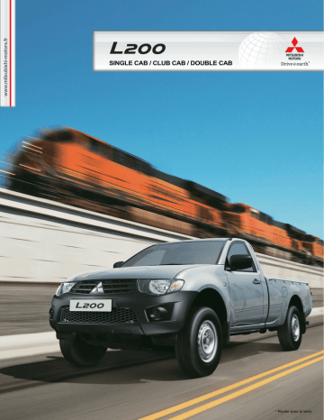 www.mitsubishi-motors.fr SINGLE CAB / CLUB CAB / DOUBLE CAB * * Rouler avec la terre FORCE DE CARACTERE ET CAPACITE HORS DU COMMUN La véritable aptitude au travail d’un pick-up se mesure par sa capacité de transport. Le L200 Single Cab est non seulement excellent dans ce domaine, mais en plus il offre davantage de puissance et de confort avec des lignes très fluides. Le L200 Single Cab présente une benne de grand volume en acier galvanisé à double parois et une charge utile d’environ une tonne avec un rayon de braquage de 5,9 mètres, le plus faible de sa catégorie. Indépendamment du terrain et des virages à prendre, il progresse sans effort. Les six crochets d’arrimage de la benne maintiennent la charge en toute sécurité, et s’il faut transporter davantage, le L200 peut tracter sans problème jusqu’à 2,7 tonnes. Au-delà de sa structure robuste et de sa puissance, le L200 redessiné dans un style dynamique offre l’un des coefficients de pénétration dans l'air les plus faibles pour vous permettre de vous déplacer dans le confort et le silence. 2220 mm 1470 mm 5.9m Benne du Single Cab Rayon de braquage HAYON POLYVALENT Le hayon peut être abaissé de 180 degrés, offrant ainsi un accès plus facile à un chariot élévateur pour le chargement d’objets lourds et encombrants. 2 3 UN COLLABORATEUR A LA HAUTEUR Le L200 puise sa force dans le moteur 2,5 litres Turbo Diesel à rampe commune qui développe davantage de puissance et de couple tout en étant plus sobre. Les ingénieurs ont abaissé sa consommation et augmenté ses périodicités d’entretien tout en respectant la norme antipollution Euro 5b. Le L200 est encore plus robuste que son prédécesseur. Son châssis à échelle bénéficie du concept de cellule de sécurité RISE (Reinforced Impact System Evolution) pour rehausser sa rigidité et contribuer également à l’amélioration de sa sécurité passive. La suspension à triangles superposés à l’avant et essieu rigide à suspensions à lames à l’arrière apporte un surcroît de résistance, de stabilité sur route et en tout-terrain tout en permettant le transport d’une charge utile plus élevée. TRANSMISSION INTEGRALE EASY SELECT ABS avec EBD La transmission intégrale Easy Select du L200 permet de passer du 2 à 4 roues motrices jusqu’à une vitesse de 60 km/h. Ainsi, il est possible d’engager le pont avant lorsque le terrain devient difficile et de toujours disposer d’une motricité suffisante. Equipé de l'antiblocage des roues (ABS) et du système de répartition électronique de la force de freinage (EBD), le L200 assure un freinage optimal en toutes circonstances que vous transportiez des passagers ou de lourdes charges. A Conducteur seul avec EBD Arrêt complet Freinage B Passagers et charge avec EBD Arrêt complet Freinage C Passagers et charge sans EBD Arrêt complet Freinage 4 5 UN HABITACLE QUI INVITE AU PLAISIR DE CONDUIRE Conçu pour le professionnel, l’habitacle est confortable et spacieux. Il permet de trouver une place pour tout ce qui est nécessaire à l’exercice de votre métier y compris des porte-gobelets. Le tableau de bord très élégant du L200 fournit toutes les informations nécessaires à la conduite. La sécurité intérieure est également une priorité. Le volant rétractable et les airbags frontaux (avec fonction de désactivation côté passager) assurent votre protection dans toutes les situations d’urgence. Robustesse et élégance caractérisent les Single cab, Club Cab et Double Cab. Choisissez votre Niveau d'équipements SINGLE CAB INFORM Caractéristiques principales •• ABS avec EBD •• Airbags frontaux •• Crochets de benne latéraux pour fixation facile •• Boîte de transfert Easy Select •• Blocage de différentiel arrière •• Vitres électriques •• Pré-équipements audio 2 haut-parleurs CLUB CAB INFORM Caractéristiques principales •• ABS avec EBD •• Airbags frontaux •• Crochets de benne pour fixation facile •• Boîte de transfert Easy Select •• Blocage de différentiel arrière •• Vitres avant électriques •• Strapontins arrière (X2) •• Pré-équipements audio 2 haut-parleurs •• Siège conducteur réglable en hauteur DOUBLE CAB INFORM Caractéristiques principales •• ABS avec EBD •• Airbags frontaux •• Crochets de benne pour fixation facile •• Boîte de transfert Easy Select •• Blocage de différentiel arrière •• Vitres avant et arrière électriques •• Pré-équipements audio 4 haut-parleurs •• Siège conducteur réglable en hauteur 6 7 Equipements Disponible Modèle Version Roues et pneus Sûreté et Sécurité Extérieur Intérieur Confort Sièges Jantes acier 16" Roue de secours Freins avant à disques Freins arrière à tambour Colonne de direction rétractable Désembuage de la lunette arrière avec temporisateur Troisième feu stop sur ridelle arrière Airbags frontaux (passager déconnectable) Ceintures de sécurité avant 3 points (ELR) avec prétentionneurs et limiteurs de force (x2) ABS (antiblocage des roues) avec EBD (répartiteur électronique de la force de freinage) Essuie-glaces à intermittence variable et lave-glace Limiteurs d'ouverture de ridelle arrière Antenne de toit Crochets de benne (x4) Crochets de benne (x6) Grille d'arrêt de charge Boîte à gants verrouillable et éclairée Témoin 4 roues motrices Montre digitale Direction assistée Porte-gobelets pour les places avant (x2) Cendrier éclairé avec allume-cigares Vitres avant électriques avec fonction anti-pincement Vitres arrière électriques avec fonction anti-pincement Climatisation manuelle Système d'ouverture des portes sans clés avec deux émetteurs Témoin sonore et lumineux d'ouverture de portes Condamnation centralisée des portes Sièges en tissu Sièges avant coulissants avec dossiers inclinables Siège conducteur réglable en hauteur Fonction "Easy Entry" côté passager Strapontins à l'arr