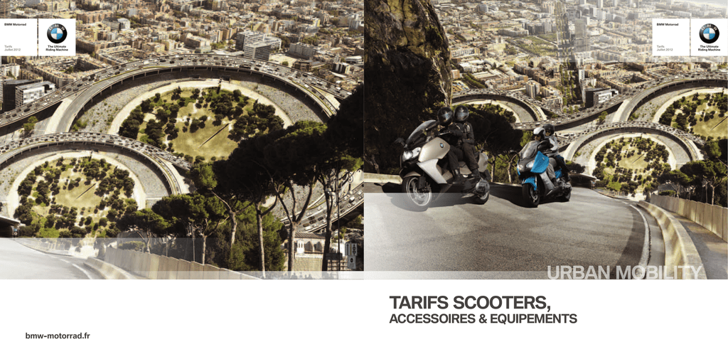 BMW Motorrad Tarifs Juillet 2012 BMW Motorrad Tarifs Juillet 2012 The Ultimate Riding Machine The Ultimate Riding Machine URBAN MOBILITY Tarifs SCOOTERS, ACCESSOIRES & EQUIPEMENTS bmw-motorrad.fr Un C comme commuters, pour tous ceux qui se déplacent quotidiennement pour entrer et sortir de la ville. Un C comme cité, lieu de vie, de travail, de loisirs et d’expériences. Le scooter selon BMW Motorrad, c’est un mouvement moderne qui se dessine. Un mouvement caractéristique de nouveaux besoins dans les déplacements quotidiens de ces commuters, ces hommes et femmes modernes en recherche d’une mobilité toujours plus flexible et fluide. URBAN MOBILITY 2 C’est pour eux que BMW Motorrad a conçu les Maxi-Scooters C 600 Sport et C 650 GT. Que l’on privilégie le dynamisme ou le très grand confort, il y a forcément une conception de la mobilité chez BMW Motorrad qui vous correspond. 3 C 600 Sport, essence de dynamisme. Ce maxi-scooter puise son ADN du prototype Concept C, lui même une vision de la sportivité façon S 1000 RR, la plus radicale des déclinaisons sportives chez BMW Motorrad, affuté pour faire de la ville une grille de jeu plus réaliste que jamais. Animé par un moteur bi-cylindre de 647cm3 développant 60 chevaux, le C 600 Sport met à profit le savoir faire de la marque en terme de puissance et de couple, afin de libérer la vitesse et la reprise nécessaire quelque soit la situation. C 600 Sport 4 Les obstacles du tissu routier citadin, pavés, ronds-points, ralentisseurs, embouteillages, sont autant de possibilités pour le C 600 Sport de franchir les différentes étapes qui jalonnent les trajets quotidiens, la mobilité moderne en BMW c’est le moyen le plus efficace de prendre la tangente ! Pour cela le Maxi-Scooter BMW Motorrad est doté d’une partie-cycle conçue pour apporter rigidité, fermeté et performance, de façon identique à celles des motos de la marque. Les suspensions, les freins, le cadre sont surdimensionnés afin d’apporter le maximum d’efficacité et d’en garder encore en réserve ! 5 C 600 Sport : 11 100 € TTC ou 217 €/mois* Options disponibles : - Pack HighLine : 895 € (Feux diurnes à LED, clignotants à LED, Selles chauffantes, Poignées chauffantes, RDC-témoin de pression des pneus) - Alarme : 210 € *Exemple pour un BMW C 600 SPORT : 11 100 €. LOA 36 mois sans apport. 36 loyers linéaires de 216,13 € hors assurances facultatives. Montant total dû avec option d’achat : 13 330,68 €. Un crédit vous engage et doit être remboursé, vérifiez vos capacités de remboursement avant de vous engager. Bleu cosmique métallisé mat 6 noir mat métallisé Argent titane métallisé Offre de Location avec Option d’Achat. Après le paiement du dernier loyer, vous pouvez restituer votre BMW à votre concessionnaire (selon les conditions prévues au contrat liées à l’usure et au kilométrage de 25 500 km) ou l’acquérir en levant l’option d’achat de 5 550 €. Montant total dû hors option d’achat : 7 780,68 € dont 111 € de frais de dossier. Assurances facultatives DI+ à 5,88 €/mois et ICAR+ à 14,43 €/mois en sus du loyer, souscrites auprès de Allianz Vie et Calypso. Offre réservée aux particuliers, avec droit de rétractation, valable pour toute commande avant le 30/09/2012 dans les concessions BMW Motorrad participantes. Sous réserve d’acceptation par BMW Finance - 78280 GUYANCOURT - SNC au capital de 70 000 000 € - RCS VERSAILLES 343 606 448. N° ORIAS : 07 008 883. www.orias.fr 7 Accessoires C 600 SPORT Topcase 35L • (+) Barillet pour fermeture unique • (+) Enjoliveur de couvercle gauche* noir saphir • (+) Enjoliveur de couvercle droit* noir saphir • (o) Dossert pour Topcase (35L) • (o) Sac intérieur pour Topcase (35L) Porte-bagage • Porte-bagage Référence €TTC Bulle teintée Système GPS et son support 8 Déflecteur Sac de tunnel 27,50 Masselotte de guidon • Masselotte de guidon chromée 77 22 8 527 001 77 43 8 523 976 29,00 77 43 8 523 982 77 44 8 527 002 77 43 8 527 035 29,00 69,00 79,00 Silencieux • Silencieux Sport par Akrapovic 77 11 8 528 402 599,00 Selle • Selle Sport • Housse anti-pluie pour selle 52 53 8 527 039 399,00 77 34 8 527 015 39,00 77 44 8 527 037 149,00 • Bulle teintée • Bulle sport non teintée • Bulle sport teintée 77 33 7 725 417 249,00 77 33 7 725 418 199,00 77 33 7 725 419 219,00 Déflecteurs • Déflecteurs 77 31 8 527 005 140,00 Inserts de marchepied et repose-pieds • Insert chromé gauche 77 25 8 527 057 • (+) Insert chromé droit 77 25 8 527 058 • (+) Insert chromé milieu gauche 77 25 8 527 059 • (+) Insert chromé milieu droit 77 25 8 527 060 • Repose-pieds passager chromé gauche 77 25 8 527 303 • (+) Repose-pieds passager chromé droit 77 25 8 527 304 Housse de selle €TTC 77 43 8 527 036 299,00 77 44 8 527 130 40,50 Tablier • Tablier de scooter Bagagerie diverse • (+) Ecrou-clip M5, x10 • Filet de séparation coffre de selle 77 49 8 527 033 45,50 • (+) Vis M5x12, x10 • (+) Ecrou borgne désacouplé M5, x4 46 63 2 347 012 3,30 • (+) Vis M5x20, x4 06 32 7 657 966 0,60 Antivol • Sac de tunnel central (12L) 77 45 8 527 013 119,00 • Antivol scooter • (+) Vis M12x50, x1 Bulles Silencieux Sport Akrapovic Référence 23,50 23,50 23,50 23,50 33,00 33,50 77 31 8 527 011 179,00 46 63 7 707 388 0,70 06 32 7 651 211 0,70 77 25 8 527 047 204,00 07 12 9 906 088 1,40 Système GPS • Système GPS, Navigator 4 • (+) Kit de montage 77 52 7 721 938 699,00 77 52 8 527 018 82,00 Divers • Dosseret pour passager • Support téléphone mobile • Chargeur USB BMW • Prise électrique 12V • Crash protectors (avant) • Housse extérieure 77 34 8 527 045 77 31 8 527 377 65 41 2 166 411 61 34 7 694 306 77 00 8 527 003 77 02 8 527 017 179,00 59,00 19,00 30,00 299,00 105,00 Tous les prix indiqués pour les accessoires spécifiques au modèle sont des prix publics conseillés maximum T.T.C hors frais de montage