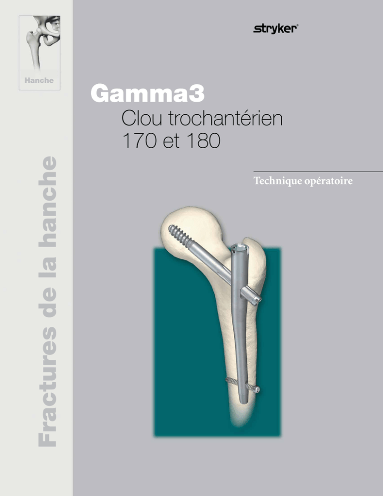 Hanche Gamma3 Fractures de la hanche Clou trochantérien 170 et 180 Technique opératoire Clou trochantérien 170 et 180 Chirurgiens ayant contribué à sa conception Professeur Kwok Sui Leung, titulaire d’un doctorat en médecine Directeur du service d’orthopédie et de traumatologie Université chinoise de Hong Kong Hôpital Prince de Galles Hong Kong Professeur assistant Gilbert Taglang, titulaire d’un doctorat en médecine Service de traumatologie Hôpital universitaire, Strasbourg France Professeur Volker Bühren, titulaire d’un doctorat en médecine Chef du service de chirurgie Directeur médical du centre de traumatologie de Murnau, Murnau Allemagne Katsumi Sato, titulaire d’un doctorat en médecine (Ph.D.) Vice-directeur, chirurgien chef Faculté de médecine de l’université de Tohoku Hôpital Tohoku Rosai, Sendai Japon Christopher T. Born, titulaire d’un doctorat en médecine Professeur en chirurgie orthopédique Service de traumatologie orthopédique Faculté de médecine de l’université Brown Providence, Rhode Island États-Unis Robert Probe, titulaire d’un doctorat en médecine Directeur du service de chirurgie orthopédique Hôpital Scott & White, Temple, TX États-Unis Professeur Vilmos Vécsei, titulaire d’un doctorat en médecine Chef du service de traumatologie Université de Vienne, Vienne Autriche La présente publication décrit les procédures détaillées recommandées relatives à l’utilisation des dispositifs et instruments d’ostéosynthèse de Stryker. Il est recommandé de suivre les conseils prodigués dans ce guide technique. Toutefois, le chirurgien doit tenir compte des besoins particuliers de chaque patient et effectuer les réglages appropriés lorsqu’ils sont nécessaires. Une séance de travaux pratiques est recommandée avant une première intervention chirurgicale. Tout matériel non stérile doit être nettoyé et stérilisé avant utilisation. Il est également recommandé de suivre les instructions fournies dans les instructions de nettoyage et de stérilisation (L24002000). Les instruments multi-composants doivent être démontés pour être nettoyés. Se reporter aux instructions d’assemblage et de démontage correspondantes. Voir la notice (L22000007) pour une liste complète des éventuels effets indésirables, contre-indications, avertissements et mises en garde. Le cas échéant, le chirurgien doit évoquer avec le patient tous les risques liés à l’opération, y compris la durée de vie limitée du dispositif. Avertissement : Vis de fixation : Les vis pour os de Stryker Osteosynthesis ne sont pas approuvées le vissage pédiculaire de la colonne cervicale, thoracique ou lombaire. 2 Table des matières Page 1. Conception du système Gamma3 4 Fonctions respectives de la vis céphalique et de la vis de blocage 5 Vis de verrouillage distal 5 2. Indications, mises en garde et contre-indications 6 Indications 6 Contre-indications 6 Mises en garde 6 3. Technique opératoire 7 Planification préopératoire 7 Choix de l’implant 7 Installation du patient 8 Réduction de la fracture 8 Incision 9 Point d’entrée 11 Ouverture de la corticale 11 Préparation du canal médullaire 12 Assemblage du viseur 18 Insertion du clou 21 Positionnement de la vis céphalique à l’aide de l’ancillaire « One Shot » 23 Insertion de la vis céphalique 24 Perçage préalable de la corticale latérale 25 Insertion de la vis céphalique 26 Fixation de la vis céphalique 29 Verrouillage de la vis distale 33 Insertion du bouchon d’obturation 35 Bouchons d’obturation surélevés 36 Soins postopératoires et rééducation 36 Références 37 3 Conception Le système3 Gamma Caractéristiques : Bouchon d’obturation Gamma3 • Matériau : Alliage de titane avec traitement de surface anodisé de type II. • Longueur du clou : Vis de blocage Gamma3 170 mm, 180 mm • Diamètre du clou : 180 mm : proximal 15,5 mm, distal : 11 mm 170 mm : proximal 15,5 mm, distal : 10 mm • Angle du clou proximal : 120°, 125°, 130° • Courbure médio-latérale respectant le valgus physiologique : Vis céphalique Gamma3 4 degrés • Longueur des bouchons d’obturation : 0 mm, +5 mm et 120° 125° 130° +10 mm • Trou oblong distal pour vis Clou Gamma3 170 et 180 de 5 mm ; dynamisation possible jusqu’à 5 mm Options de verrouillage distal • La mise en place de la vis dans la partie distale de trou oblong permet un verrouillage dynamique (voir Fig. 2). • La mise en place de la vis dans la partie proximale de trou oblong permet un verrouillage statique (voir Fig. 3). Vis de verrouillage distal Fig. 1 Verrouillage dynamique Verrouillage statique Fig. 2 Fig. 3 * Chaque clou est conditionné sous emballage stérile avec sa vis de blocage. 4 Conception Fonctions respectives de la vis céphalique et de la vis de blocage Caractéristiques •Diamètre de la vis céphalique : 10,5 mm •Longueurs des vis céphaliques : 70−130 mm par incréments de 5 mm Vis de verrouillage distal Fig. 4 Système de stabilisation de la vis céphalique Définition de la longueur de la vis de verrouillage distal La vis de verrouillage distal se mesure du sommet de la tête à l’extrémité (Fig. 5). Caractéristiques •Diamètre de la vis de verrouillage distal : 5 mm. •Longueur de la vis de verrouillage distale : 25-50 mm, par incréments de 2,5 et de 5 mm. Vis plus longues (jusqu’à 120 mm) disponibles sur demande. • Vis entièrement filetée. Des vis partiellement filetées sont disponibles sur demande. Définition de la longueur Fig. 5 5 mm 5 Indications, mises en garde et contre-indications Indications Mises en garde Les indications du clou Gamma3 170 et 180 sont les mêmes que celles du clou trochantérien verrouillé Gamma (Fig. 7). • Fractures intertrochantériennes • Fractures pertrochantériennes • Pseudarthroses et cals vicieux La sécurité et l’utilisation des systèmes de Stryker Osteosynthesis n’ont pas été évaluées dans l’environn
