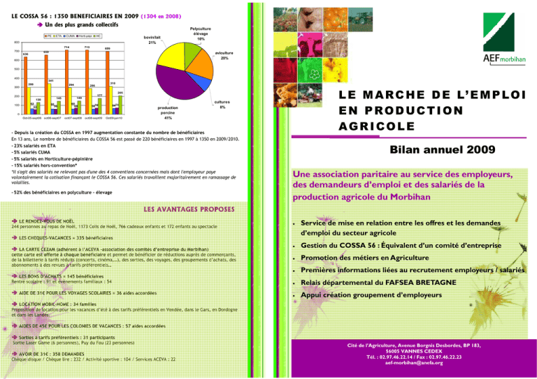 LE COSSA 56 : 1350 BENEFICIAIRES EN 2009 (1304 en 2008) Un des plus grands collectifs PE ETA CUMA Horti-pépi HC bovin/lait 21% 800 714 700 713 Polyculture élévage 10% 699 659 636 aviculture 20% 600 500 400 341 299 294 300 200 130 100 62 52 60 56 60 68 6471 5870 production porcine 41% 0 Oct-05-sept06 oct06-sept07 oct07-sept08 oct08-sept09 L E M A R C H E D E L’ E M P L O I EN PRODUCTION AGRICOLE 205 177 149 145 310 286 Oct09-juin10 cultures 8% - Depuis la création du COSSA en 1997 augmentation constante du nombre de bénéficiaires En 13 ans, Le nombre de bénéficiaires du COSSA 56 est passé de 220 bénéficiaires en 1997 à 1350 en 2009/2010. - 23% salariés en ETA - 5% salariés CUMA - 5% salariés en Horticulture-pépinière - 15% salariés hors-convention* *Il s'agit des salariés ne relevant pas d'une des 4 conventions concernées mais dont l'employeur paye volontairement la cotisation finançant le COSSA 56. Ces salariés travaillent majoritairement en ramassage de volailles. - 52% des bénéficiaires en polyculture – élevage Bilan annuel 2009 Une association paritaire au service des employeurs, des demandeurs d’emploi et des salariés de la production agricole du Morbihan LES AVANTAGES PROPOSES LE RENDEZ-VOUS DE NOËL 244 personnes au repas de Noël, 1173 Colis de Noël, 766 cadeaux enfants et 172 enfants au spectacle • LES CHEQUES-VACANCES = 335 bénéficiaires LA CARTE CEZAM (adhérent à l’ACEVA –association des comités d’entreprise du Morbihan) cette carte est offerte à chaque bénéficiaire et permet de bénéficier de réductions auprès de commerçants, de la billetterie à tarifs réduits (concerts, cinéma,…), des sorties, des voyages, des groupements d’achats, des abonnements à des revues à tarifs préférentiels… • Gestion du COSSA 56 : Équivalent d’un comité d’entreprise • Promotion des métiers en Agriculture • Premières informations liées au recrutement employeurs / salariés • Relais départemental du FAFSEA BRETAGNE • Appui création groupement d’employeurs LES BONS D’ACHATS = 145 bénéficiaires Rentré scolaire : 91 et événements familiaux : 54 AIDE DE 31€ POUR LES VOYAGES SCOLAIRES = 36 aides accordées Service de mise en relation entre les offres et les demandes d’emploi du secteur agricole LOCATION MOBIL-HOME : 34 familles Proposition de location pour les vacances d’été à des tarifs préférentiels en Vendée, dans le Gars, en Dordogne et dans les Landes. AIDES DE 45€ POUR LES COLONIES DE VACANCES : 57 aides accordées Sorties à tarifs préférentiels : 31 participants Sortie Laser Game (6 personnes), Puy du Fou (23 personnes) AVOIR DE 31€ : 358 DEMANDES Chèque disque / Chèque lire : 232 / Activité sportive : 104 / Services ACEVA : 22 Cité de l’Agriculture, Avenue Borgnis Desbordes, BP 183, 56005 VANNES CEDEX Tél. : 02.97.46.22.14 / Fax : 02.97.46.22.23 [email protected] LES OFFRES D’EMPLOI : 199 EN 2009 (256 en 2008) LES PLACEMENTS : 136 EN 2009 (134 en 2008) L'élevage et le machinisme restent majoritaires, avec 80% des offres 82% des offres ont été satisfaites (164 sur 199) 9 H or t i - P é p i - A r bo - For ê t 16 % 70 J.E.V 9 60 42% maraîchage 33 Aviculture 65 B ov i n/ La i t e t v i a nde 10 20 9 Polyculture Elevage 22 0 30 Bovin lait et viande 30 40 50 60 35 34 33 30 47 P or c M a c hi ni sme 40 35 20 CDD 70 42% - Production laitière : un niveau élevé d’offres depuis 2006 - Production porcine : un niveau soutenu des offres, malgré une légère baisse en 2009 - Secteur du machinisme : une baisse significative des offres depuis plusieurs années Production Porcine 24 Machinisme 24 22 14 5 10 15 9 1211 6 14 21 17 9 14 9 6 0 M a c h i n i s me 0 13 10 14 DEMANDES PLACEMENTS 50 6 OFFRES 47 42 13 P ol y - El e v a ge 65 65 63 CDI 12 A v i c u l t ur e 6 A LTER N A N C E 14 M a r a î c ha g e Horti-Pépiarboriculture C ON TR A TS 17 J . E. V 20 25 30 35 40 P or c B ovi n / Lai t - P ol y et vi ande E l evage A vi cul t ur e M ar aî chage J . E . V H or t i - P épi 199 offres : Taux de placement AEF 56* de 52% (égal à 2008 et 2007) - Horticulture-pépinière, maraîchage et JEV : diminution du niveau des offres - Diminution des CDI (42% des offres déposées contre 54% en 2008) Surtout en production porcine et en production laitière - 103 offres du Morbihan ont été pourvues avec un demandeur d’emploi de AEF 56 33 offres hors 56, pourvues avec un demandeur d’emploi de l’AEF 56 Au total 136 demandeurs d’emploi inscrits à l’AEF 56 ont été placés sur 2009. - Augmentation des CDD (42% des offres déposées contre 39% en 2008) : - 61 offres pourvues hors AEF (presse, Pôle Emploi, relations diverses,…) Surtout dans les secteurs du machinisme, du maraîchage, et de la production laitière. - 35 offres déclarées caduques - Nouveau : une nette augmentation des offres en apprentissage (16% contre 7% en 2008) : Les principaux secteurs offreurs : lait - JEV - Horticulture-pépinière LES DEMANDES D’EMPLOI : 280 EN 2009 (221 en 2008) 2009 : Nette augmentation des demandes d’emploi par rapport à 2008 *Les placements représentent le nombre de demandeurs d’emploi inscrits à la bourse de l’emploi de l’AEF 56 ayant été embauchés chez un employeur dont la gestion de l’offre et la mise en relation ont été confiées à l’AEF 56. LES GRANDES TENDANCES DE L’ANNEE 2009 Niveau des offres est au plus bas depuis 5 ans. On revient au niveau de 2004. Les difficultés économiques sont manifestement venues perturber l’offre d’emplois agricoles Horti-Pépi-arboriculture 14 J.E.V Le niveau des demandes est au plus élevé depuis 4 ans. Retour au niveau des années 2004-2005. 21 Il devient plus difficile de trouver l’emploi de proximité le plus souvent recherché. maraîchage 65 Aviculture Cependant, le niveau des placements reste bon, égal à 2007 et 2008. Le nombre élevé d’offres en apprentissage traduit une bonne sensibilité des agriculteur