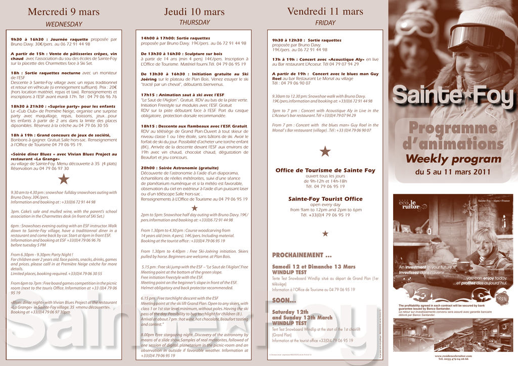 wednesday 9h30 à 16h30 : Journée raquette proposée par Jeudi 10 mars THURSDAY 14h00 à 17h00: Sortie raquettes Bruno Davy. 30€/pers. au 06 72 91 44 98 proposée par Bruno Davy. 19€/pers. au 06 72 91 44 98 A partir de 15h : Vente de pâtisseries crêpes, vin chaud avec l’association du sou des écoles de Sainte-Foy De 13h30 à 16h30 : Sculpture sur bois sur la placette des Charmettes face à Ski Set. 18h : Sortie raquettes nocturne avec un moniteur de l’ESF Descente à Sainte-Foy village avec un repas traditionnel et retour en véhicule (si enneigement suffisant). Prix : 20€ (hors location matériel, repas et taxi). Renseignements et inscriptions à l’ESF avant mardi 17h. Tel : 04 79 06 96 76 18h30 à 21h30 : «Suprise party» pour les enfants Le «Cub Club» de Première Neige, organise une surprise party avec maquillage, repas, boissons, jeux...pour les enfants à partir de 2 ans dans la limite des places dipsonibles. Réservez à la crèche au 04 79 06 30 55 18h à 19h : Grand concours de jeux de société, Bonbons à gagner. Gratuit.Salle hors-sac. Renseignement à l’Office de Tourisme 04 79 06 95 19. «Soirée dîner Blues « avec Vivian Blues Project au restaurant «La Grange» au village de Sainte-Foy. Menu découverte à 35€ (4 plats) Réservation au 04 79 06 97 30 H 9.30 am to 4.30 pm : snowshoe fullday snowshoes outing with Bruno Davy. 30€/pers. Information and booking at : +33(0)6 72 91 44 98 3pm. Cake’s sale and mulled wine, with the parent’s school association in the Charmettes desk (in front of SKi Set.) 6pm : Snowshoes evening outing with an ESF instructor. Walk down to Sainte-Foy village, have a traditionnal diner in a restaurant and come back by car. Start at 6pm in front ESF. Information and booking at ESF +33(0)4 79 06 96 76 before tuesday 5 PM From 6.30pm - 9.30pm: Party Night ! For children over 2 years old. face paints, snacks, drinks, games and prices. please calll in at Première Neige crèche for more details. Limited places, booking required. +33(0)4 79 06 30 55 From 6pm to 7pm : Free board games competition in the picnic room (next to the touris Office. Information at +33 (0)4 79 06 95 19 «Blues dinar night» with Vivian Blues Project at the restaurant «La Grange» in Sainte-Foy village. 35€ «menu découverte». Booking at +33(0)4 79 06 97 30pm Vendredi 11 mars FRIDAY 9h30 à 12h30 : Sortie raquettes proposée par Bruno Davy. 19€/pers. au 06 72 91 44 98 à partir de 14 ans (min 4 pers) 14€/pers. Inscription à L’Office de Tourisme. Matériel fourni.Tél. 04 79 06 95 19 17h à 19h : Concert avec «Acoustique Aly» en live De 13h30 à 16h30 : Initiation gratuite au Ski Joëring sur le plateau de Plan Bois. Venez essayer le ski A partir de 19h : Concert avec le blues man Guy Roel au bar Restaurant Le Monal au village au Bar restaurant L’Acoeur. Tél 04 79 07 94 29 ‘‘tracté par un cheval’’, débutants bienvenus. Tél : 04 79 06 90 07 17h15 : Animation saut à ski avec l’ESF 9.30am to 12.30 pm: Snowshoe walk with Bruno Davy. 19€/pers.information and booking at: +33(0)6 72 91 44 98 ‘‘Le Saut de l’Aiglon’’. Gratuit. RDV au bas de la piste verte. Initiation Freestyle sur modules avec l’ESF. Gratuit RDV sur la piste débutant face à l’ESF. Port du casque obligatoire, protection dorsale recommandée. 18h15 : Descente aux flambeaux avec l’ESF. Gratuit. RDV au télésiège de Grand Plan.Ouvert à tout skieur de niveau classe 1 ou 1ère étoile, sans bâtons de ski. Avoir le forfait de ski du jour. Possibilité d’acheter une torche enfant (8€). Arrivée de la descente devant l’ESF aux environs de 19h avec vin chaud, chocolat chaud, dégustation de Beaufort et jeu concours. 20h00 : Soirée Astronomie (gratuite) Découverte de l’astronomie à l’aide d’un diaporama, échantillons de réelles métérorites, suivi d’une séance de planétarium numérique et si la météo est favorable, observation du ciel en extérieur à l’aide d’un puissant laser ou d’un téléscope.Salle hors-sac . Renseignements à L’Office de Tourisme au 04 79 06 95 19 H 2pm to 5pm: Snowshoe half day outing with Bruno Davy. 19€/ pers.information and booking at: +33(0)6 72 91 44 98 5pm to 7 pm : Concert with Acoustique Aly in Live in the L’Acoeur’s bar restaurant. Tél +33(0)4 79 07 94 29 H Weekly program Office de Tourisme de Sainte Foy du 5 au 11 mars 2011 ouvert tous les jours de 9h-12h et 14h-18h Tél. 04 79 06 95 19 Sainte-Foy Tourist Office open every day from 9am to 12pm and 2pm to 6pm Tél. +33(0)4 79 06 95 19 From 1.30pm to 4.30 pm : Course woodcarving from 14 years old (min. 4 pers). 14€/pers. Including material. Booking at the tourist office : +33(0)4 79 06 95 19 H From 1.30pm to 4.40pm : Free Ski-Joëring initiation. Skiers pulled by horse. Beginners are welcome. at Plan Bois. Prochainement ... 5.15 pm : Free ski jump with the ESF – “Le Saut de l’Aiglon”. Free Meeting point at the bottom of the green slope. Free initiation Freestyle with the ESF. Meeting point on the beginner’s slope in front of the ESF. Helmet obligatory and back protector recommended. Samedi 12 et Dimanche 13 Mars Windlip Test 6.15 pm : Free torchlight descent with the ESF Meeting point at the ski lift Grand Plan. Open to any skiers, with class 1 or 1st star level minimum, without poles. Having the ski pass of the day. Possibility to buy torchlight for children (8€). Arrival at about 7 pm : hot wine, hot chocolate, Beaufort tasting and contest.” Soon... 8.00pm Free stargazing night .Discovery of the astronomy by means of a slide show,Samples of real meteorites, followed of one session of digital. planetarium in the picnic-room and an observation in outside if favorable weather. Information at +33(0)4 79 06 95 19 Programme d’animations From 7 pm : Concert with the blues man» Guy Roel in the Monal’ s Bar restaurant (village) . Tél : +33 (0)4 79 06 90 07 Tente Test Snowboard Windlip situé au départ de Grand Plan (