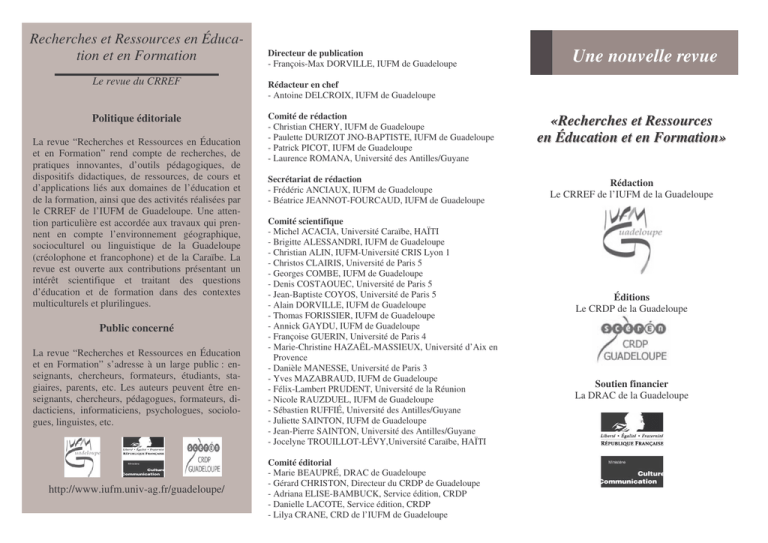 Recherches et Ressources en Éducation et en Formation Le revue du CRREF Politique éditoriale La revue “Recherches et Ressources en Éducation et en Formation” rend compte de recherches, de pratiques innovantes, d’outils pédagogiques, de dispositifs didactiques, de ressources, de cours et d’applications liés aux domaines de l’éducation et de la formation, ainsi que des activités réalisées par le CRREF de l’IUFM de Guadeloupe. Une attention particulière est accordée aux travaux qui prennent en compte l’environnement géographique, socioculturel ou linguistique de la Guadeloupe (créolophone et francophone) et de la Caraïbe. La revue est ouverte aux contributions présentant un intérêt scientifique et traitant des questions d’éducation et de formation dans des contextes multiculturels et plurilingues. Public concerné La revue “Recherches et Ressources en Éducation et en Formation” s’adresse à un large public : enseignants, chercheurs, formateurs, étudiants, stagiaires, parents, etc. Les auteurs peuvent être enseignants, chercheurs, pédagogues, formateurs, didacticiens, informaticiens, psychologues, sociologues, linguistes, etc. http://www.iufm.univ-ag.fr/guadeloupe/ Directeur de publication - François-Max DORVILLE, IUFM de Guadeloupe Une nouvelle revue Rédacteur en chef - Antoine DELCROIX, IUFM de Guadeloupe Comité de rédaction - Christian CHERY, IUFM de Guadeloupe - Paulette DURIZOT JNO-BAPTISTE, IUFM de Guadeloupe - Patrick PICOT, IUFM de Guadeloupe - Laurence ROMANA, Université des Antilles/Guyane Secrétariat de rédaction - Frédéric ANCIAUX, IUFM de Guadeloupe - Béatrice JEANNOT-FOURCAUD, IUFM de Guadeloupe Comité scientifique - Michel ACACIA, Université Caraïbe, HAÏTI - Brigitte ALESSANDRI, IUFM de Guadeloupe - Christian ALIN, IUFM-Université CRIS Lyon 1 - Christos CLAIRIS, Université de Paris 5 - Georges COMBE, IUFM de Guadeloupe - Denis COSTAOUEC, Université de Paris 5 - Jean-Baptiste COYOS, Université de Paris 5 - Alain DORVILLE, IUFM de Guadeloupe - Thomas FORISSIER, IUFM de Guadeloupe - Annick GAYDU, IUFM de Guadeloupe - Françoise GUERIN, Université de Paris 4 - Marie-Christine HAZAËL-MASSIEUX, Université d’Aix en Provence - Danièle MANESSE, Université de Paris 3 - Yves MAZABRAUD, IUFM de Guadeloupe - Félix-Lambert PRUDENT, Université de la Réunion - Nicole RAUZDUEL, IUFM de Guadeloupe - Sébastien RUFFIÉ, Université des Antilles/Guyane - Juliette SAINTON, IUFM de Guadeloupe - Jean-Pierre SAINTON, Université des Antilles/Guyane - Jocelyne TROUILLOT-LÉVY,Université Caraïbe, HAÏTI Comité éditorial - Marie BEAUPRÉ, DRAC de Guadeloupe - Gérard CHRISTON, Directeur du CRDP de Guadeloupe - Adriana ELISE-BAMBUCK, Service édition, CRDP - Danielle LACOTE, Service édition, CRDP - Lilya CRANE, CRD de l’IUFM de Guadeloupe «Recherches et Ressources en Éducation et en Formation» Rédaction Le CRREF de l’IUFM de la Guadeloupe Éditions Le CRDP de la Guadeloupe Soutien financier La DRAC de la Guadeloupe APPEL À CONTRIBUTION INSTRUCTIONS AUX AUTEURS La revue est publiée en français, mais des contributions d' intérêt majeur peuvent être acceptées en anglais, espagnol et créole. Date limite de réception : Le 30 septembre 2007 Plusieurs types de contributions sont souhaités : Des articles « recherches » présentant des travaux et des résultats originaux. Le texte doit comporter une introduction, des paragraphes relatifs à la méthode, aux résultats, à la discussion et une conclusion. Des articles « ressources » présentant des synthèses ou des revues de question sur un thème actuel de recherche, des outils méthodologiques, des comptes-rendus d’expérimentation, etc. Des articles « actualités » présentant des points de vue argumentés de chercheurs ou de praticiens, des notes de lectures, des débats ou des comptes-rendus de congrès. Les propositions devront être adressées à : [email protected] [email protected] Les auteurs sont encouragés à soumettre leur manuscrit par voie électronique au secrétariat de rédaction de la revue. La soumission d’un manuscrit implique qu’il ne doit pas avoir été antérieurement publié ou être soumis simultanément pour publication à une autre revue. Tous les manuscrits doivent être rédigés en Double interligne, Marge de 2,5 sur tous les côtés, Police en Times new roman, Caractères en 12 points, sans feuille de style particulière. Une page de présentation doit accompagner le manuscrit comprenant : un titre, la liste des auteurs avec les noms et prénoms en entier, ainsi que leur institution de rattachement, le nom et l’adresse de correspondance, ainsi que le numéro de téléphone et l’adresse électronique, un résumé de 250 mots environ en français et en anglais indiquant les éléments essentiels du travail, une liste de 5 mots clés en français et en anglais. La forme de présentation préférée est un fichier sous format .doc ou .rtf inclus dans une pièce jointe d’un courriel. Un message électronique doit accompagner ce courriel présentant le titre, les auteurs, leurs institutions de rattachement. La correspondance s’effectue avec l’auteur cité en premier. Chaque présentation doit être accompagnée d’une lettre de l’auteur mentionnant que : - a) le manuscrit n’est pas et ne sera pas pris en considération par une autre publication - b) que tous les cosignataires de l’article ont lu et approuvé l’article présenté La liste des références bibliographiques est organisée par ordre alphabétique en fin d’article. Toutes les références citées dans le corps du texte doivent nécessairement y figurer. - Article : Sainton, J. (2000). La dimension africaine des langues créoles : faits phonétiques, phonologiques, morphophonologiques et suprasegmentaux. Mofwaz, 5, 97-113. - Ouvrage : Durizot Jno-Baptiste, P. (1996). La question du créole à l’école en Guadeloupe. Paris, L’Harmattan. - Contrib