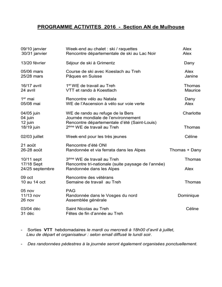 PROGRAMME ACTIVITES 2016 - Section AN de Mulhouse 09/10 janvier 30/31 janvier Week-end au chalet : ski / raquettes Rencontre départementale de ski au Lac Noir Alex Alex 13/20 février Séjour de ski à Grimentz Dany 05/06 mars 25/28 mars Course de ski avec Koeslach au Treh Pâques en Suisse Alex Janine 16/17 avril 24 avril 1er WE de travail au Treh VTT et rando à Koestlach Thomas Maurice 1er mai 05/08 mai Rencontre vélo au Natala WE de l’Ascension à vélo sur voie verte Dany Alex 04/05 juin 04 juin 12 juin 18/19 juin WE de rando au refuge de la Bers Journée mondiale de l’environnement Rencontre départementale d’été (Saint-Louis) 2ème WE de travail au Treh 02/03 juillet Week-end pour les très jeunes 21 août 26-28 août Rencontre d’été ONI Randonnée et via ferrata dans les Alpes 10/11 sept 17/18 Sept 24/25 septembre 3ème WE de travail au Treh Rencontre tri-nationale (suite paysage de l’année) Randonnée dans les Alpes 09 oct 10 au 14 oct Rencontre des vétérans Semaine de travail au Treh 05 nov 11/13 nov 26 nov PAG Randonnée dans le Vosges du nord Assemblée générale 03/04 déc 31 déc Saint Nicolas au Treh Fêtes de fin d’année au Treh Charlotte Thomas Céline Thomas + Dany Thomas Alex Thomas Dominique Céline - Sorties VTT hebdomadaires le mardi ou mercredi à 18h00 d’avril à juillet, Lieu de départ et organisateur : selon email diffusé le lundi soir. - Des randonnées pédestres à la journée seront également organisées ponctuellement.