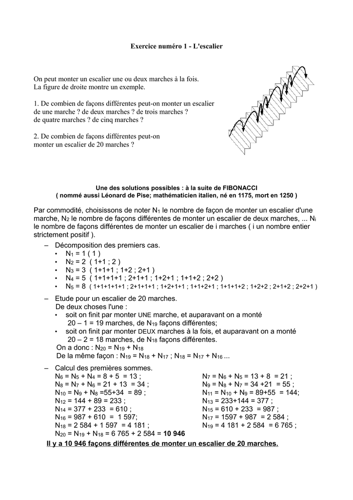 Exercice numéro 1 - L'escalier On peut monter un escalier une ou deux marches à la fois. La figure de droite montre un exemple. 1. De combien de façons différentes peut-on monter un escalier de une marche ? de deux marches ? de trois marches ? de quatre marches ? de cinq marches ? 2. De combien de façons différentes peut-on monter un escalier de 20 marches ? Une des solutions possibles : à la suite de FIBONACCI ( nommé aussi Léonard de Pise; mathématicien italien, né en 1175, mort en 1250 ) Par commodité, choisissons de noter N1 le nombre de façon de monter un escalier d'une marche, N2 le nombre de façons différentes de monter un escalier de deux marches, ... Ni le nombre de façons différentes de monter un escalier de i marches ( i un nombre entier strictement positif ). – Décomposition des premiers cas. • N1 = 1 ( 1 ) • N2 = 2 ( 1+1 ; 2 ) • N3 = 3 ( 1+1+1 ; 1+2 ; 2+1 ) • N4 = 5 ( 1+1+1+1 ; 2+1+1 ; 1+2+1 ; 1+1+2 ; 2+2 ) • N5 = 8 ( 1+1+1+1+1 ; 2+1+1+1 ; 1+2+1+1 ; 1+1+2+1 ; 1+1+1+2 ; 1+2+2 ; 2+1+2 ; 2+2+1 ) – Etude pour un escalier de 20 marches. De deux choses l'une : • soit on finit par monter UNE marche, et auparavant on a monté 20 – 1 = 19 marches, de N19 façons différentes; • soit on finit par monter DEUX marches à la fois, et auparavant on a monté 20 – 2 = 18 marches, de N18 façons différentes. On a donc : N20 = N19 + N18 De la même façon : N19 = N18 + N17 ; N18 = N17 + N16 ... – Calcul des premières sommes. N6 = N5 + N4 = 8 + 5 = 13 ; N7 = N6 + N5 = 13 + 8 = 21 ; N8 = N7 + N6 = 21 + 13 = 34 ; N9 = N8 + N7 = 34 +21 = 55 ; N10 = N9 + N8 =55+34 = 89 ; N11 = N10 + N9 = 89+55 = 144; N12 = 144 + 89 = 233 ; N13 = 233+144 = 377 ; N14 = 377 + 233 = 610 ; N15 = 610 + 233 = 987 ; N16 = 987 + 610 = 1 597; N17 = 1597 + 987 = 2 584 ; N18 = 2 584 + 1 597 = 4 181 ; N19 = 4 181 + 2 584 = 6 765 ; N20 = N19 + N18 = 6 765 + 2 584 = 10 946 Il y a 10 946 façons différentes de monter un escalier de 20 marches. Exercice numéro deux - Découpages et assemblage Le but du problème est la décomposition de certains triangles en deux triangles isocèles. L'usage des instruments traditionnels ( équerre, règle graduée, compas, rapporteur ) est autorisé et sans doute nécessaire. Il est rappelé que les problèmes de construction appellent une argumentation rédigée. 1. On considère un triangle rectangle ABC. Décomposer ce triangle en deux triangles isocèles. 2. a. On considère un triangle DEF. L'angle de sommet E mesure 35 degrés et l'angle de sommet F mesure 70 degrés. Décomposer ce triangle en deux triangles isocèles. b. Construire un triangle GHI différent des deux précédents tel que l'on puisse le décomposer en deux triangles isocèles. 3. On considère un triangle KLM isocèle et rectangle à la base de mesure x. Comment lui accoler un autre triangle isocèle afin d'obtenir un nouveau triangle isocèle ? Une des solutions possibles . 1. Soit un triangle rectangle. La médiane issue du sommet de l'angle droit a pour longueur la moitié de la longueur de l'hypoténuse. Nous décomposons ainsi facilement un triangle rectangle en deux triangles isocèles. 2. a. Soit un triangle DEF tel que DEF=35 ° et DFE=70 ° . Calculons une mesure du troisième angle : la somme des mesures des angles d'un triangle est égale à 180°, donc EDF=180− DEF DFE EDF=180−3570 EDF=75 ° Nous remarquons qu'en décomposant cet angle en un angle de 35° et un angle de 40°, nous obtenons deux triangles isocèles. En effet, – l'un aura deux angles de 35°, – l'autre aura un angle de 70°, un autre de 40° et le troisième de 180 – ( 70 + 40 ) = 70°. 2. b. Pour varier, cherchons à obtenir une décomposition semblable à l'illustration de l'énoncé. Construisons un premier triangle GHJ isocèle en G. Traçons ensuite le cercle de centre J et de rayon [ JH ]. Il coupe la demi-droite [ GJ ) en I. Les triangles GHJ ( isocèle en G ), et HIJ ( isocèle en J ), composent le triangle GHI. La décomposition ( un côté accolé à une base ) , est différente du cas 1 ( un côté commun et le même sommet ) et du cas 2. a. ( un côté commun mais des sommets différents ). 3. Nous pouvons chercher les différents assemblages possibles, en considérant un triangle KLM isocèle en K : assemblage côté - côté ( fig. 1 ; 4 ; 7 ) ; assemblage base du triangle 1 - côté du triangle 2 ( fig. 2 et 3 ) ; assemblage côté du triangle 1 - base du triangle 2 ( fig. 5 et 6 ) ; assemblage base - base ( pas de solution ) fig. 1 fig. 2 fig. 3 fig. 4 fig. 5 fig. 6 fig. 7 Etude. Nous cherchons à obtenir un triangle isocèle en accolant un triangle isocèle à un triangle KLM isocèle en K, d'angle à la base de mesure x ( en ° ), avec 0 x90 . – Cherchons d'abord à prolonger la base : KMN : • en accolant l'angle au sommet MNK= 180−KMN = 180−180− x = x . alors KML KMN=180° , et MKN= 2 2 2 3x x LKN= LKM MKN=180−2 x =180− D'où . 2 2 Les mesures des angles du triangle KLN sont donc 3x x ; KLN= x ; KNL= LKN=180− . 2 2 Le triangle KLN est isocèle si : x x= – , c'est-à-dire x = 0 : exclu ; 2 3x 5x =180 ; 5 x=360 ; x=72 ( fig.1 ) ; – ou x=180− , c'est-à-dire 2 2 3x 4x x =180− =180 ; 4 x=360 ; x=90 : exclu. – ou , c'est-à-dire 2 2 2 • KMN : en accolant un angle à la base alors KMLKMN=180 ; KMN=180− KML=180−x , et l'angle au sommet du triangle KMN mesure 180−2 KMN=180−2180− x=180−3602 x=2 x−180 : impossible avec 0 x90 . – Cherchons ensuite à prolonger l'un des côtés ( il revient au même de choisir [KM] ou [KN] ; nous choisissons ici [KM] ) • du côté de la base [LM] LMN : – par l'angle au sommet 180− LMN 180−180−x x LMN=180 MLN= MNL= = = . alors KML ° , et 2 2 2 Les mesures des angles du triangle KLN sont donc x 3x x LKN=180−2 x ; KLN= KLM MLN=x = ; KNL= . 2 2 2 Le triangle KLN est isocèle si : 3x 7x 360 180−2 x= ; x= – , c'est-à-dire 180= ( fig. 2 ) ; 2 2 7 x 5x ; 5 x=360 ; x=72 ( fig. 3 ) ; – ou 180−2 x