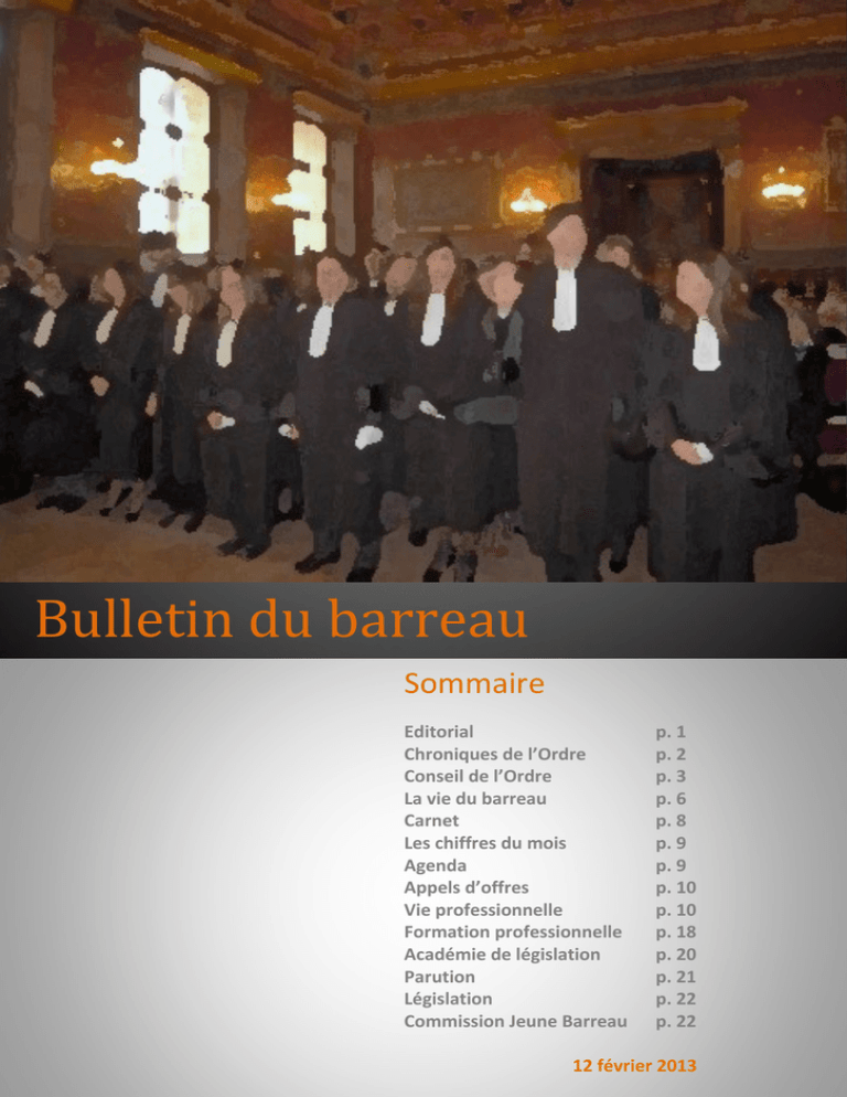 Bulletin du barreau Sommaire Editorial Chroniques de l’Ordre Conseil de l’Ordre La vie du barreau Carnet Les chiffres du mois Agenda Appels d’offres Vie professionnelle Formation professionnelle Académie de législation Parution Législation Commission Jeune Barreau p. 1 p. 2 p. 3 p. 6 p. 8 p. 9 p. 9 p. 10 p. 10 p. 18 p. 20 p. 21 p. 22 p. 22 12 février 2013 EDITORIAL Le monde bouge. Notre société évolue, se modernise, grandit à une vitesse telle que nous avons du mal à la suivre. Nous constatons que cette évolution se traduit également dans notre activité professionnelle par une judiciarisation accrue, par une inflation démesurée des textes de lois, par la dématérialisation des actes de procédure. Le monde des avocats évolue de la même manière, la France en dénombrant plus de 55 000. Le barreau de Toulouse suit cette évolution exponentielle, puisque près de 1 350 avocats le composent et ce nombre atteindra le chiffre de 2 000 dans moins de 10 ans. Nous devons prendre en compte cette évolution et nous moderniser. A l’image des quelques barreaux précurseurs, étrangers (Bruxelles, Liège, Montréal, Québec) ou français (Paris, Lyon, Montpellier), le barreau de Toulouse a souhaité créer une page Facebook qui s’inscrit dans l’effort permanent d’ouverture et donne l’image d’un barreau moderne. Cette présence sur le Web permettra de valoriser l’activité de l’Ordre : colloques, séminaires, formations, forum et autres manifestations à l’égard d’un large public, qu’il s’agisse de l’ensemble des avocats français ou étrangers ou de simples particuliers. Et nous sommes un barreau moderne ! Cette évolution ne s’arrêtera donc pas là. Le barreau envisage de mettre en place des applications pour téléphones mobiles (Apple, Androïd, BlackBerry…) pour optimiser notre site internet. Par un simple clic, le barreau de Toulouse pourra ainsi être consulté aux quatre coins du monde. Le monde bouge, nous bougerons avec lui. Frédéric Douchez Bâtonnier de l’Ordre Bulletin interne réalisé pour l’ordre des avocats sous la direction du Bâtonnier Frédéric Douchez Comité de rédaction : Laurence Després, Véronique Christoph www.avocats-toulouse.com - Email : [email protected] 1 12 février 2013, n°176 CHRONIQUES DE L’ORDRE Encore ! Aurais-je pensé que plus de quarante éditoriaux me condamnaient au silence, au moins provisoire ? Erreur, puisque à peine l’Epiphanie passée, je recevais une lettre de notre bâtonnier m’invitant à préparer un « petit » éditorial pour un prochain bulletin. J’avais tellement peu anticipé cette demande que l’inquiétude me prit aussitôt. Qu’allais-je bien pouvoir vous dire ? L’exercice me parut d’abord impossible car l’Ordre n’a qu’un chef, dont la légitimité est totale et qui ne survit pas à l’échéance d’un mandat. Il fallait tout changer à mes habitudes des années passées. Mais je trouvais que j’avais déjà beaucoup écrit et puis je ne suis pas de ceux qui se bercent de l’illusion puérile de mérites dont ils sont les seuls à entretenir la nostalgie ; pas question donc, d’évoquer hier qui n’intéresse déjà plus personne. Alors, j’ai pensé qu’une fois encore, l’histoire serait une planche de salut, avec d’autant plus de facilité que le Conseil vient de me déléguer cette tâche exaltante. Elle l’est parce que le rappel du passé permet aussi de comprendre comment Thierry Lévy peut trouver miraculeux le talent de Tixier-Vignancour, bien qu’il ait tout pour lui déplaire. Un souvenir personnel, ancien et donc embelli par la nostalgie de la jeunesse : celui de Jacques Isorni entouré par une promotion de secrétaires dont certains se refusaient à serrer la main de l’avocat du maréchal Pétain, celui d’un vieux monsieur disant à ses jeunes confrères des phrases magnifiques d’une voix émue et digne dans un recueillement presque religieux et qui fit descendre sur nous l’amour éternel de nos différences. Et puis il y a ce que disait Stephen Hecquet à Bredin qui venait d’achever son discours de Rentrée : « Ne les écoute pas, tu as été éloquent, c’est-à-dire mauvais, très mauvais… Ils ne savent pas… L’éloquence, c’est tout autre chose… Promets-moi, plus jamais l’emphase, plus jamais le vent pour gonfler les mots ». Jean-Marc Varaut (que Roland Dumas, qui fut son associé en dépit de leurs convictions opposées, qualifie « d’un avocat sans pareil, digne des plus grands… un homme exceptionnel ») ne dit pas autre chose : « Plaider, c’est l’art de donner un corps à une cause, non des mots à un discours… L’art de plaider, c’est alors de rendre invisible la technique… ». Pascal Saint Geniest Ancien Bâtonnier 2 12 février 2013, n°176 CONSEIL DE L’ORDRE Réunion du 7 janvier 2013 Une minute de silence est respectée en mémoire de Monsieur Yves Colombié, décédé. Réunion du GIE des CARPA du 11 décembre 2012 Une assemblée générale extraordinaire s’est tenue le 11 décembre 2012 au cours de laquelle, il a été acté la démission de Madame Fando-Colina Christiane du Barreau de Bayonne, de Madame Mendiboure Anne-Marie du Barreau de Bayonne et la volonté du barreau et de la CARPA de Bayonne de quitter le GIE, ce qui a été accepté. Le GIE continuera entre les barreaux d’Agen et de Toulouse. Madame Annick Amigo-Bouyssou a été nommée Présidente du GIE, Monsieur Ludovic Valay a été nommé trésorier, Monsieur Xavier Lecomte a été nommé secrétaire et Monsieur Eric Dardenne a été nommé contrôleur de gestion. Groupement de travail procédure participative et expertises La compagnie des experts, représentée par Yves Baduel, a souhaité associer l’Ordre des Avocats au travail lié à la mise en place d’une procédure participative, notamment pour œuvrer à la définition de mission types. Le Conseil de l’Ordre s’est déclaré favorable à cette d