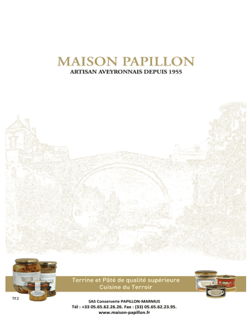 TF2 SAS Conserverie PAPILLON-MARMUS Tél : +33 05.65.62.26.26. Fax : (33) 05.65.62.23.95. www.maison-papillon.fr Tarif Détaillant 2015 En vigueur au 01/01/2015 Prix Franco de port sur France Métropolitaine si commande supérieure à 290 € Sinon participation au frais de transport de 15 € HT Recettes Tradition Conserve 130g en conditionnement par 6 La gamme Tradition reprend les classiques qui étaient déjà proposés par mes parents et grands-parents. Des recettes à découvrir ou redécouvrir pour le plaisir des papilles. Gencode - EAN13 Réf. Recettes Prix Unitaire HT 1001 Terrine Sansonnet au Genièvre 1,78 € 1002 Terrine de Lièvre au Thym 1,78 € 1003 Terrine de Sanglier - Elaborée au couteau * 1,78 € 1004 Terrine de Canard 1,78 € 1006 Terrine de Lapin au Romarin 1,78 € 1008 Terrine de Foie de Volaille au Genièvre 1,78 € 1009 Terrine de Chevreuil aux Noisettes 1,78 € 1010 Terrine de Pintade aux Cèpes 1,78 € 1011 Terrine de Caille aux Raisins 1,78 € 1012 Terrine au Roquefort 1,78 € 1013 Terrine de Campagne pur porc - Elaborée au couteau * 1,78 € 1014 Terrine Provençale Tomate & Olives noires - Nouveau - 1,78 € 1016 Terrine aux Châtaignes des Cévennes 1,78 € 1020 Terrine Aveyronnaise aux Noix - Elaborée au couteau * 1,78 € * Recette élaborée au couteau, texture « gros grain » pour plus de matière en bouche. Consistance rustique respectant la typicité des Artisans Charcutiers. Recettes Tradition Verrine 160g en conditionnement par 6 Gencode - EAN13 Réf. Recettes Prix Unitaire HT 1901 Terrine de Campagne aux Oignons doux 1,98 € 1906 Terrine de Sanglier aux Châtaignes 1,98 € 1907 Terrine de Canard aux Pistaches - Nouveau - 1,98 € 1909 Terrine de Chevreuil aux Champignons des bois 1,98 € 1921 Terrine au Roquefort 1,98 € 1924 Terrine au Fromage de Brebis à la Tomate & Romarin 1,98 € Recettes Gastronomie Conserve 130g en conditionnement par 6 Avec deux ouvertures faciles, vous pourrez aisément présenter votre terrine dans une assiette. Souvent consommée en apéritif dînatoire avec beaucoup de convivialité. 1602 Terrine de Magret de Canard au Miel - Pur Volaille * 1,98 € 1603 Terrine de Canard aux Figues 1,98 € 1604 Terrine de Lapin à la Tomate & Basilic 1,98 € 1605 Terrine au Roquefort & Noix 1,98 € 1606 Terrine aux Noix & Miel 1,98 € 1607 Terrine de Dinde au Confit d’Oignon doux 1,98 € 1612 Terrine de Chevreuil aux Fruits rouges 1,98 € 1613 Terrine de Volaille au Gingembre & Citron confit 1,98 € - Pur Volaille * - Nouveau 1615 Terrine de Canard au Pain d’Epices 1,98 € 1616 Terrine de Canard aux Cèpes & Gingembre 1,98 € 1617 Terrine de Faisan aux Champignons des bois 1,98 € 1618 Terrine au Fromage de Chèvre au Miel & Amandes 1,98 € 1610 Terrine de Canard au Jus de Truffe - Pur Volaille * - Nouveau 2,38 € 1611 Terrine de Canard au Foie-gras - Pur Volaille * * Recette Volaille origine France sans porc 2,38 € Recettes 50% Foie-gras Verrine 110g en conditionnement par 6 Notre savoir faire associé au noble foie-gras de canard. Un régal pour les gourmets... Recettes Pur Canard. 0900 Terrine Canard au Foie-gras 3,38 € 0901 Terrine de Canard au Foie-gras Pain d’épices & Gingembre 3,38 € 0903 Terrine Foie-gras aux Morilles & Armagnac 3,38 € 0904 Terrine Foie-gras aux Figues & Muscat 3,38 € 0906 Terrine Foie-gras Amandes & Miel 3,38 € 0907 Terrine Foie-gras Truffé 4,38 € Recette Canard origine France sans porc Sélection Foie Gras en conditionnement par 12 Festive et tellement délicieuse, cette sélection est destinée aux amateurs des plaisirs de la table. 3023 Foie Gras de Canard entier 130g. 12.38 € 3000 Foie Gras de Canard entier 190g. 15.88 € 3010 Foie Gras de Canard entier 350g. 25.58 € 3001 Bloc de Foie Gras 130g. 9.08 € 3002 Caille Farcie au Foie Gras 190g. 8.38 € 3005 Cou de Canard farci au Foie-gras 400g. 8.08 € 3007 Ballottine de Foie de Canard aux Morilles 130g. 4.88 € Confits de Condiments & fruits Verrine 140g en conditionnement par 6 Le compagnon idéal du Foie Gras et des autres petits plats… 0801 Confit d’Oignon au Caramel 2.38 € 0802 Confit de Figue à la Framboise 2.38 € 0900 Terrine Foie-gras 50% 3,37 € 0901 Terrine Foie-gras 50% Pain d’épices & Gingembre 3,37 € Sélection Cuisine du Terroir en conditionnement par 6 Cette sélection de mets de nos régions est un recueil de recettes Aveyronnaises fortement influencées par les cuisines des départements voisins qui partagent nos valeurs. 7.48 € 3012 Confit de Canard 2 cuisses conserve 765g. 3020 Confit de Canard 4 cuisses conserve 1 345g. 3013 Jambonneau bocal 200g. 3.08 € 3014 Fritons de Canard conserve 200g. 2.78 € 2304 Tripoux Tradition par 4 bocal 400g. 5.28 € 2306 Tripoux Tradition par 6 bocal 600 g. 7.18 € 2308 Tripoux Tradition par 8 bocal 800g. 8.58 € 3008 Cassoulet au Confit de Canard conserve 840g. 6.28 € 2314 Cassoulet au Confit de Canard bocal 800g - Nouveau 5.98 € 2209 Jambonneau aux Lentilles bocal 400g. 2.78 € 2309 Jambonneau aux Lentilles bocal 800g. 4.38 € 2210 Potée d'Auvergne aux Choux bocal 400g. 3.08 € 2310 Potée d'Auvergne aux Choux bocal 800g. 4.98 € 2211 Sauté de Cerf sauce Forestière bocal 360g. 2311 Sauté de Cerf sauce Forestière bocal 760g. 2212 Daube Bœuf race Aubrac au vin bocal 360g. 2312 Daube Bœuf race Aubrac au vin bocal 760g. 6.28 € 2213 Mijoté d’Agneau aux Haricots blancs bocal 400g. 4.38 € 2313 Mijoté d’Agneau aux Haricots blancs bocal 800g. 6.88 € 13.98 € Cette sélection de mets de nos régions est un recueil de recettes Aveyronnaises fortement influencées par les3003 cuisines des départements voisins qui partagent nos valeurs. Gésiers de Canard confit conserve 380g. 6.28 € Nouvelle Recette 30% de viande 4.38 € 6.98 € Nouvelle Recette 30% de viande 3.78 € Recettes & Délices de Légumes Verrine 140g en conditionnement par 6 0812 Délice Provençal Tomate & Olives noires 2.98 € 0821 Recet