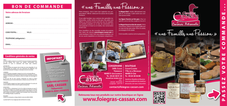 Notre entreprise situé à Saint Jean Lagineste vous propose depuis 1989 de redécouvrir les saveurs de vos pâtés d’enfance. Votre adresse de livraison NOM : D’une taille Familiale, nous cuisinons des spécialités traditionnelles, confits, terrine au foie gras...Nos pâtés sont affinés au minimum 6 mois avant de vous les expédier. Les produits proposés sur ce bon de commande vous sont proposés en bocal ou en boîtes, leur conservation est de 3 ans. ADRESSE : CODE POSTAL : Nous travaillons sur des nouvelles recettes de produits frais. Notre site internet www.foiegras-cassan.com et notre boutique à Saint Céré vous propose quelques uns de nos succès (expédition en chronopost uniquement) : VILLE : Le Magret Roti : tendre, délicatement rosé, prêt en 10 minutes, il plait autant aux cuisiniers qu’aux invités. Les figues Fourrés au foie gras : Pour un apéritif, à servir très frais, coupé en 2 ou en 4. Le Magret fourré au foie de canard : Prêt à consommer, l’alliance d’un magret grillé avec un cœur de foie gras entier. Divin en entrée, accompagné d’une salade. Et de nouvelles surprises sont en préparation. TÉLÉPHONE (obligatoire) : EMAIL : 5 Renvoyer de le bon de comman avec le règlement te : à l’adresse suivan ISANALE CONSERVERIE ART SARL CASSAN Trémenouze GINESTE 46400 St-JEAN LA dimanche, de mars à décembre « une Famille, une Passion » PASSEZ VOTRE COMMANDE... BON DE COMMANDE Désignation Prix Poids Prix QtéMontant au kg Net Unitaire Désignation Prix Poids Prix QtéMontant au kg Net Unitaire Désignation Prix Poids Prix QtéMontant au kg Net Unitaire Foie Gras de Canard Entier Pâté de Campagne Boite Maigre, gras et 20% de foie de porc, sel, poivre, épices, cognac 14,21 190 g 130 g 2,70 2,10 . . . . . . . . . . . . . . . . . . . . . Cassoulet aux Manchons de Canard 8,05 16,15 12,38 Pâté de Campagne aux Cèpes 22,69 130 g 2,95 . . . . . . . . . . . . . . . . . . . . . Haricots lingots, manchons confits, Boite saucisse de Toulouse (maigre et gras de porc, boyaux naturels de porc), eau, oignons, concentré de tomate, sel, poivre, thym, laurier Haricots Blancs Cuisinés Boite 7,63 380 g 2,90 . . . . . . . . . . . . . . . . . . . . . Boite 11,58 600 g 6,95 . . . . . . . . . . . . . . . . . . . . . Boite 6,00 600 g 3,60 . . . . . . . . . . . . . . . . . . . . . Boite 7,19 320 g 2,30 . . . . . . . . . . . . . . . . . . . . . Bocal 106,25 Foie gras de canard, sel, poivre 113,94 480 g 330 g 180 g 130 g 250 g 51,00 37,60 22,50 16,95 26,90 . . . . . . . . . . . . . . . . . . . . . Foie gras de canard reconstitué, eau, 73,08 130 g sel, poivre84,62 65 g 190 g 13,40 9,50 5,50 . . . . . . . . . . . . . . . . . . . . . Terrine au Foie de Canard 9,95 . . . . . . . . . . . . . . . . . . . . . 125,00 130,38 Boite107,60 Bloc de Foie Gras de Canard Boite 70,53 Bocal52,37 190 g . . . . . . . . . . . . . . . . . . . . . . . . . . . . . . . . . . . . . . . . . . . . . . . . . . . . . . . . . . . . . . . . . . . . . . . . . . . . . . . . . . . . . . . . . . . . . . . . . . . . . . . . . . . . . . . . . . . . . . . . . . . . . . Chair de porc, foie gras de canard 30% sel, poivre, épices, cognac Médaillon de Foie de Canard 50% Boite 46,84 50% de bloc de foie de canard, maigre, gras et foie de porc, sel, poivre, épices, cognac 50,77 Pâté au Foie de Canard 30% 32,82 190 g 130 g 8,90 6,60 . . . . . . . . . . . . . . . . . . . . . . . . . . . . . . . . . . . . . . . . . . Boite Maigre, gras et foie de porc, cèpes (Bolétus cedulis 15%), sel, poivre, épices, huile arachide, cognac Pâté de Campagne aux Châtaignes22,69 Maigre, gras et foie de porc, châtaignes 15%, 25,26 sel, poivre, épices, cognac 130 g Boite - 190 g Bocal 130 g 190 g 2,95 4,80 . . . . . . . . . . . . . . . . . . . . . Pâté de Sanglier 24,62 130 g 3,20 . . . . . . . . . . . . . . . . . . . . . 32,63 190 g 6,20 . . . . . . . . . . . . . . . . . . . . . Boite Galantine de Dinde au Foie de Canard Filet de dinde, épaule de porc, foie de canard 20%, sel, poivre Boite 12,80 8,50 4,95 . . . . . . . . . . . . . . . . . . . . . . . . . . . . . . . . . . . . . . . . . . Galantine de Dinde Boite Filet de dinde, épaule de porc, sel, poivre 260 g Maigre, gras et foie de porc, 18% de 27,69 130 g bloc de foie de canard, sel, poivre, épices, cognac 5,95 3,60 . . . . . . . . . . . . . . . . . . . . . Cuisses de Canard Confites Maigre, gras et foie de porc, 30% de bloc 34,00 de foie de canard, sel, poivre, épices, cognac38,08 Pâté de Canard Terrine du Délice Boite Boite 22,88 23,16 190 g 4,40 . . . . . . . . . . . . . . . . . . . . . . . . . . . . . . . . . . . . . . . . . . . . . . . . . . . . . . . . . . . . . . . . . . . . . . . . . . . . . . . . . . . . Maigre, gras et foie de porc, viande de sanglier, sel, poivre, épices, cognac 390 g 250 g 130 g Boite . . . . . . . . . . . . . . . . . . . . . Cuisses de canard, graisse, sel 22,63 390 g 190 g 7,50 4,30 . . . . . . . . . . . . . . . . . . . . . . . . . . . . . . . . . . . . . . . . . . 4 cuisses - Boite 3 cuisses - Boite 2 cuisses - Boite 12,23 12,20 12,75 1300 g 15,90 1000 g 12,20 800 g 10,20 . . . . . . . . . . . . . . . . . . . . . . . . . . . . . . . . . . . . . . . . . . Boite 23,63 800 g 18,90 . . . . . . . . . . . . . . . . . . . . . Friton au Foie de Canard Manchons de Canard Confits 5 à 6 /Boite 7,90 1000 g 7,90 . . . . . . . . . . . . . . . . . . . . . 2 magrets de canard, graisse, sel 190 g 9,50 . . . . . . . . . . . . . . . . . . . . . Maigre et gras de canard, foie de canard 20%, cœur de canard, sel, poivre, épices Friton Pur Canard (100% Canard) 23,80 Maigre et gras de canard, cœur de canard, sel, poivre, épices 30,38 Friton (50% Canard / 50% Porc) 20,79 Viande de canard, viande de porc, sel, poivre, épices Boite Manchons de canard, graisse, sel Gésiers de Canard Confits Boite 250 g 130 g 190 g 5,95 3,95 3,95 . . . . . . . . . . . . . . . . . . . . . . . . . . . . . . . . . . . . . . . . . . . . . . . . . . . . . . . . . .