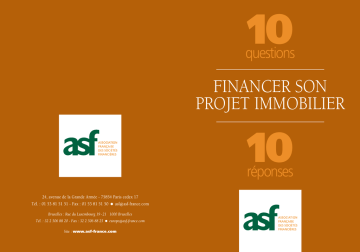 10 questions FINANCER SON PROJET IMMOBILIER 10 réponses 24, avenue de la Grande Armée - 75854 Paris cedex 17 Tél. : 01 53 81 51 51 - Fax : 01 53 81 51 50 ! asf @ asf-france.com Bruxelles : Rue du Luxembourg 19 - 21 1000 Bruxelles Tél. : 32 2 506 88 20 - Fax : 32 2 506 88 25 ! europe @ asf-france.com Site : www.asf-france.com La liste des sociétés de financement immobilier est régulièrement mise à jour sur le site ASF : www.asf-france.com FINANCER SON PROJET IMMOBILIER SOMMAIRE 1 /10 Pourquoi s’adresser à un établissement spécialisé dans le financement immobilier ? 2 /10 Votre projet immobilier : comment choisir ? 3 /10 De quelle protection légale bénéficiez-vous ? 4 /10 Comment déterminer votre crédit ? 5 /10 Taux fixe ou taux révisable ? 6 /10 Quels sont les atouts de l’offre des établissements de crédit spécialisés ? 7/10 Quelles assurances et quelles solutions alternatives ? 8 /10 Quelles garanties fournir pour obtenir votre prêt immobilier ? 9 /10 Comment compléter avantageusement votre financement ? 10 /10 Quel est le coût de votre crédit immobilier ? 1 Question /10 Pourquoi s’adresser à un établissement spécialisé dans le financement immobilier ? L es établissements de crédit spécialisés dans le financement immobilier étudient avec vous les moyens de financer tous vos projets immobiliers : l’acquisition de votre résidence principale ou secondaire, la réalisation d’un investissement locatif ou encore l’amélioration ou la rénovation de votre bien immobilier. L’apport des établissements spécialisés réside d’abord dans la large gamme de financements qu’ils élaborent pour s’adapter à tous les types de besoins et garantir une réponse rapide et complète. Cette gamme de financements comprend notamment les crédits à taux révisable (ou taux variable) qui offrent une véritable alternative aux prêts à taux fixe : souplesse, taux attractifs, bénéfice des baisses des taux, etc. Leur spécialisation et leur connaissance approfondie du marché font des établissements spécialisés les principaux promoteurs et distributeurs de ces financements. L’apport des établissements spécialisés réside Réponse aussi dans leur capacité à financer 100 % du montant de votre projet immobilier sans exiger systématiquement d’apport personnel. Enfin, outre les nombreuses options offertes sur le marché (différé des premières mensualités, report d’échéance, modulation des échéances, transfert du prêt sur une nouvelle acquisition), les établissements spécialisés optimisent la prise en compte des prêts aidés auxquels vous avez droit pour que vous ayez toujours une mensualité de remboursement constante, sans à-coups budgétaires. Pour répondre à vos attentes, les établissements spécialisés dans le financement immobilier mettent à votre disposition leur savoirfaire spécifique sur les plans financier et juridique. 2 Question /10 Votre projet immobilier : comment choisir ? Réponse A chacun son projet immobilier Le choix d’un bien est un choix objectif pour chacun, il s’agit de répondre à un besoin : ● acquérir une habitation principale ou secondaire, ● ou conforter un revenu complémentaire grâce à un investissement locatif, par exemple en vue de la retraite, ● ou recomposer son patrimoine notamment en bénéficiant des avantages fiscaux. C’est également un choix éminemment subjectif : ● par la localisation de son bien correspondant à un choix de vie (habitation principale ou résidence secondaire notamment) : centre ville ou campagne, proximité des commerces, écoles, transports, évo- lution prévisible de l’environnement, ... ● par le type de bien recherché : neuf ou ancien, collectif ou individuel. Pièges à éviter, conseils à rechercher Vous achetez dans l’ancien : ● Vérifiez l’état du logement et de l’immeuble (toiture, murs, électricité, chauffage...) et tenez compte des travaux à envisager. ● Pensez à vous renseigner en cas de copropriété auprès du syndic afin d’appréhender les travaux votés ou à voter, les charges à payer. ● La loi vous protège : votre logement doit être mesuré pour définir la surface habitable (loi Carrez). Le vendeur doit fournir un certain nombre d’informations ▼ Réponse 2 / 10 sur l’état du bâti : état parasitaire, plomb, amiante (en fonction de la date de construction du bien). Ces informations doivent être établies par des cabinets d’experts. ● Assurez-vous que l’ensemble des prêts sollicités figurent bien dans votre promesse ou votre compromis de vente. Vous achetez dans le neuf : Comparez les programmes, renseignezvous sur la nature et la qualité de la construction, les équipements collectifs, la date d’achèvement. ● En cas de copropriété : renseignez-vous sur le règlement de copropriété ou du lotissement. ● Renseignez-vous sur les droits et obligations de l’acheteur et du vendeur en fonction du contrat que vous allez signer : - Contrat « clé en mains » si vous achetez un logement neuf terminé, - Contrat de Vente en Etat Futur d’Achèvement (VEFA) si vous achetez un logement neuf non achevé (sur plan), - Contrat de construction avec différentes modalités si vous faites construire votre maison. ● Vous achetez pour réaliser un investissement locatif : ● Renseignez-vous sur les différents avantages fiscaux liés au neuf ou à l’ancien (loi Besson par exemple) et sur leurs conditions d’application. ● Soyez vigilants : ce n’est pas parce que vous achetez pour louer qu’il ne faut pas vérifier la localisation du bien, les conditions d’offre et de demande (facilité de mise en location d’un bien) et le niveau des loyers pratiqués. A qui vous adresser pour trouver votre bien immobilier ? Recherche individuelle (annonces presse, Internet), mais plus souvent recours aux professionnels, pour trouver ou construire le bien envisagé (agences immobilières, notaires