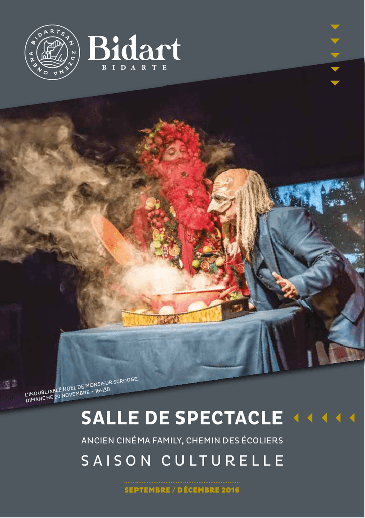 R SCROO ONSIEU ËL DE M O N 30 H LE B 16 LIA EL’INOUB OV E M B R HE 20 N DIMANC GE SALLE DE SPECTACLE ANCIEN CINÉMA FAMILY, CHEMIN DES ÉCOLIERS S A I S O N C U LT U R E L L E SEPTEMBRE / DÉCEMBRE 2016 SPECTACLE ASSOCIATIF LA COMPAGNIE HORIZON VERTICAL PRÉSENTE, DANS LE CADRE DE L’ÉVÉNEMENT UNE SAISON UN AUTEUR, LA PREMIÈRE ÉDITION 2016 : ERIC EMMANUEL SCHMITT PETITS CRIMES CONJUGAUX VENDREDI 9 SEPTEMBRE - 21H L’AUTEUR « Un auteur de théâtre ne voyage pas seul. Il faut qu’on le porte. Non qu’il soit grabataire, mais parce que, vivant ou mort, il a besoin du soutien et de la force des artistes. Si mon texte vous parvient ce soir, c’est grâce à la passion des comédiens qui en ont fait leur carburant pour brûler les planches. Merci à Franck Godard et à la compagnie Horizon vertical. » Ma vocation pour le théâtre est née grâce à un écrivain qui avait un rapport essentiel avec le PaysBasque, Edmond Rostand. Plusieurs décennies après, mes pièces vont me conduire – car je viendrai- à découvrir cette terre singulière. Décidément, Cyrano mène à tout ! Eric-Emmanuel Schmitt DISTRIBUTION Direction artistique : Franck Godard Plus d’informations : https://www.facebook. com/TheatreHorizonVertical/ Interprètes : Rozenn Castera & Franck Godard BILLETTERIE L’HISTOIRE Après un accident, Gilles devient amnésique. De retour chez lui, il cherche à reconstituer son passé avec celle qui revendique être son épouse. Au fur et à mesure des discussions entre Gilles et Lisa, il tente de comprendre celui qu’il était (ses passe temps, qualités, défauts…). Le portrait que lui dresse cette femme qu’il ne reconnaît pas, est-il vrai ? Et lui estil aussi amnésique qu’il ne le laisse paraître ? Vous le saurez ce soir !!! Plein tarif : 15 euros Tarif réduit : 12 euros (demandeur d’emploi, minima sociaux et -25 ans). Sur place et en pré-ventes à l’Office de tourisme. BUVETTE ET RESTAURATION SUR PLACE À PARTIR DE 19H SPECTACLE MAIRIE SPECTACLE DE MÉMOIRE PRODIGIEUSE ORGANISÉ DANS LE CADRE DE LA SEMAINE BLEUE BENOIT ROSEMONT J’AI OUBLIÉ UN TRUC… MAIS ÇA VA REVENIR SAMEDI 8 OCTOBRE - 16H30 Dans une présentation moderne et théâtralisée, Benoît Rosemont remet au goût du jour les démonstrations de «Mémoire Prodigieuse» qui brillèrent au début du XXème siècle dans le Paris des salons. S’appuyant sur des démonstrations mnémotechniques surprenantes et des calculs prodigieux, ce «mémo-mentaliste» sait faire rire et sourire. DURÉE : 1H20 - TOUT PUBLIC - DÈS 8 ANS DISTRIBUTION Mise en scène : Daniel Krellenstein Costumes : Lucie Toupin Arrangements musicaux : Katy Varda La mise en scène de ses expériences rend chaque spectateur actif d’un bout à l’autre du spectacle. Devenu spect-acteur de cette comédie cérébrale, le public passe alternativement de l’étonnement à l’amusement face à ce phénomène sympathique... au bord de la rupture. Sa mémoire est prodigieuse, mais tiendrat-il le coup ? FESTIVAL BIDART EN RIRE 7ÈME ÉDITION DU 18 AU 20 NOVEMBRE SPECTACLE MAIRIE BIDART EN RIRE COMÉDIE THÉÂTRALE PAS D’PANIQUE ! C’EST LA POLICE … VENDREDI 18 NOVEMBRE - 21H DURÉE : 1H30 - TOUT PUBLIC DÈS 10 ANS DISTRIBUTION Par : Nicolas Taffin Mis en scène par : Nicolas Taffin Avec : Juliette Marcelat / Sébastien Perez / Arnaud Bichon L’HISTOIRE Claire Madoue, journaliste d’investigation, doit réaliser un reportage dans le commissariat en charge d’arrêter une bande de braqueurs qui échappe aux forces de l’ordre. Quand elle fait la connaissance des responsables de l’enquête, Ben et Somoni, elle est sûre d’une chose : le gang n’est pas prêt d’être arrêté… Mais avec ces deux spécimens, elle tient le reportage de sa vie. De l’action, une histoire d’amour, des interrogatoires plein de tendresse, une intrigue palpitante, plongez au coeur de ce commissariat azimuté. SPECTACLE MAIRIE BIDART EN RIRE COMÉDIE THÉÂTRALE LE MARIAGE NUIT GRAVEMENT À LA SANTÉ SAMEDI 19 NOVEMBRE - 18H ET 21H (2 SÉANCES IDENTIQUES) DURÉE : 1H30 - TOUT PUBLIC DÈS 10 ANS DISTRIBUTION Par : Live Productions Mis en scène par : Elodie Walace et Pierre Leandri Avec : Elodie Wallace / Rui Manuel Da Silva / Yan Richard / Emmanuelle Graci L’HISTOIRE « Business woman » et « homme au foyer » : chez Sophie et Romain autant dire que c’est le monde à l’envers ! Chacun y trouve son compte jusqu’au jour où Micheline Du Puy Montbrun, bien décidée à marier son fils, débarque à l’improviste afin de rencontrer la fameuse Sophie… Le hic, c’est qu’elle ne se doute pas que son viril de Rominou se prend pour une « desperate housewife »… Le mariage c’est comme les enterrements, c’est bien seulement quand on n’est pas dans la première voiture ! Portes qui claquent, quiproquo et courses poursuites. Attention une comédie explosive ! Le saviez-vous ? Après 5 ans à Paris et en tournée avec 350 000 spectateurs, le Mariage revient pour une 6ème saison dans une version encore plus déjantée !!! VENDREDI SOIR ET SAMEDI SOIR À PARTIR DE 20H À L’ENTRÉE DE LA SALLE DE SPECTACLE, L’ASSOCIATION BIDART ‘E’ NEA VOUS PROPOSE DE VENIR PARTAGER UN MOMENT CONVIVIAL, PRENDRE UN VERRE, DÉGUSTER UN TALO… SPECTACLE MAIRIE BIDART EN RIRE THÉÂTRE L’INOUBLIABLE NOËL DE MONSIEUR SCROOGE D’APRÈS CHARLES DICKENS - ADAPTÉ PAR EVELYNE LOEW COMPAGNIE THÉÂTRE LES PIEDS DANS L’EAU DIMANCHE 20 NOVEMBRE – 16H30 DURÉE : 50MIN PUBLIC FAMILIAL À PARTIR DE 7 ANS DISTRIBUTION Mise en scène : Violette Campo Avec : Violette Campo, Frédéric Garcès et Médéric Grandet Costumes et masques : Véronique Strub Vidéo et musique : Médéric Grandet Lumière : Dominique Prunier L’HISTOIRE Toute la ville s’apprête à fêter Noël… sauf Monsieur Scrooge, un riche marchand solitaire et insensible, connu pour son avarice. Mr. Scrooge aborde la période de Noël avec son dédain habituel, maltraitant