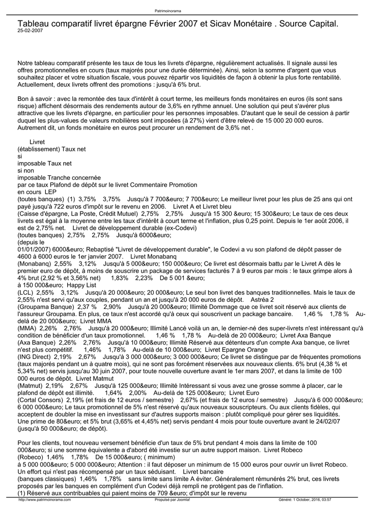 Patrimoinorama Tableau comparatif livret épargne Février 2007 et Sicav Monétaire . Source Capital. 25-02-2007 Notre tableau comparatif présente les taux de tous les livrets d'épargne, régulièrement actualisés. Il signale aussi les offres promotionnelles en cours (taux majorés pour une durée déterminée). Ainsi, selon la somme d'argent que vous souhaitez placer et votre situation fiscale, vous pouvez répartir vos liquidités de façon à obtenir la plus forte rentabilité. Actuellement, deux livrets offrent des promotions : jusqu'à 6% brut. Bon à savoir : avec la remontée des taux d'intérêt à court terme, les meilleurs fonds monétaires en euros (ils sont sans risque) affichent désormais des rendements autour de 3,6% en rythme annuel. Une solution qui peut s'avérer plus attractive que les livrets d'épargne, en particulier pour les personnes imposables. D'autant que le seuil de cession à partir duquel les plus-values de valeurs mobilières sont imposées (à 27%) vient d'être relevé de 15 000 20 000 euros. Autrement dit, un fonds monétaire en euros peut procurer un rendement de 3,6% net . Livret (établissement) Taux net si imposable Taux net si non imposable Tranche concernée par ce taux Plafond de dépôt sur le livret Commentaire Promotion en cours LEP (toutes banques) (1) 3,75% 3,75% Jusqu'à 7 700€ 7 700€ Le meilleur livret pour les plus de 25 ans qui ont payé jusqu'à 722 euros d'impôt sur le revenu en 2006. Livret A et Livret bleu (Caisse d'épargne, La Poste, Crédit Mutuel) 2,75% 2,75% Jusqu'à 15 300 € 15 300€ Le taux de ces deux livrets est égal à la moyenne entre les taux d'intérêt à court terme et l'inflation, plus 0,25 point. Depuis le 1er août 2006, il est de 2,75% net. Livret de développement durable (ex-Codevi) (toutes banques) 2,75% 2,75% Jusqu'à 6000€ (depuis le 01/01/2007) 6000€ Rebaptisé "Livret de développement durable", le Codevi a vu son plafond de dépôt passer de 4600 à 6000 euros le 1er janvier 2007. Livret Monabanq (Monabanq) 2,55% 3,12% Jusqu'à 5 000€ 150 000€ Ce livret est désormais battu par le Livret A dès le premier euro de dépôt, à moins de souscrire un package de services facturés 7 à 9 euros par mois : le taux grimpe alors à 4% brut (2,92 % et 3,56% net) 1,83% 2,23% De 5 001 € à 150 000€ Happy List (LCL) 2,55% 3,12% Jusqu'à 20 000€ 20 000€ Le seul bon livret des banques traditionnelles. Mais le taux de 2,55% n'est servi qu'aux couples, pendant un an et jusqu'à 20 000 euros de dépôt. Astréa 2 (Groupama Banque) 2,37 % 2,90% Jusqu'à 20 000€ Illimité Dommage que ce livret soit réservé aux clients de l'assureur Groupama. En plus, ce taux n'est accordé qu'à ceux qui souscrivent un package bancaire. 1,46 % 1,78 % Audelà de 20 000€ Livret MMA (MMA) 2,26% 2,76% Jusqu'à 20 000€ Illimité Lancé voilà un an, le dernier-né des super-livrets n'est intéressant qu'à condition de bénéficier d'un taux promotionnel. 1,46 % 1,78 % Au-delà de 20 000€ Livret Axa Banque (Axa Banque) 2,26% 2,76% Jusqu'à 10 000€ Illimité Réservé aux détenteurs d'un compte Axa banque, ce livret n'est plus compétitif. 1,46% 1,78% Au-delà de 10 000€ Livret Epargne Orange (ING Direct) 2,19% 2,67% Jusqu'à 3 000 000€ 3 000 000€ Ce livret se distingue par de fréquentes promotions (taux majorés pendant un à quatre mois), qui ne sont pas forcément réservées aux nouveaux clients. 6% brut (4,38 % et 5,34% net) servis jusqu'au 30 juin 2007, pour toute nouvelle ouverture avant le 1er mars 2007, et dans la limite de 100 000 euros de dépôt. Livret Matmut (Matmut) 2,19% 2,67% Jusqu'à 125 000€ Illimité Intéressant si vous avez une grosse somme à placer, car le plafond de dépôt est illimité. 1,64% 2,00% Au-delà de 125 000€ Livret Euro (Cortal Consors) 2,19% (et frais de 12 euros / semestre) 2,67% (et frais de 12 euros / semestre) Jusqu'à 6 000 000€ 6 000 000€ Le taux promotionnel de 5% n'est réservé qu'aux nouveaux souscripteurs. Ou aux clients fidèles, qui acceptent de doubler la mise en investissant sur d'autres supports maison : plutôt compliqué pour gérer ses liquidités. Une prime de 80€ et 5% brut (3,65% et 4,45% net) servis pendant 4 mois pour toute ouverture avant le 24/02/07 (jusqu'à 50 000€ de dépôt). Pour les clients, tout nouveau versement bénéficie d'un taux de 5% brut pendant 4 mois dans la limite de 100 000€ si une somme équivalente a d'abord été investie sur un autre support maison. Livret Robeco (Robeco) 1,46% 1,78% De 15 000€ ( minimum) à 5 000 000€ 5 000 000€ Attention : il faut déposer un minimum de 15 000 euros pour ouvrir un livret Robeco. Un effort qui n'est pas récompensé par un taux séduisant. Livret bancaire (banques classiques) 1,46% 1,78% sans limite sans limite A éviter. Généralement rémunérés 2% brut, ces livrets proposés par les banques en complément d'un Codevi déjà rempli ne protégent pas de l'inflation. (1) Réservé aux contribuables qui paient moins de 709 € d'impôt sur le revenu http://www.patrimoinorama.com Propulsé par Joomla! Généré: 1 October, 2016, 03:57 Patrimoinorama Palmarès Monétaire EUR Performance moyenne depuis un an : +2,66 % Code ISIN Nom du Fonds Dernière Valeur Liquidative Date Valeur Liquidative Perf. depuis un an Rang depuis un an FR0010219089 Egéris Objectif CAC 5500 118,79 € 21/02/2007 +13,70% 2/367 FR0007082458 AG2R Monétaire 110,83 € 20/02/2007 +3,31% 1/367 FR0000293029 Robeco Short Term C 3 820,55 € 20/02/2007 +3,21% 2/367 FR0007075825 HSBC Eotop 11 212,00 € 21/02/2007 +3,21% 3/367 FR0000980096 AXA Spread Court Terme 12 860,16 € 22/02/2007 +3,20% 4/367 FR0000288243 Orsay Euribor Plus 405,66 € 20/02/2007 +3,19% 5/367 FR0000984577 Elixime Cash Optimum 1 843,15 € 22/02/2007 +3,18% 6/367 FR0007030457 MMA Monétaire 190,97 € 20/02/2007 +3,17% 7/367 FR0010112102 Etoile Moné Euribor 106 380,24 € 20/02/2007 +3,17% 8/367 FR0010214650 CMNE Sélections