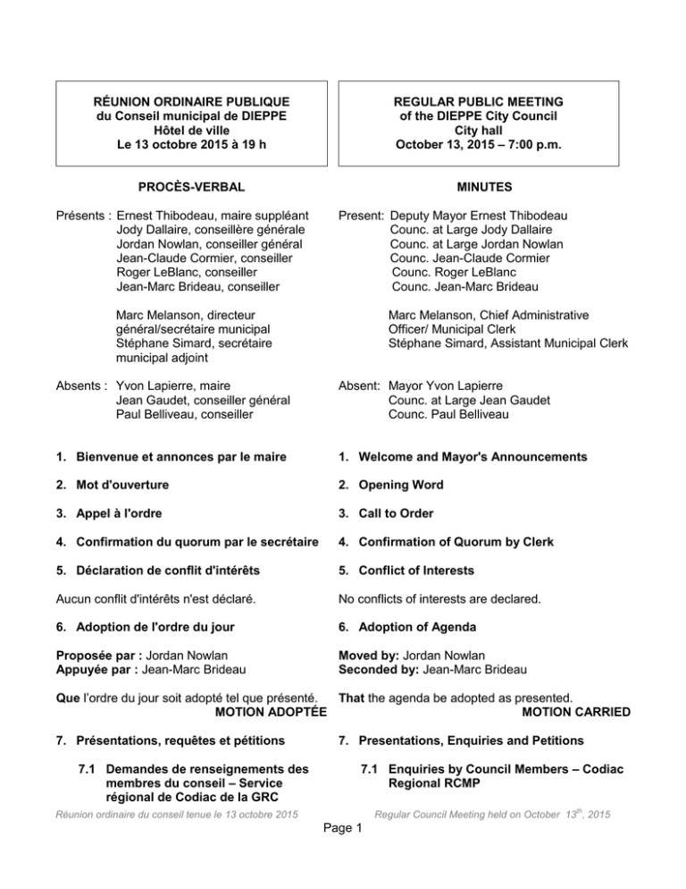 RÉUNION ORDINAIRE PUBLIQUE du Conseil municipal de DIEPPE Hôtel de ville Le 13 octobre 2015 à 19 h REGULAR PUBLIC MEETING of the DIEPPE City Council City hall October 13, 2015 – 7:00 p.m. PROCÈS-VERBAL Présents : Ernest Thibodeau, maire suppléant Jody Dallaire, conseillère générale Jordan Nowlan, conseiller général Jean-Claude Cormier, conseiller Roger LeBlanc, conseiller Jean-Marc Brideau, conseiller MINUTES Present: Deputy Mayor Ernest Thibodeau Counc. at Large Jody Dallaire Counc. at Large Jordan Nowlan Counc. Jean-Claude Cormier Counc. Roger LeBlanc Counc. Jean-Marc Brideau Marc Melanson, directeur général/secrétaire municipal Stéphane Simard, secrétaire municipal adjoint Marc Melanson, Chief Administrative Officer/ Municipal Clerk Stéphane Simard, Assistant Municipal Clerk Absents : Yvon Lapierre, maire Jean Gaudet, conseiller général Paul Belliveau, conseiller Absent: Mayor Yvon Lapierre Counc. at Large Jean Gaudet Counc. Paul Belliveau 1. Bienvenue et annonces par le maire 1. Welcome and Mayor's Announcements 2. Mot d'ouverture 2. Opening Word 3. Appel à l'ordre 3. Call to Order 4. Confirmation du quorum par le secrétaire 4. Confirmation of Quorum by Clerk 5. Déclaration de conflit d'intérêts 5. Conflict of Interests Aucun conflit d'intérêts n'est déclaré. No conflicts of interests are declared. 6. Adoption de l'ordre du jour 6. Adoption of Agenda Proposée par : Jordan Nowlan Appuyée par : Jean-Marc Brideau Moved by: Jordan Nowlan Seconded by: Jean-Marc Brideau Que l’ordre du jour soit adopté tel que présenté. That the agenda be adopted as presented. MOTION ADOPTÉE MOTION CARRIED 7. Présentations, requêtes et pétitions 7.1 Demandes de renseignements des membres du conseil – Service régional de Codiac de la GRC 7. Presentations, Enquiries and Petitions 7.1 Enquiries by Council Members – Codiac Regional RCMP th Réunion ordinaire du conseil tenue le 13 octobre 2015 Regular Council Meeting held on October 13 , 2015 Page 1 7.2 Remise de certificat – Cardinals de Dieppe 7.2 Certificate Award – Dieppe Cardinals Le maire suppléant remet un certificat de mérite aux Cardinals de Dieppe, équipe de baseball mineur ayant remporté le championnat de baseball atlantique Bantam AAA S-15 2015. The Deputy Mayor awards a certificate of merit to the Dieppe Cardinals, minor baseball team who won the 2015 Atlantic U15 Baseball Bantam AAA Championship. 8. Questions du public 8. Questions by Members of the Public 9. Adoption des procès-verbaux 9. Adoption of Minutes 9.1 Réunion ordinaire du conseil tenue le 28 septembre 2015 9.1 Regular Council Meeting Held September 28th, 2015 Proposée par : Jean-Claude Cormier Appuyée par : Jody Dallaire Moved by: Jean-Claude Cormier Seconded by: Jody Dallaire Que le procès-verbal de la réunion ordinaire du That the minutes of the Regular Council Meeting conseil tenue le 28 septembre 2015 soit adopté held on September 28th, 2015, be adopted as tel que présenté. presented. MOTION ADOPTÉE MOTION CARRIED 10. Motions (mémorandums) et nominations 10. Motions (Memorandums) and Nominations 10.1 Administration 10.1 Administration 10.1.1 Bâtiment dangereux – 119, rue Gaspé (NID 70293576) 10.1.1 Dangerous Building – 119 Gaspé St. (PID 70293576) Proposée par: Jean-Marc Brideau Appuyée par: Jordan Nowlan Moved By: Jean-Marc Brideau Seconded By: Jordan Nowlan Que le conseil autorise le personnel désigné et chargé de ce dossier à faire démolir le bâtiment situé au 119, rue Gaspé et portant le NID 70293576 et à entreprendre les mesures nécessaires pour se faire rembourser les coûts de démolition par le propriétaire en vertu des pouvoirs énoncés dans la Loi sur les municipalités. MOTION ADOPTÉE That Council authorizes the designated staff responsible for this matter to have the building located at 119 Gaspé Street and having PID 70293576 demolished and to undertake the necessary steps to be reimbursed the demolition costs by the property owner pursuant to the powers set out in the Municipalities Act. MOTION CARRIED 10.1.2 Nouvelle politique – EXPD-1 – incitatifs financiers envers la densification immobilière Proposée par: Jean-Claude Cormier Appuyée par: Jean-Marc Brideau 10.1.2 New Policy – EXPD-1 – Financial Incentives for Real Estate Densification Moved By: Jean-Claude Cormier Seconded By: Jean-Marc Brideau th Réunion ordinaire du conseil tenue le 13 octobre 2015 Regular Council Meeting held on October 13 , 2015 Page 2 Que le conseil accepte la nouvelle politique That Council accepts the new policy EXPD-1 entitled EXPD-1 intitulée : « Incitatifs financiers envers la “Financial Incentives for Real Estate Densification”. densification immobilière ». MOTION ADOPTÉE MOTION CARRIED 10.2 Performance organisationnelle 10.2 Organizational Performance 10.2.1 Plan stratégique 2016-2020 10.2.1 2016-2020 Strategic Plan Proposée par: Jordan Nowlan Appuyée par: Jody Dallaire Moved By: Jordan Nowlan Seconded By: Jody Dallaire Que le conseil adopte le plan stratégique de la That Council adopts the City of Dieppe Strategic Ville de Dieppe pour la période de 2016 à 2020. Plan for the 2016 to 2020 period. MOTION ADOPTÉE MOTION CARRIED 10.3 Planification et développement 10.3 Planning & Development 10.3.1 Recommandation – CCU – acceptation du plan provisoire – lotissement Rue du Collège Subdivision 10.3.1 Recommendation – PAC – Tentative Plan Acceptance – Rue du Collège Subdivision Proposée par: Jean-Marc Brideau Appuyée par: Jordan Nowlan Moved By: Jean-Marc Brideau Seconded By: Jordan Nowlan Comme recommandé par le Comité consultatif en matière d'urbanisme, que le conseil accepte le plan provisoire du lotissement Rue du Collège Subdivision lequel prévoit le prolongement de la rue du Collège tel qu'identifié sur le plan de lotissement provisoire en date du 31 août 2015. MOTION ADOPTÉE As recommended by the Planning Advisory Committee, that Council accepts t