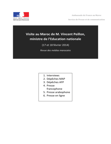 Ambassade de France au Maroc Service de Presse et de communication Visite au Maroc de M. Vincent Peillon, ministre de l’Education nationale (17 et 18 février 2014) Revue des médias marocains 1. 2. 3. 4. Interviews Dépêches MAP Dépêches AFP Presse francophone 5. Presse arabophone 6. Presse en ligne 1. INTERVIEWS A/ Interview presse écrite : L’Economiste, 17 février 2014 B/ Interview radio : Radio Nationale, “l’invité du jour”, 18 février 2014 http://www.chaineinter.ma/detail_invite-peillon.php 2. DEPECHES MAP MAPF [0044] 15/02/2014 11h13 Maroc-France-Education Le ministre français de l'Education nationale entamera lundi une visite de deux jours au Maroc Paris, 15 févr. 2014 (MAP) - Le ministre français de l'Education nationale, M. Vincent Peillon, entamera lundi une visite de deux jours au Maroc, apprend-on auprès de son département. Au cours de ce déplacement, le responsable français prononcera un discours à la Résidence de France, lors d'une réception en présence de partenaires marocains, de la communauté éducative du réseau d'enseignement français et de chefs d'entreprise, précise la même source. M. Peillon visitera également plusieurs établissements scolaires du réseau d'enseignement français à l'étranger, notamment le lycée Regnault à Tanger, le groupe scolaire André Malraux à Rabat et l'école Chénier dans la même ville. Des séquences "micro-tendus" sont prévues lors de chacune de ces visites. La visite d'un établissement marocain concerné par l'expérience des sections bilingues francophones est également prévue. Elle fera l'objet d'une annonce par le ministère marocain de l'Education nationale et de la Formation professionnelle. MAPF [0161] 17/02/2014 18h20 Maroc-France-enseignement-visite (Photo+Audio) MM. Belmokhtar et Peillon visitent des établissements scolaires de Tanger Tanger, 17 févr. 2014 (MAP) - Le ministre de l'Education nationale et de la formation professionnelle, Rachid Belmokhtar et son homologue français Vincent Peillon, ont visité, lundi, des établissements scolaires de la ville du Détroit. Cette visite, effectuée au Lycée Ibn Batouta, annexe du Lycée technique Moulay Youssef, et au Lycée Regnault, relevant de la mission éducative française au Maroc, s'inscrit dans le cadre du renforcement de la coopération éducative entre les deux pays et de la célébration du centenaire du Lycée Regnault et du lancement du Cycle du baccalauréat international au sein du Lycée technique Moulay Youssef. Les deux ministres, accompagnés notamment de l'ambassadeur de France à Rabat, Charles Fries, du directeur de l'Académie régionale d'éducation et de formation, Abdelouahab Benajiba, du délégué de l'Education nationale à Tanger-Assilah, Said Bellout et du directeur de l'Institut français de Tanger, Alexandre Pajon, se sont aussi enquis de la mise en œuvre de la convention de partenariat conclue récemment entre le Lycée technique Moulay Youssef, le Lycée Regnault et l'Institut français de Tanger, avec pour objectif d'accompagner la mise en place des sections internationales du baccalauréat au Maroc. Les ministres ont d'abord effectué une visite au Lycée Ibn Batouta, anciennement appelé Lycée Saint-Aulaire, un établissement créé en 1908 et qui appartenait, avant l'indépendance au système éducatif français. Ce lycée constitue actuellement l'annexe du Lycée technique Moulay Youssef, qui enregistre l'un des plus forts taux de réussite au niveau national. La délégation s'est ensuite rendue au Lycée Regnault, qui a fêté l'année dernière son premier centenaire. Il s'agit du plus ancien établissement de la mission éducative française au Maroc, comptant parmi ses anciens lauréats de nombreuses personnalités éminentes du monde de la politique, de la culture et de l'économie au Maroc et à l'étranger. Dans une déclaration à la presse à cette occasion, M. Peillon a souligné l'importance de cette visite qui témoigne de la qualité de l'amitié franco-marocaine et des relations de coopération qui lient les deux pays, en particulier dans le domaine de l'éducation. « Cette coopération est appelée à se renforcer pour ouvrir aux jeunes générations des perspectives communes, qu'il s'agisse de l'enseignement des langues, notamment la langue française, ou des questions d'orientation scolaire, de formation professionnelle, d'ouverture des sections internationales du baccalauréat et d'évaluation des systèmes éducatifs », a-t-il indiqué. De son côté, M. Belmokhtar a noté que la visite du ministre français de l'Education nationale au Maroc s'inscrit dans le cadre de l'approfondissement des relations bilatérales dans le domaine de l'éducation et de l'enseignement, conformément à la volonté commune de SM le Roi Mohammed VI et du président François Hollande. Il s'agit notamment d'appuyer le lancement du Cycle du baccalauréat international, qui bénéficie de l'accompagnement de la France notamment en matière d'enseignement de la langue française, ainsi que d'examiner les moyens de renforcer la coopération dans le domaine de la formation des professeurs agrégés et de soutenir l'expérience des classes préparatoires aux écoles supérieures, a-t-il précisé. Le Cycle du baccalauréat international a été lancé cette année au niveau de six centres à Tanger, Meknès, Casablanca, El Jadida, Marrakech et Agadir. Le Lycée techniques Moulay Youssef compte, au niveau de son annexe le Lycée Ibn Batouta, trois classes de ce cycle, deux scientifiques et une littéraire, totalisant 72 élèves. MAPF [0208] 17/02/2014 23h30 Maroc-France-éducation-visite Rabat et Paris déterminés à renforcer leur coopération dans le domaine de l'éducation (M. Peillon) Rabat, 17 févr. 2014 (MAP) - La France et le Maroc sont déterminés à renforcer davantage leur coopération bilatérale dans le domaine de l'éducation, a affirmé, lundi soir à Rabat, le ministre français de