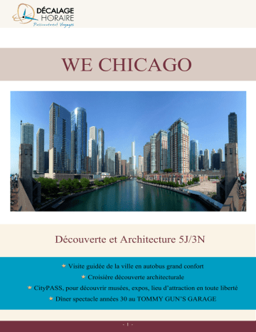 WE CHICAGO Découverte et Architecture 5J/3N Visite guidée de la ville en autobus grand confort Croisière découverte architecturale CityPASS, pour découvrir musées, expos, lieu d’attraction en toute liberté Dîner spectacle années 30 au TOMMY GUN’S GARAGE - 1 - TARIFS ET CONDITIONS DESTINATION W.E. CHICAGO TYPE DE VOYAGE 5 jours - 3 nuits ; Départ : PARIS ; Retour : PARIS PRIX FORFAITAIRE par personne A partir de ..................................................................................... 1.260 € CES PRIX COMPRENNENT : Les vols PARIS/CHICAGO/PARIS Deux transferts aéroport/hôtel/aéroport assistés Les services d’un autobus de luxe climatisé durant les visites Les services de notre guide francophone durant les deux transferts Le logement sur la base d’une occupation double en hôtel de 1ère catégorie : Essex inn Park centre-ville (3) 3 petits déjeuners américains de luxe Le tour de ville de Chicago de 4 heures La croisière à thème architectural Le CHICAGO City PASS Soirée restaurant théatre au Tommy gun’s garage Les taxes et le service dans les hôtels et les restaurants Les taxes locales sur les services inclus dans le prix Les assurances annulations, bagages, rapatriement. CES PRIX NE COMPRENNENT PAS : Les boissons en dehors des repas prévus au programme. Les déjeuners et dîner non prévus au programme. Le supplément en chambre individuelle : en nombre limité et selon disponibilité. Les pourboires des guides et du chauffeur. (nous suggérons $ 3 par pax par jour au guide et $ 2 par pax par jour au chauffeur) Les dépenses personnelles. (1) Nos prix ont été calculés suivant les dates et les conditions économiques connues au 21/03/2012. Ils sont susceptibles de varier en fonction des fluctuations monétaires internationales, des hausses du coût du baril de pétrole et des changements dans la tarification aérienne. FORMALITÉS pour les ressortissants français : Passeport valable 6 mois après la date du retour et visa obtenu à l’arrivée - 2 - W.E. CHICAGO 5J/3N FORMALITÉS pour les ressortissants français : Sur les traces d’Al Capone et d’Elliot Ness, une des villes les plus impressionnantes du monde s’offre à vous entre Skyline et lac du Michigan. Hétéroclite, majestueuses, curieuse, la mégapole est également un centre majeur des arts et sciences. Cité majeure de l’Amérique dotée d’une personnalité particulière, reconnue parmi les plus agréables et digne d’intérêt d’Amérique. En particulier en matière d’architecture dont elle demeure un fleuron de modernité. Les bons restaurants, les rythmes du jazz et du blues agrémenteront cet étonnant week-end ! Visites & Excursions Visite guidée de CHICAGO en autobus de luxe climatisé Croisière à thème Architectural sur la rivière CHICAGO Visite libre incluse des musées et monuments de votre choix via le Chicago City Pass Repas spéciaux Petit déjeuner américain en version luxe ! Dîner spectacle TOMMY GUN’S GARAGE - 3 - WEEK END CHICAGO 5J/3N 1er jour: PARIS / CHICAGO Rendez-vous à l’aéroport de PARIS ROISSY CDG avec notre représentant DÉCALAGE HORAIRE Assistance aux formalités d’enregistrement. Envol pour CHICAGO sur vol régulier AIR FRANCE (Nuit et toutes prestations à bord) Repas servis à bord. Accueil par votre guide à l´arrivée, transfert et installation à l´hôtel. Dîner libre et logement à l´hôtel. Chicago se trouve dans la partie nord des états du mid-west des États-Unis, à 1280 km à l'ouest de New York et à plus de 3200 km au nord-est d’Angeles, Californie. Elle est habituellement considérée comme la troisième métropole des États-Unis après ses villes sœurs New York sur la côte est et Los Angeles sur la côte ouest. La ville se trouve sur le bord ouest du lac Michigan, un des cinq lacs intérieurs connus sous le nom commun de Grands Lacs (Great Lakes). Le centre-ville de Chicago s'étend le long de la côte du lac Michigan du nord au sud sur approximativement 8 kilomètres. Il offre un panorama impressionnant de gratte-ciel, parmi lesquels la tour Sears de 110 étages. Vers le nord, le sud et l'ouest, une grande étendue de bâtiments de bureaux, de sites industriels et de quartiers résidentiels s'étalent le long de la côte et vers les plaines sur au moins 50 km. A l'est, le joli parc au bord du lac embrasse le bord du lac Michigan. 2nd jour : CHICAGO Petit déjeuner américain. Départ pour la visite guidée de Chicago, berceau de l´architecture moderne et aujourd´hui 3ème ville des Etats-Unis. Vous découvrirez le « Loop » et son architecture qui allie à la fois le passé et le présent, La statue géante de Marilyn Monroe, Hyde Park où se situe l´Université de Chicago, la Old Town et la prestigieuse Michigan Avenue ... Déjeuner libre au NAVY PIER (taxes prépayées) - 4 - Croisière à THEME ARCHITECTURAL. Cette croisière d’une heure vous entraînera à la découverte de l’architecture unique de Chicago et vous offrira une vue extraordinaire de ses nombreux buildings. Véritable musée d'architecture à ciel ouvert, Chicago est sans conteste une des plus fascinantes destinations culturelles des États-Unis. Vous découvrirez son étonnant paysage urbain en croisière sur la Rivière Chicago Dîner libre et logement à l´hôtel. 3ème jour : CHICAGO Petit déjeuner américain. Journée libre pour découvrir à votre gré les quartiers aux alentours et découvrir les diverses attractions que vous propose la ville. Déjeuner libre. Profitez du Chicago CityPASS: Programme qui inclut des entrées pour les attractions les plus populaires de Chicago. C’est un programme économique et qui vous évitera les files d’attente ! Vous n`avez qu`a présenter vos tickets au comptoir et…apprécier votre visite! C`est la meilleure façon d'économiser du temps et de l'argent ! Chaque carnet de billets contient de nombreuses informations utiles telles que les horaires d'ouverture, des informatio