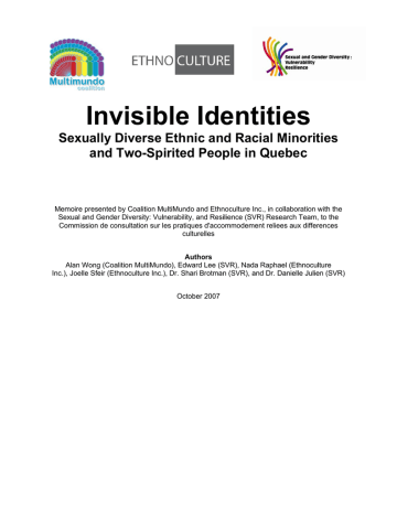 Invisible Identities Sexually Diverse Ethnic and Racial Minorities and Two-Spirited People in Quebec Memoire presented by Coalition MultiMundo and Ethnoculture Inc., in collaboration with the Sexual and Gender Diversity: Vulnerability, and Resilience (SVR) Research Team, to the Commission de consultation sur les pratiques d'accommodement reliees aux differences culturelles Authors Alan Wong (Coalition MultiMundo), Edward Lee (SVR), Nada Raphael (Ethnoculture Inc.), Joelle Sfeir (Ethnoculture Inc.), Dr. Shari Brotman (SVR), and Dr. Danielle Julien (SVR) October 2007 2 Table of Contents Page 3............................................Descriptions of Presenters 4............................................Objectives 4............................................Guiding Principles for Our Discussion 5............................................Introduction 5............................................Invisible Identities 9............................................Recommendations 11..........................................Works Cited 3 Descriptions of Presenters Coalition MultiMundo (http://ca.groups.yahoo.com/group/Coalition-MultiMundo) La Coalition MultiMundo regroupe des organismes communautaires et des membres individuels de Montréal, qui travaillent avec une clientèle LGBTQ appartenant à des communautés ethnoculturelles ou autochtones. La coalition a adopté trois objectifs généraux : • Favoriser la visibilité des membres LGBTQ des communautés ethnoculturelles et autochtones; • Favoriser une synergie entre les groupes et organismes, LGTBQ et autres, membres de la coalition; • Lutter contre l’homophobie et le racisme. Member organizations include: Gay and Lesbian Asians of Montreal, Helem, Zaffiron, Ebony Perspectives of Montreal, Arc-en-ciel Afrique, Association des etres bi-spirituelles, Feygelah, Hola, GRIS, Gay Line, Jeunesse Lambda, Coalition jeunesse montréalaise de lutte a l’homophobie, Coalition des transsexuel(le)s et transexué(e)s du Québec, Lesbian Mothers Association, Alterheros, Aids Community Care Montreal, Project 10, and Sero-Zero. Ethnoculture Inc. (http://www.ethnoculture.org) La mission est d'organiser des événements participant a la visibilité des personnes LGB3T des communautés culturelles et a la défense de leurs droits au sein de la société en général et des communautés culturelles plus particulièrement en favorisant les rapprochements entre les membres de ces communautés. Les objectifs de la compagnie Ethnoculture Inc. sont les suivants: • Lutter contre les discriminations multiples. • Offrir des espaces de rencontre et d'échange avec les communautés ethnoculturelles a toutes celles et ceux qui travaillent dans le domaine de l'immigration pour leur permettre d'en appréhender les différents bagages culturels en matière d'orientation sexuelle et d'identité de genre. • Développer chez les Québécois(es) la connaissances et la compréhension de la réalité pluraliste de leur société. • Sensibiliser la communauté LGB3T en général en lui permettant de prendre conscience de l'existence d'autres communautés LGB3T avec des réalités différentes. • Favoriser l'intégration des LGB3T issus des différentes communautés culturelles dans la société en général. • Aider les groupes ethnoculturels LGB3T à s'affirmer dans leurs communautés respectives. • Favoriser la discussion et les échanges entre les différents groupes ethnoculturels autour de leurs réalités communes et de leurs différences. Sexual and Gender Diversity: (http://www.hvr.uqam.ca) Vulnerability, and Resilience Research Team (SVR) The SVR research team is an interdisciplinary team consisting of 14 Canadian experts in social and human sciences working on health issues pertinent to sexual and gender diversity and multiple oppressions. The team is funded by the Canadian Institutes of Health research and le Fond de recherche sur la société et la culture-Quebec. The team’s objectives include: • • • • To examine the issues, challenges and realities facing people and communities including quality of life, physical and mental health across the lifespan with a particular emphasis on: o The impact of “coming out” on various health processes and outcomes. o The modalities of multiple oppressions in peoples’ experiences and their impact on health. To examine health and social services and organizational programs and practices. To build an infrastructure based upon knowledge exchange between universities, academic disciplines and communities that has a positive impact upon health and social services, health and well-being, research capacity building and social change in Canada. Each team member contributes to the research program, which consists of a series of studies spanning nine Canadian universities situated in 5 provinces. 4 Objectives Our objectives in participating in these public consultation hearings on accommodation practices pertaining to cultural differences are as follows: • To draw attention to our experiences as individuals who identify simultaneously as gender and sexual minorities AND ethnocultural and racial minorities and indigenous persons. • To shed light on the challenges that we, as multiply-oppressed individuals and communities face, in our daily lives. • To raise awareness about some of the effects that the accommodation debate has had on our existence in and contribution to Quebec society. • To recommend integrative and adaptive solutions that proactively address these concerns in order to create a safer, more welcoming environment in Quebec for members of our communities. Guiding Principles for Our Discussion The following guiding principles are critical to understanding the complexity of the issues and recommendations presented in our text. These points are vital to the Commission's contemplation and comprehension of our perspective. • • • • No identity or community is static. Culture is fl