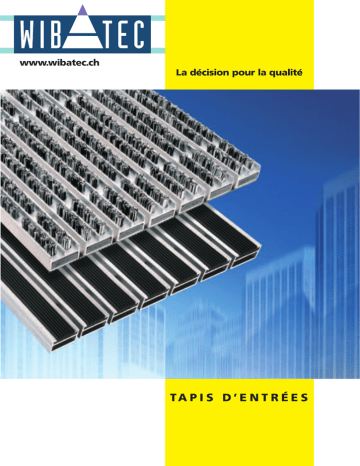 www.wibatec.ch La décision pour la qualité TA P I S D ’ E N T R É E S 2 Un design et une fonctionnalité La zone d’entrée est considérée par de nombreux architectes et maîtres d’ouvrage comme étant l’image représentative d’un bâtiment. Avec les tapis d’entrée modernes et de grande qualité WIBATEC, vous pouvez ajouter une touche créative. Des tapis d’entrée fonctionnels permettent en outre de réduire sensiblement les frais de nettoyage, les sols sont moins abîmés et leur durée de vie est considérablement allongée. Le principe de fonctionnement WIBATEC : Effet de brossage par le mouvement de marche Enrouler Simplement aspirer 3 Voici ce que vous devez savoir : Système de liaison stable et durable Le système de liaison que nous utilisons pour nos tapis de profils alu, de hauteur 17 et 24 mm, est constitué des câbles métalliques plastifiés particulièrement solides (3/5mm). Cela garantit des tapis qui gardent leurs dimensions même après de nombreux enroulement et une très longue durée de vie. Haute qualité des brosses Tous les poils de brosserie des tapis brosses WIBATEC sont réalisés en polyamide de qualité 6.6. Cela garantit une très haute résistance contre l’usure et donne aux poils la faculté de se redresser. La fonction est ainsi parfaitement assurée pour de nombreuses années. Absorption du bruit des pas Des bandes en caoutchouc disposées sur le dos nos tapis de profils alu amortissent le bruit et les rendent antidérapant. 4 Voici ce que vous devez savoir : Une exécution renforcée pour des conditions extrêmes est également livrable. Une grande partie de nos tapis de profils alu peuvent être réalisés sur demande en exécution renforcée pour des conditions extrêmes. (Illustration ci-dessous) Pour ce faire, le profil creux en aluminium est complètement rempli par un noyau en plastique dur. La stabilité du tapis d’entrée en est fortement augmentée. Notre tapis haut de gamme, Hagomat Exklusiv, est déjà livré en exécution renforcée en version standard. Résistance au feu Des instituts réputés ont contrôlé la plupart de nos tapis d’entrée afin de vérifier leur résistance au feu et les ont classés Bfl-s1 ou Cfl-s1, selon EN 11925-2 et EN 9239-1. Les deux classements (Bfl-s1 et Cfl-s1) correspondent à classification BKZ 5.3. Vous trouverez les classements exacts dans les descriptions de produit ci-dessous. Fabriqué sur mesure sans barres de compensation Les tapis d’entrée Hagomat sont fabriqués sur mesure, selon vos souhaits. Notre système de liaison permet une fabrication précise aussi bien en longueur du profil qu’en profondeur de passage. (Image du dos) En règle générale, WIBATEC peut donc renoncer aux barres de compensation inesthétiques (profils de rive). (Image du dessus) 5 Hagomat Combistrip Brush avec barre à brosse Mondial zone d’extérieur d’une entrée d’hôpital. Une architecture de qualité avec un tapis d'entrée WIBATEC comme un élément fonctionnel et esthétique. Hagomat Exklusiv dans l’entrée de la Direction générale d’un groupe énergétique. 6 Cadre Cadre en alu No d'art. 18 000 Cadre en alu stable avec équerres de liaison embouties sur une face. En dimension spéciale le cadre est livré démonté. Dimensions normalisées voir liste des prix. Toutes les dimensions et formes sont possibles. Largeur visible 7 mm. La profondeur d’encastrement a 7 mm de plus qu la hauteur intérieure. No d'art. 18 000 18 000 18 000 18 000 HSA HSA HSA HSA Type Cadre A Cadre B Cadre C Cadre D 25/25/3 20/20/3 15/15/2 12/22/2 Hauteur intérieure 23 mm 20 mm 17 mm 12 mm 22 mm 17 mm 13 mm 10 mm Profondeur d’encastrement 30 mm 27 mm 24 mm 19 mm 25 mm 20 mm 15 mm 12 mm Cadre en acier inoxydable No d'art. 18 400 Cadre en acier inoxydable de haute qualité. Equerres de liaison vissées. Largeur visible 3 mm. La profondeur d’encastrement a 3 mm de plus qu la hauteur intérieure. No d'art. HSE HSE HSE HSE Type 25/25/3 20/20/3 15/15/2 12/22/2 Hauteur intérieure 22 mm 17 mm 13 mm 10 mm Profondeur d’encastrement 25 mm 20 mm 15 mm 12 mm Profil incliné No d'art. 19 100 Pour la pose ultérieure de tapis, si un cadre à fleur de sol ne peut plus être installé. Vous trouverez au verso de cette brochure des détails importants pour la pose des cadres. Type Cadre A Cadre B Cadre C Hauteur intérieure 22 mm 18 mm 11 mm Cuve alu No d'art. 19 300 Cuve de récupération de la saleté avec cadre alu riveté (hauteur intérieure du cadre 23 mm). Profondeur d’encastrement totale 57 mm. Diamètre du trou d’évacuation d’eau 45 mm. No d'art. HSWA Cuve de récupération de la saleté avec cadre alu riveté (hauteur intérieure du cadre 22 mm). Profondeur d’encastrement totale 25 mm. Diamètre du trou d’évacuation d’eau 45 mm, sur demande avec manchon. Différentes formes et hauteurs des cuves sont possibles. Cuve acier inoxydable No d'art. HSWE Cuve de récupération de la saleté avec cadre alu riveté (hauteur intérieure du cadre 22 mm). Profondeur d’encastrement totale 25 mm. Diamètre du trou d’évacuation de l’eau 45 mm, sur demande avec du trou d'évacuation d'eau. sur demande avec manchon. Différentes formes et hauteurs des cuves sont possibles. 7 HAGOMAT Exklusiv 24 HAGOMAT Exklusiv 24 avec barre gratte-neige Couleurs disponibles : 12 brun 18 jaune 14 rouge Hauteur du tapis env. Hauteur Intérieure du Cadre prévu (voir page 7) Hagomat Exklusiv 24 Écartement entre barres 5 mm 24 mm 23 mm 10 110 Hagomat Exklusiv 24 Écartement entre barres 10 mm 24 mm 23 mm 10 102 Hagomat Exklusiv 24 avec barre gratte-neige 24 mm 23 mm No d'art. Désignation de l’article 10 100 13 vert 15 bleu 11 gris clair 17 noir 8 Hagomat Exklusiv en version standard est déjà livré avec profil renforcé (avec noyau en plastique dur). Exklusiv 24 Recommandation : Pour des entrées représentatives avec grand passage de clients. Très longue durée de vie. Fonction garantie 5 ans ! Matérial : Profi