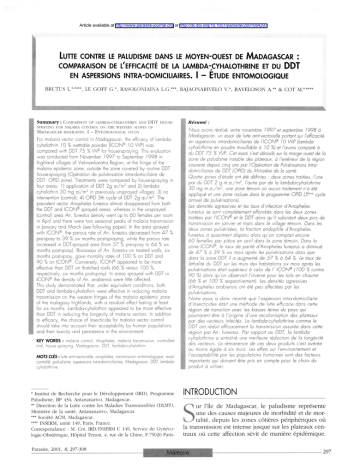 Article available at http://www.parasite-journal.org or http://dx.doi.org/10.1051/parasite/2001084297 LUTTE CONTRE LE PALUDISME DANS LE MOYEN-OUEST DE MADAGASCAR : COMPARAISON DE L'EFFICACITÉ DE LA LAMBDA-CYHALOTHRINE ET DU D D T EN ASPERSIONS INTRA-DOMICILIAIRES. I - ÉTUDE ENTOMOLOGIQUE BRUTUS L.*****, LE GOFF G.*, RASOLONIAINA L.G.***, RAJAONARIVELO V.*, RAVELOSON A.** & COT M.***** S u m m a r y : COMPARISON OF LAMBDA-CYHALOTHRIN AND DDT HOUSESPRAYING FOR MALARIA CONTROL ON THE WESTERN SLOPES OF MADAGASCAR HIGHLANDS. I - ENTOMOLOGICAL STUDY For malaria vector control in Madagascar, the efficacy of lambdacyhalothrin 10 % wettable powder ( I C O N 10 WP) was compared with DDT 7 5 % W P for house-spraying. This evaluation was conducted from November 1 9 9 7 to September 1 9 9 8 in highland villages of Vakinankaratra Region, at the fringe of the malaria epidemic zone, outside the zone covered by routine DDT house-spraying (Operation de pulvérisation intra-domiciliaire de DDT: OPID zone). Treatments were compared by house-spraying in four areas : 1) application of DDT 2 g a i / m and 2) lambdacyhalothrin 3 0 mg a i / m in previously unsprayed villages; 3) no intervention (control); 4) OPID 5th cycle of DDT 2 g a i / m . The prevalent vector Anopheles funestus almost disappeared from both the DDT and ICON sprayed areas, whereas in the unsprayed (control) area An. funestus density went up to 6 0 females per room in April and there were two seasonal peaks of malaria transmission in January and March (see following paper). In the area sprayed with ICON , the parous rate of An. funestus decreased from 4 7 % pre-spray to 3 9 % six months post-spraying, while the parous rate increased in DDT-sprayed area (from 5 7 % pre-spray to 6 4 % six months post-spray). Bioassays of An. funestus on treated walls, six months post-spray, gave mortality rates of 1 0 0 % on DDT and 9 0 % on I C O N . Conversely, I C O N appeared to be more effective than DDT on thatched roofs (66 % versus 1 0 0 %, respectively, six months post-spray). In areas sprayed with DDT or ICON® the density of An. arabiensis were little affected. This study demonstrated that, under equivalent conditions, both DDT and lambda-cyhalothrin were effective in reducing malaria transmission on the western fringes of the malaria epidemic zone of the malagasy highlands, with a residual effect lasting at least for six months. Lambda-cyhalothrin appeared to be more effective than DDT in reducing the longevity of malatia vectors. In addition to efficacy, the choice of insecticide for malaria vector control should take into account their acceptability by human populations and their toxicity and persistence in the environment. ® 2 2 2 ® ® ® ® KEY WORDS : malaria control, Anopheles, malaria transmission, controlled trial, house spraying, Madagascar, DDT, lambda-cyhalothrin, MOTS CLÉS: lutte anti-vectorielle, anophèles, transmission entomologique, essai contrôlé, paludisme, aspersions intra-domiciliaires, Madagascar, DDT, lambdacyhalothrine. * Institut de Recherche pour le Développement (IRD), Programme Paludisme. BP 434, Antananarivo, Madagascar. ** Direction de la Lutte contre les Maladies Transmissibles (DLMT). Ministere de la sante, Antananarivo. Madagascar. *** Société ACM, Madagascar. **** INSERM. unité 149, Paris, France. Correspondance : M. Cot. IRD/ INSERM U 149, Service de Gynécologie-Obstétrique, Hôpital Tenon, 4. rue de la Chine, F-75020 Paris. Parasite, 2001, 8, 297-308 Resume : Nous avons realise, entre novembre 1997 et septembre 1998 a Madagascar, un essai de Iutte anti-vectorielle portant sur I'efficacite en aspersions intra-domiciliaires de I'ICON 10 WP (lambdacyhalothrine en poudre mouillable a 10 %) et I'avons comparé a du DDT 75 % WP. Cet essai s'est déroulé sur la marge ouest de la zone de paludisme instable des plateaux, a I'extérieur de la region couverte depuis cinq ans par I'Opération de Pulverisations Intradomiciliaires de DDT (OPID) du Ministère de la santé. Quatre zones d'étude ont été définies : deux zones traitées, I'une par du DDT 2 g m.a./m , I'autre par de la lambda-cyhalothrine 30 mg m.a./m , une zone témoin ou aucun traitement n'a été applique et une zone incluse dans le programme OPID (5 cycle annuel de pulvérisations). ® 2 2 ème Les densités agressives et les taux d'infection d'Anopheles funestus se sont complètement effondres dans les deux zones traitees par I'ICON et le DDT alors qu'il subsistait deux pics de transmission en janvier et mars dans le village temoin. Dans les deux zones pulvérisées, la fraction endophile d'Anopheles funestus a quasiment disparu alors qu'on comptait encore 60 femelles par pièce en avril dans la zone témoin. Dans la zone ICON , le taux de parite d'Anopheles funestus a diminué de 47 % à 39 % six mois après les pulvérisations alors que dans la zone DDT il a augmenté de 57 % a 64 %. Le taux de léthalité du DDT sur les murs des habitations six mois après les pulverisations était supérieur a celui de I' ICON ( 1 0 0 % contre 90 %) alors qu'on observait I'inverse pour les toits en chaume (66 % et 100 % respectivement). Les densites agressives d'Anopheles arabiensis ont ete peu affectées par les pulvérisations. ® ® ® Notre essai a donc montré que I'aspersion intra-domiciliaire d'insecticides était une méthode de Iutte efficace dans cette region de transition avec les basses terres du pays qui pourraient être a I'origine d'une recolonisation des plateaux par des vecteurs infectés. La lambda-cyhalothrine comme le DDT ont réduit efficacement la transmission assurée dans cette region par An. funestus. Par rapport au DDT, la lambdacyhalothrine a entraîne une meilleure réduction de la longévité des vecteurs. La rémanence de ces deux produits s'est avérée au moins égale a six mois. Les effets sur I'environnement et I'acceptabilité par les populations humaines sont des facteurs importants qui doivent être pris en compte pour le 