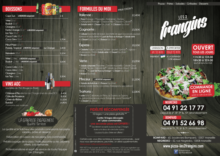Pizzas - Pâtes - Salades - Grillades - Desserts FORMULES DU MIDI BOISSONS Capri Sun Italienne : 1€ à NEGRESKO uniquement IX !! MAXI CHO 12,40 € + Pizza (Fromage • Mozzarella • Arménienne • Anchois • Vittel 50 cl * Champignons / Fromage • Chausson Frita • Chausson Calzone*) Badoit 33 cl * + Salade verte + 1 Dessert (au choix) * + 1 Boisson (au choix) * Orangina 33 cl * Gagnant e : 15,50 € Fanta Orange 33 cl * à NEGRESKO uniquement Ice Tea 33 cl * + Grillade (brochette de boeuf , brochette de gigot, boconccini, saucisse Coca Cola 33 cl * italienne et andouillette) + 1 part de Pizza au fromage + Salade verte + 1 Dessert (au choix) *+ 1 Boisson (au choix) * Coca Zéro 33 cl * 1,70 € Minut Maid 33 cl * Pomme, Tropical à NEGRESKO uniquement ou Orange Heinekein 33 cl * Express : 10,10 € * + Omelette (nature • pommes de terre • gruyère • jambon • oignons • champignons • Frita) + Salade verte + 1 Dessert (au choix) * + Boisson (au choix) * 1,80 € 2,10 € Vittel 1,5 litre à NEGRESKO uniquement Badoit 1,5 litre à NEGRESKO uniquement Vert e : 3,00 € 13,20 € OUVERT LIVRAISON À EMPORTER en 30 min sous 15 min TOUS LES JOURS A LA DEMANDE (15€ minimum) 11 h 30 à 13 h 30 18 h 30 à 22 h 30 PAIEMENT Sauf dimanche midi + Salade composée (Paysanne • Tomates mozzarella • Salade César Coca Cola 1,5 litre Coca Zéro 1,5 litre Orangina 1,5 litre Ice Tea 1,5 litre • Salade Niçoise • Grenobloise*• Salade au chèvre chaud • Salade fraîcheur*) + 1 part de Pizza au fromage + 1 Dessert (au choix) * + Boisson (au choix) * 3,50 € Minceur : VINS AOC à NEGRESKO uniquement 11,10 € + Salade de fruits frais + 1 Boisson (au choix) * Trattoria : Côteaux-d’Aix sélection Les 2 Frangins (rosé de culture BIO) 8,40 € Côte-de-Provence 8,90 € Côtes-du-Rhône 12,10 € Bandol 14,90 € La qualité et la fraîcheur des produits composants nos pizzas, salades, pâtes et desserts Fabrication et cuisson de nos pizzas, à la commande, arrêt à 13h15 et 22h + pâte (à la Carbonara, au Pistou, au Saumon, au Supions, au Jambon/mascarpone, sauce Bolognaise, sauce Forestière) * + 1 Dessert (au choix) * Ne pas jeter sur la voie publique. Merci ! Qualite /Services EN LIGNE 12,00 € A consommer avec modération LA GARANTIE ENGAGEMENT COMMANDE (salade, tomate fraîche, concombre, champignons, oeuf, jambon) bouteilles de 75cl (Rouge ou Rosé) FIDÉLITÉ RÉCOMPENSÉE 10 logos = une pizza gratuite ** Contre 10 logos découpés et 1 pizza commandée, une seconde pizza est OFFERTE ! ** Seul élément accepté, la pizza du logo 2 Frangins située sur le dessus de votre boîte à pizza. NEGRESKO 04 91 22 17 77 Depuis le 6e, 8e, 9e & 10e arrondissement BOMPARD 04 91 52 66 98 Depuis le 1er, 2e, 6e & 7e arrondissement La pizza la plus chère est offerte ! Prédécoupage de la pizza, l’huile piquante ou les couverts offerts, à la demande, Certains soirs, vous êtes nombreux à passer commande... aussi nous vous demanderons, peut-être, un délai supplémentaire. Merci pour votre compréhension. Professionnalisme et esprit de service de toute l’équipe Les 2 Frangins. PRIX NETS livré (à partir de 8,50 €) ou à emporter. 1,50 € par ingrédient supplémentaire - Tickets restaurant acceptés. Par mesure de sécurité, nos coursiers n’ont jamais plus de 30 € sur eux… MERCI de préparer l’appoint. BOMPARD - 60, boulevard Bompard, 13007 Marseille NEGRESKO - 52, rue Negresko, 13008 Marseille www.pizza-les2frangins.com Suivez-nous sur Facebook PIZZAS TRADITIONNELLES PIZZAS AUTHENTIQUES PÂTES Anchois (sauce tomate, anchois) 9,00 € Anglaise* (tomate, lardons, mozzarella, œuf) Italienne (tomate, oignons, mozzarella, anchois) Portugaise (tomate, thon, gruyère, œuf) 12,60 € Pistou Bolognaise 9,00 € Provençale (tomates & basilic frais, mozzarella) 13,00 € Carbonara* Saumon Supions 9,10 € Jambon/mascarpone* Forestière 9,40 € Anchois / Fromage Fromage (sauce tomate, gruyère) 9,30 € Spéciale Anchois (sauce tomate, anchois, persillade) 9,50 € Oignons (sauce tomate, oignons) Mozzarella (sauce tomate, mozzarella) Jambon/Fromage* (sauce tomate, jambon, gruyère) Champignons/Fromage (sauce tomate, champignons, gruyère) Marguerite (anchois, mozzarella) 11,60 € Jambon/mozzarella* (sauce tomate, jambon, mozzarella) Champignons/mozzarella (sauce tomate, champignons, mozzarella) Chèvre (sauce tomate, mozzarella, chèvre) 11,80 € Royale* (tomate, mozzarella, jambon, champignons, gruyère) Supions 3 Fromages (gruyère, mozzarella, chèvre) 13,00 € Normande (tomate, gruyère, camembert) 4 Fromages (gruyère, mozzarella, chèvre, roquefort) 13,40 € 13,80 € 12,60 € 13,30 € 13,50 € Luxembourgeoise* (crème fraîche, lardons, champignons, oignons, gruyère) Française* (crème fraîche, jambon, champignons, gruyère, mozzarella) Reblochonne* (lardons, pommes de terre, crème, reblochon, mozzarella) Forestière (crème, poulet, champignons, oignons, gruyère) Bergère (mozzarella, thon, chèvre, crème) 13,80 € Danoise (crème, pommes de terre, saumon fumé, oignons, fromage) Rustique* (crème, lardons, oignons, mozzarella, camembert) Lorraine* (crème fraîche, oignons, lardons, chèvre, mozzarella) Suédoise (saumon fumé, champignons, mozzarella, crème) 14,00 € Troyenne (crème, andouillette, moutarde, oignons) Périgourdine (crème, magret fumé, miel , noix, fromage) PIZZAS DU BOUCHER Figatelli * (tomate, mozzarella, figatelli) Chorizo* (tomate, chorizo, mozzarella) Corsica *(tomate, figatelli, brousse, mozzarella) Espagnole * (frita, chorizo, mozzarella) Sicilienne * (tomate, mozzarella, saucisse italienne) 12,20 € 12,30 € 12,50 € 12,60 € 12,80 € Arménienne (tomate, viande hachée, poivron, oignons, persil, menthe) Orientale (kebab, frita , mozzarella) Arizona* (tomate, mozzarella, merguez, chorizo) 13,00 € CHAUSSONS PIZZAS BLANCHES Hollandaise (crème, édam, mimolette, mozzarella) Kebab (crème, kebab, oignons, tomates f
